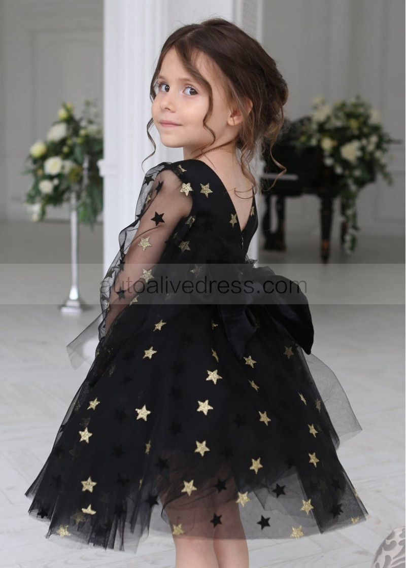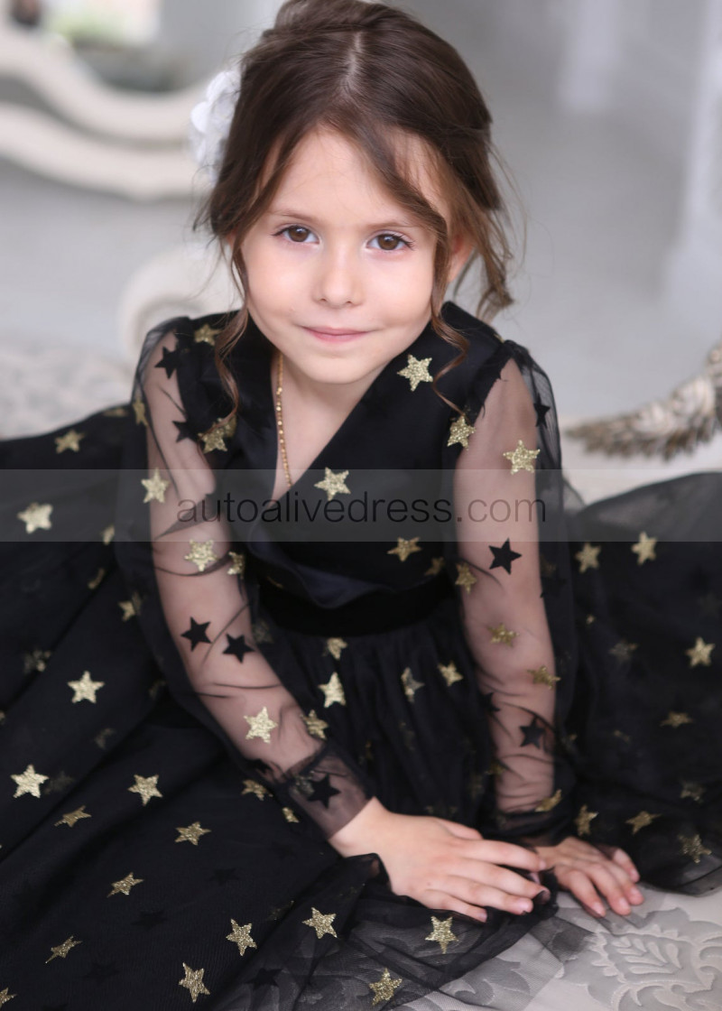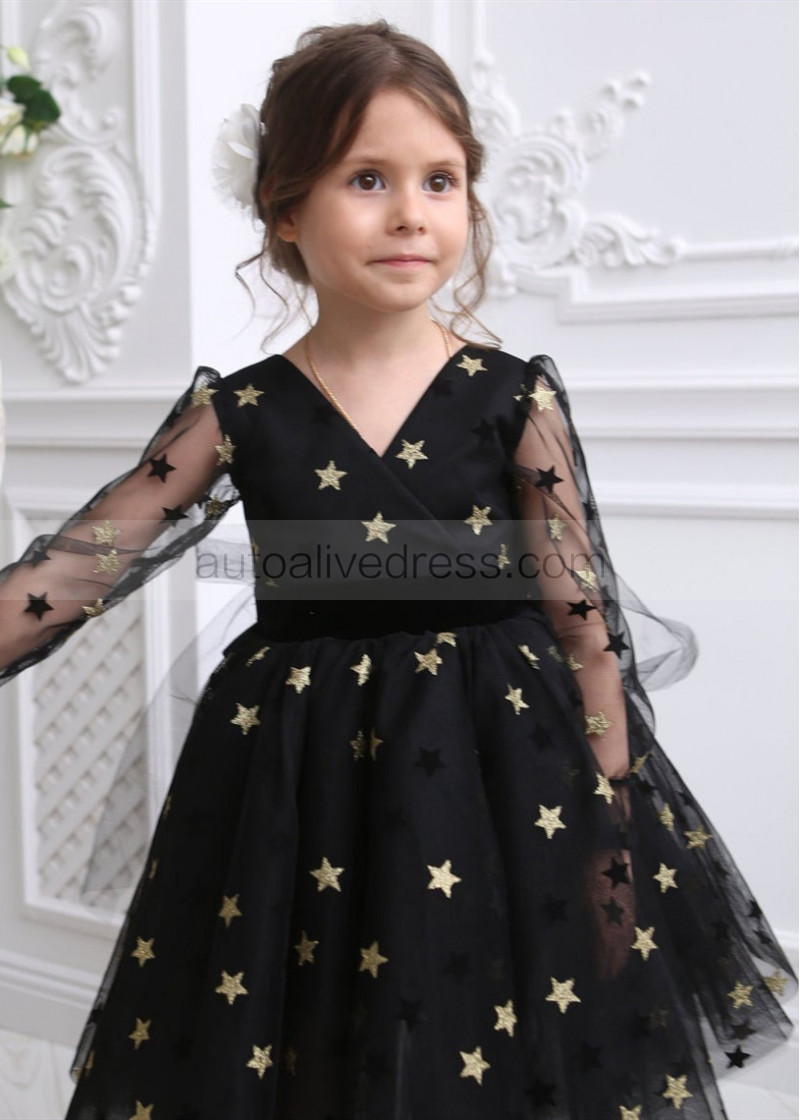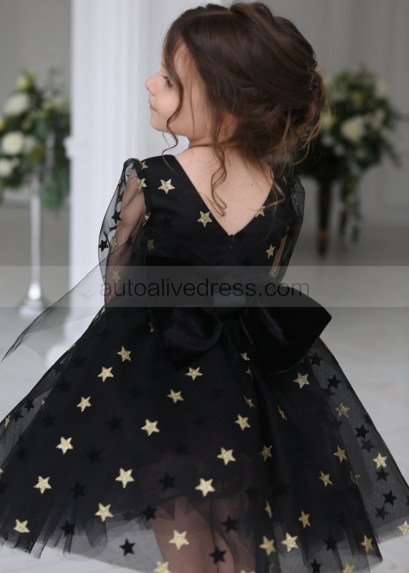 Long Sleeves Black Gold Star Tulle V Back Wedding Flower Girl Dress