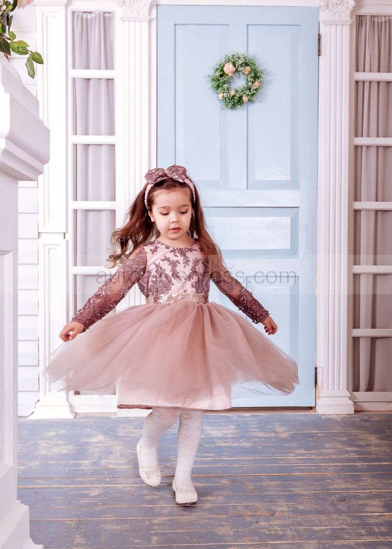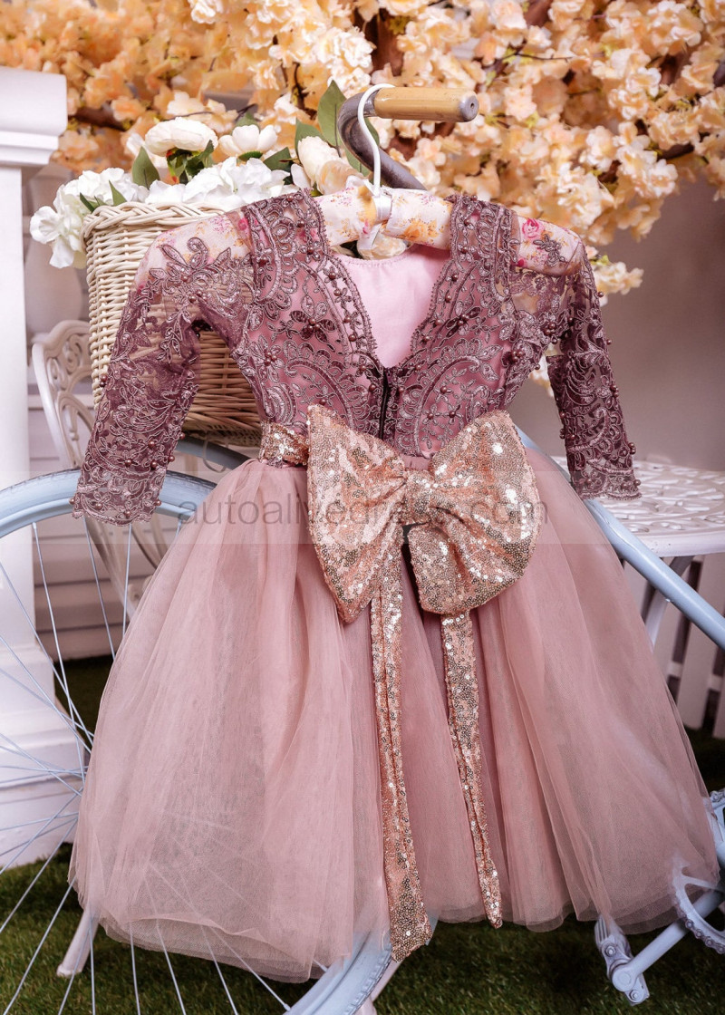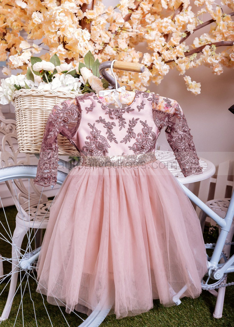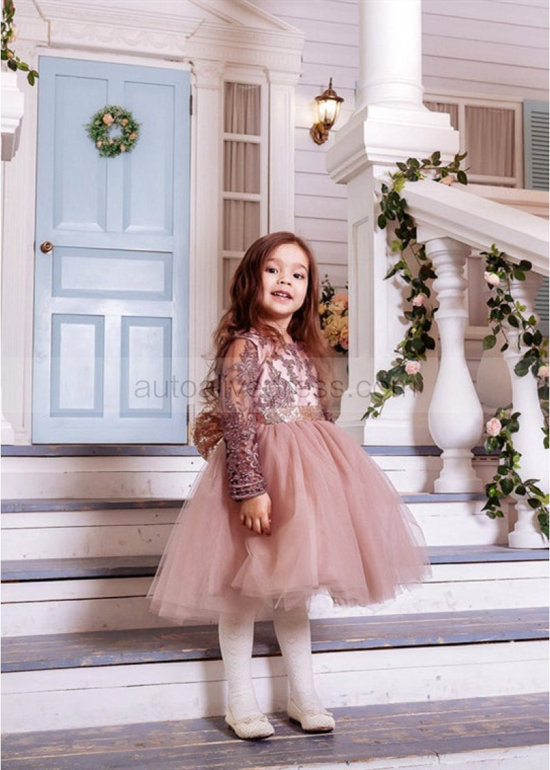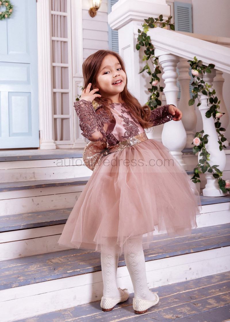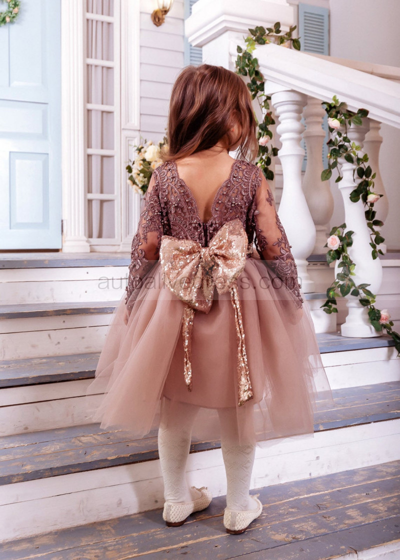 Long Sleeves Cocoa Lace Tulle Beaded Flower Girl Dress