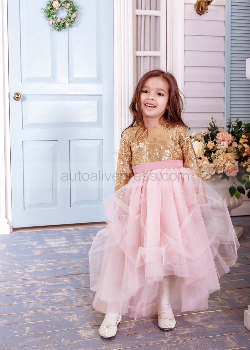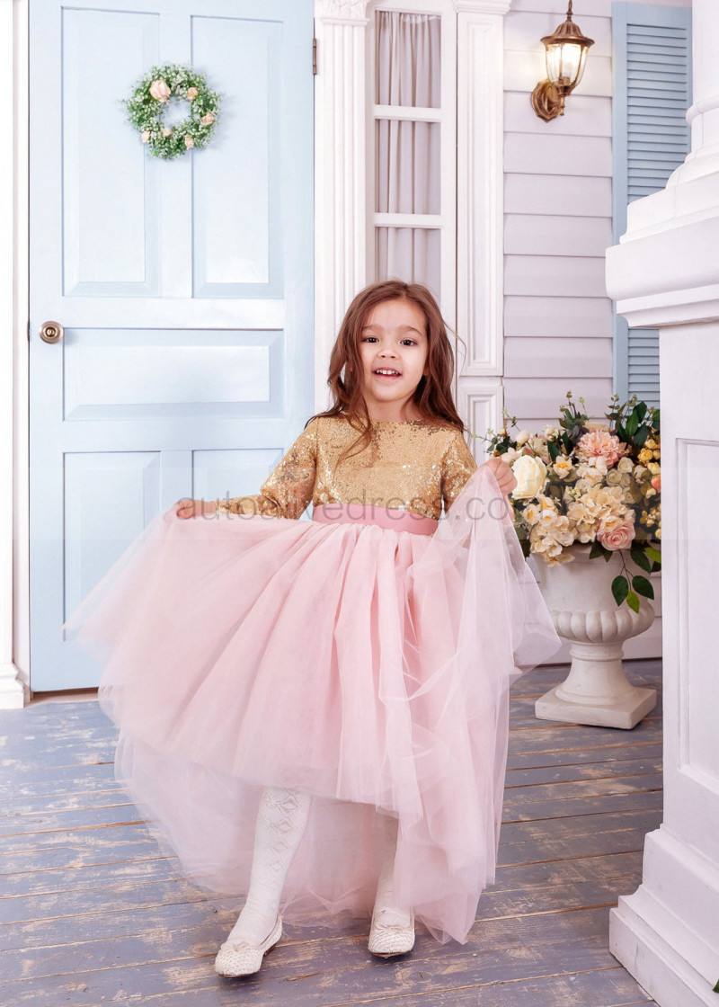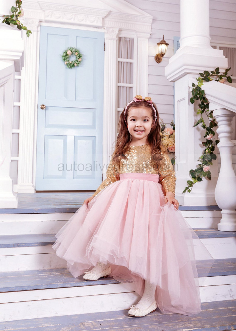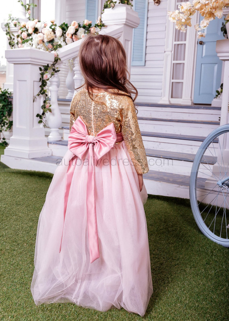 Long Sleeves Gold Sequin Pink Tulle Sparkling Flower Girl Dress