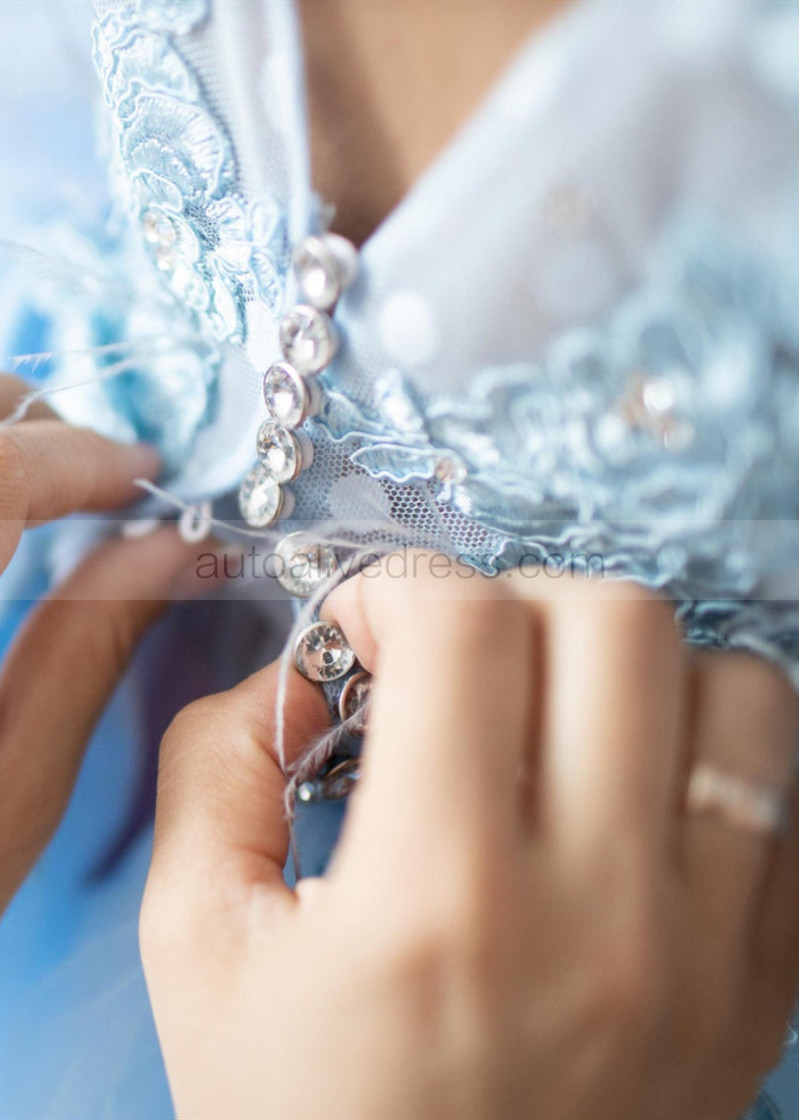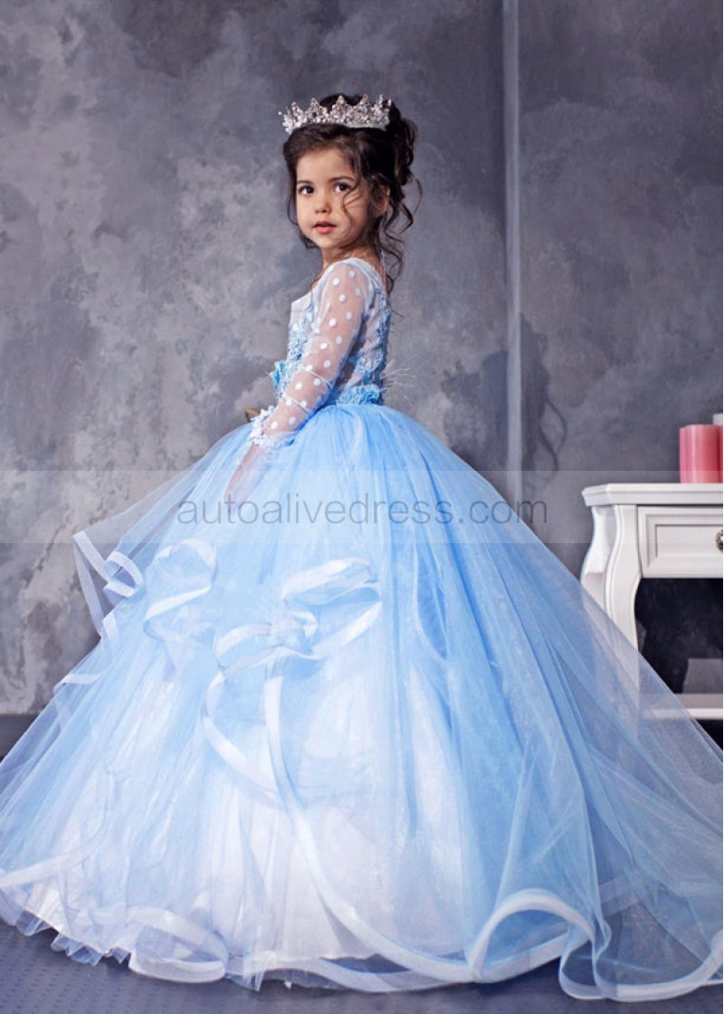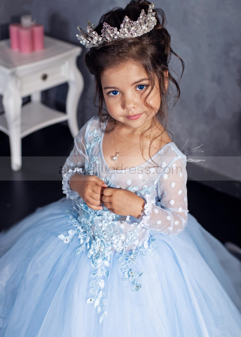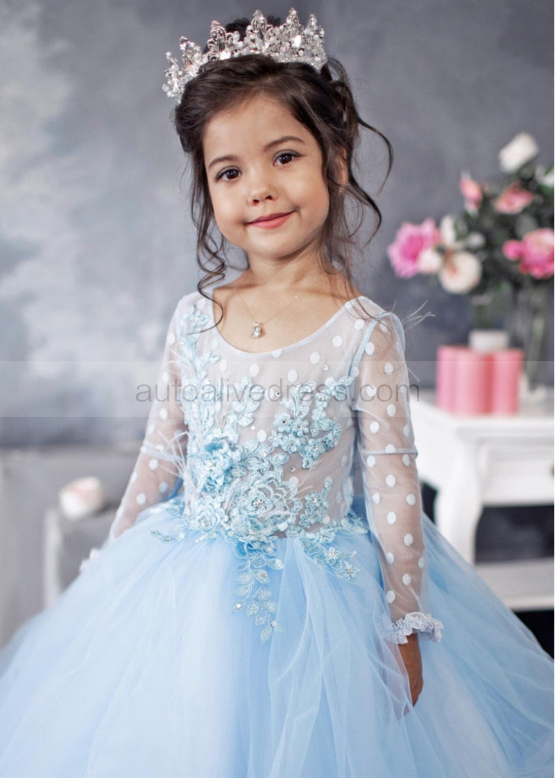 Long Sleeves Sky Blue Polka Dot Lace Tulle Flower Girl Dress