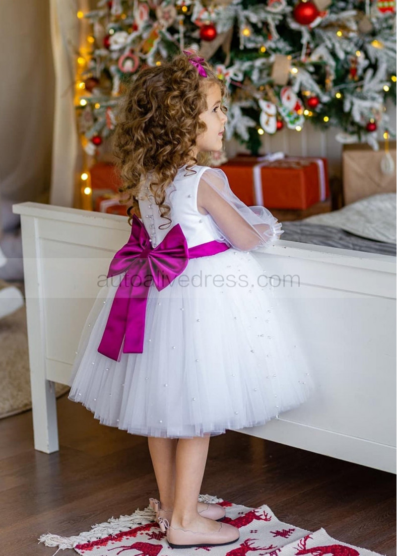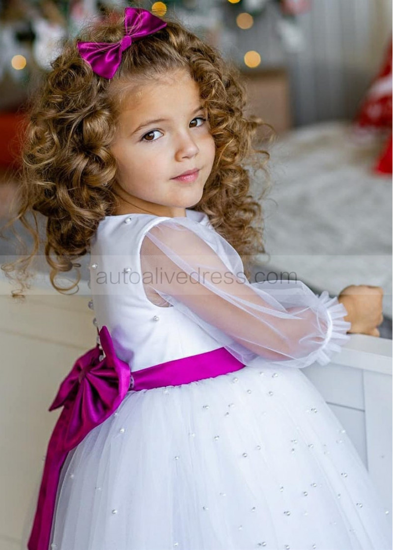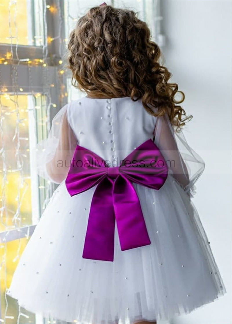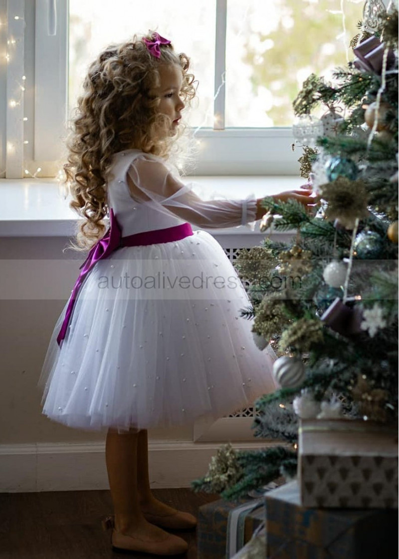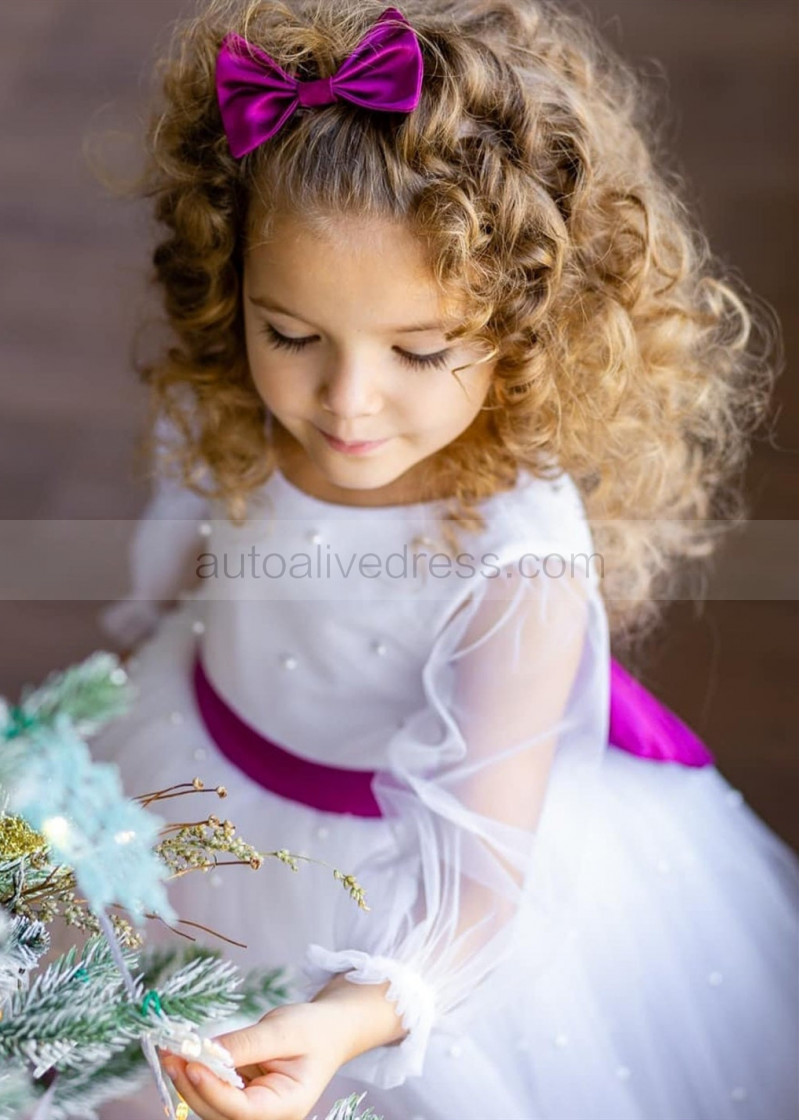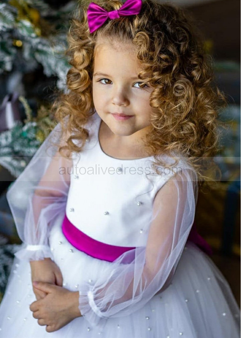 Long Sleeves White Pearls Tulle Flower Girl Dress