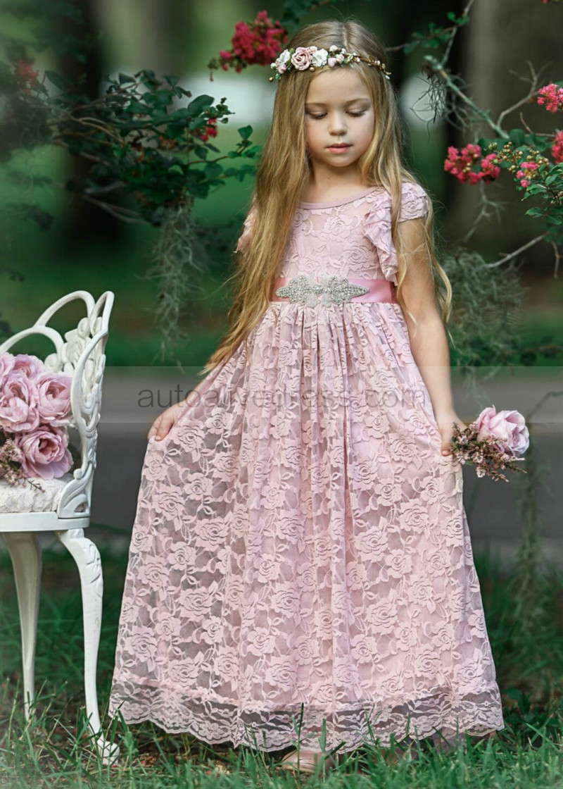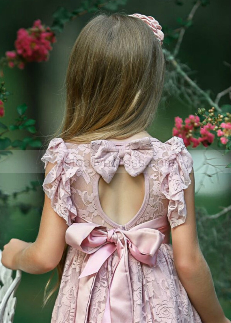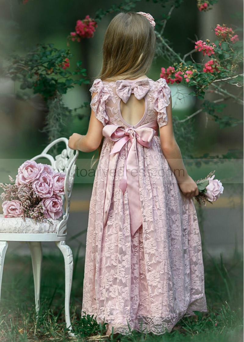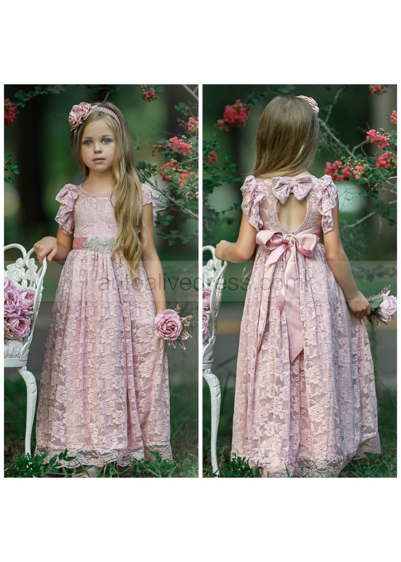 Mauve Lace Floor Length Keyhole Back Country Flower Girl Dress