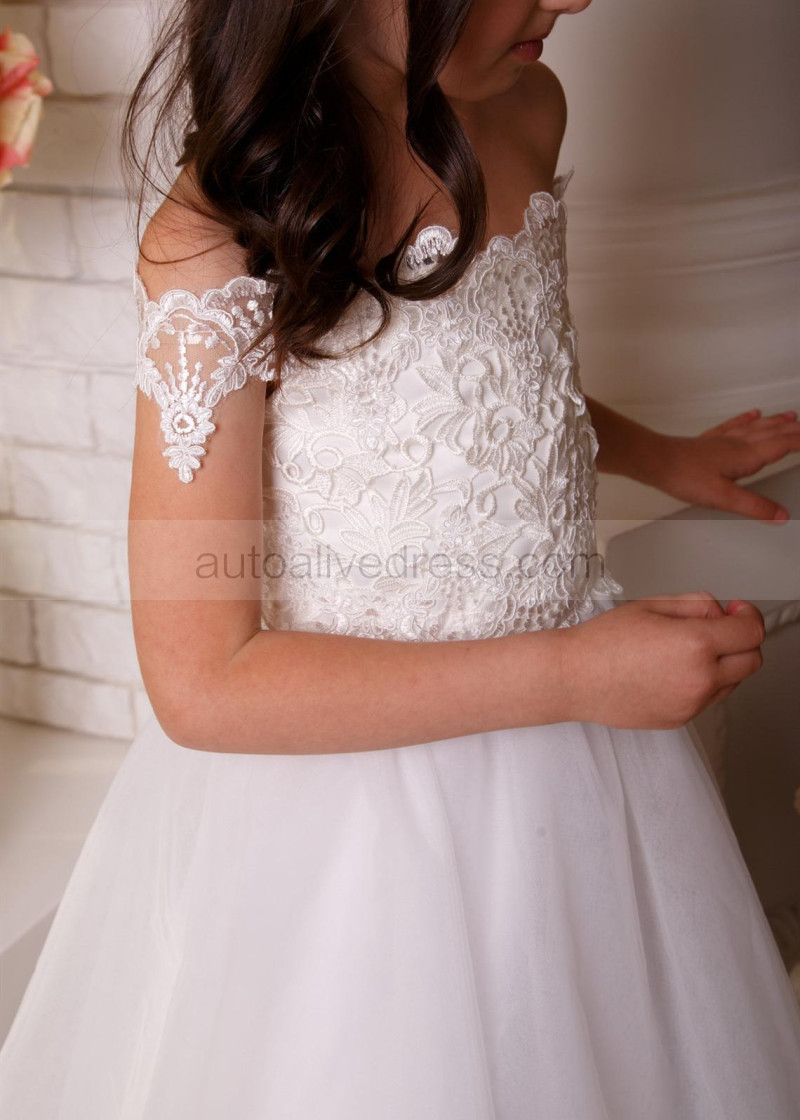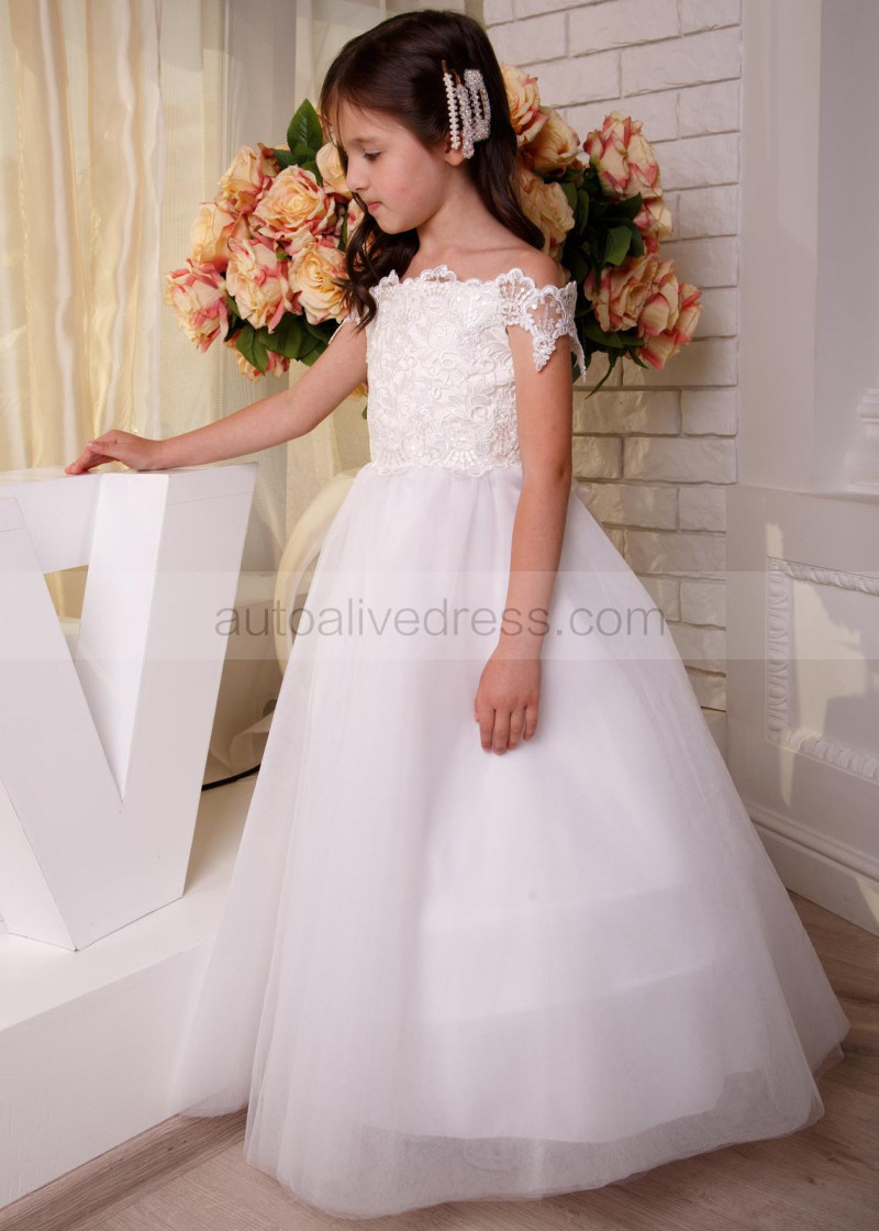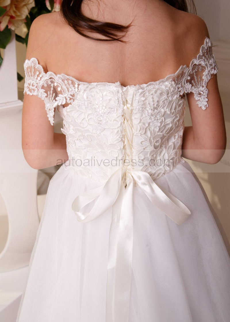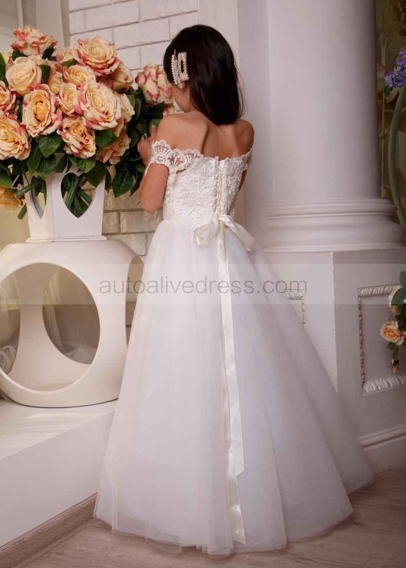 Off Shoulder Ivory Lace Tulle Long Flower Girl Dress