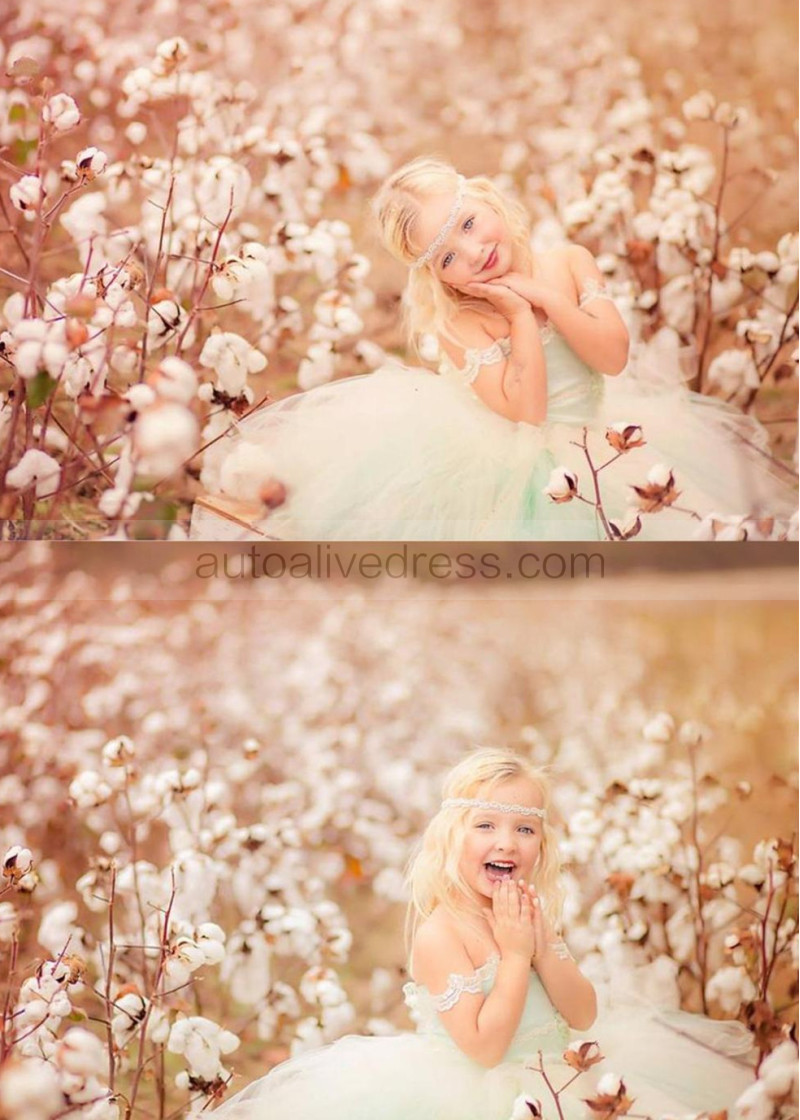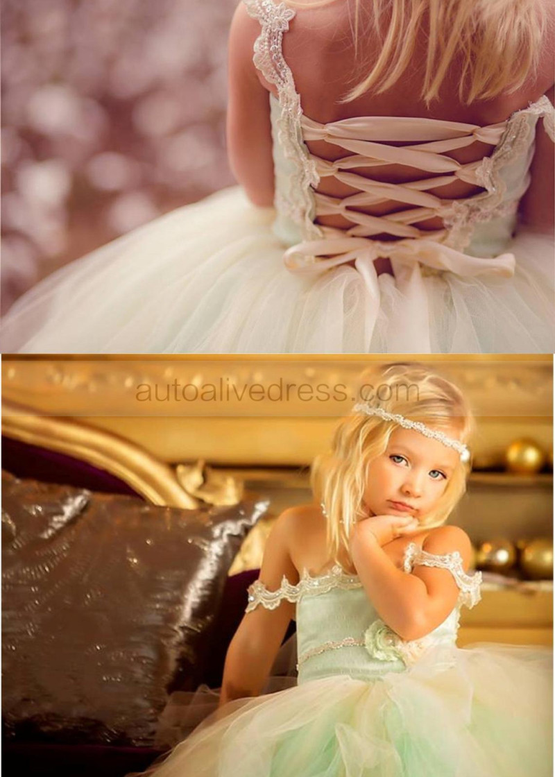 Off Shoulder Mint Tulle Ivory Lace Flower Girl Dress
