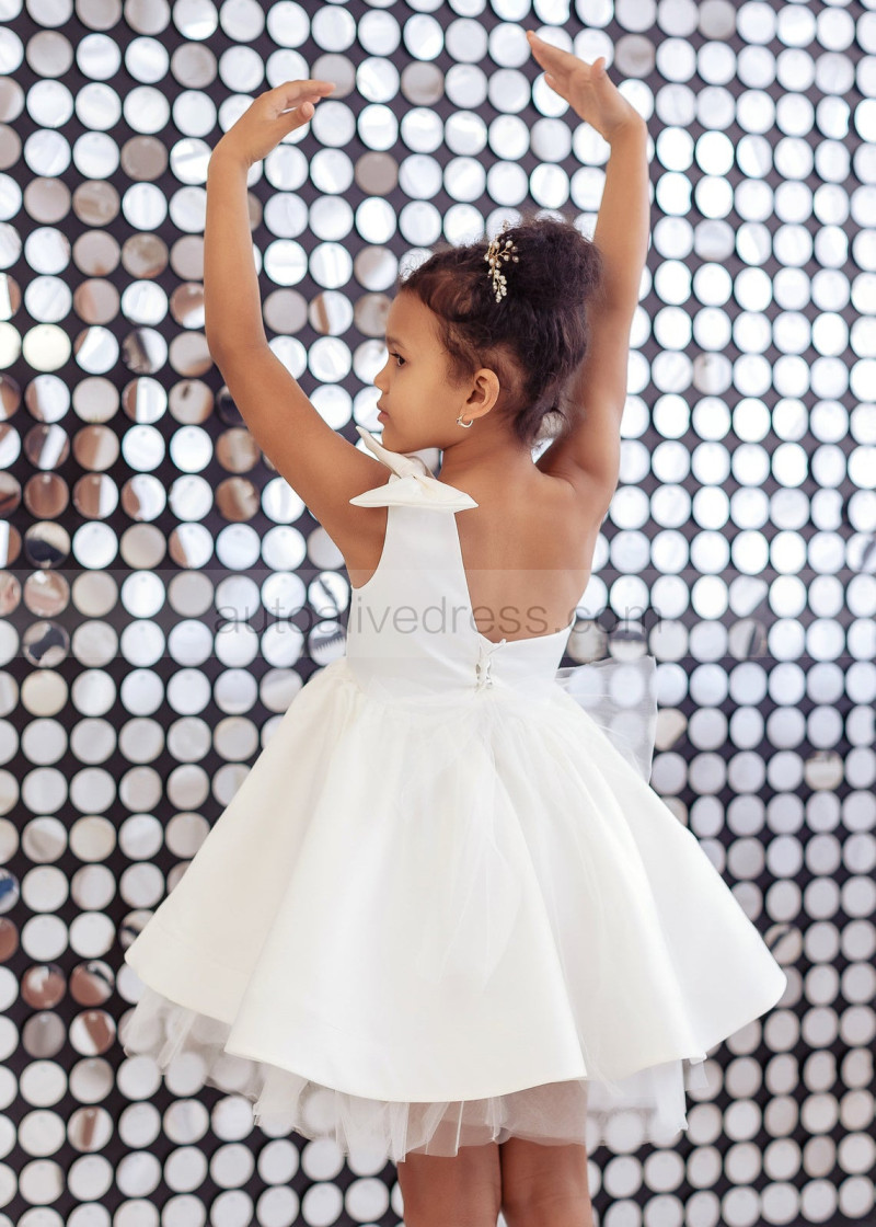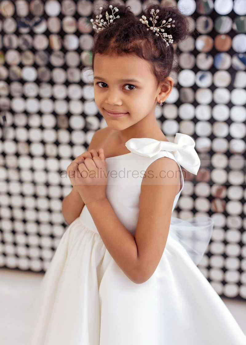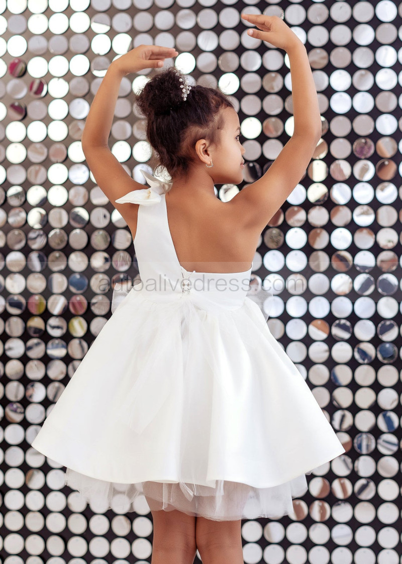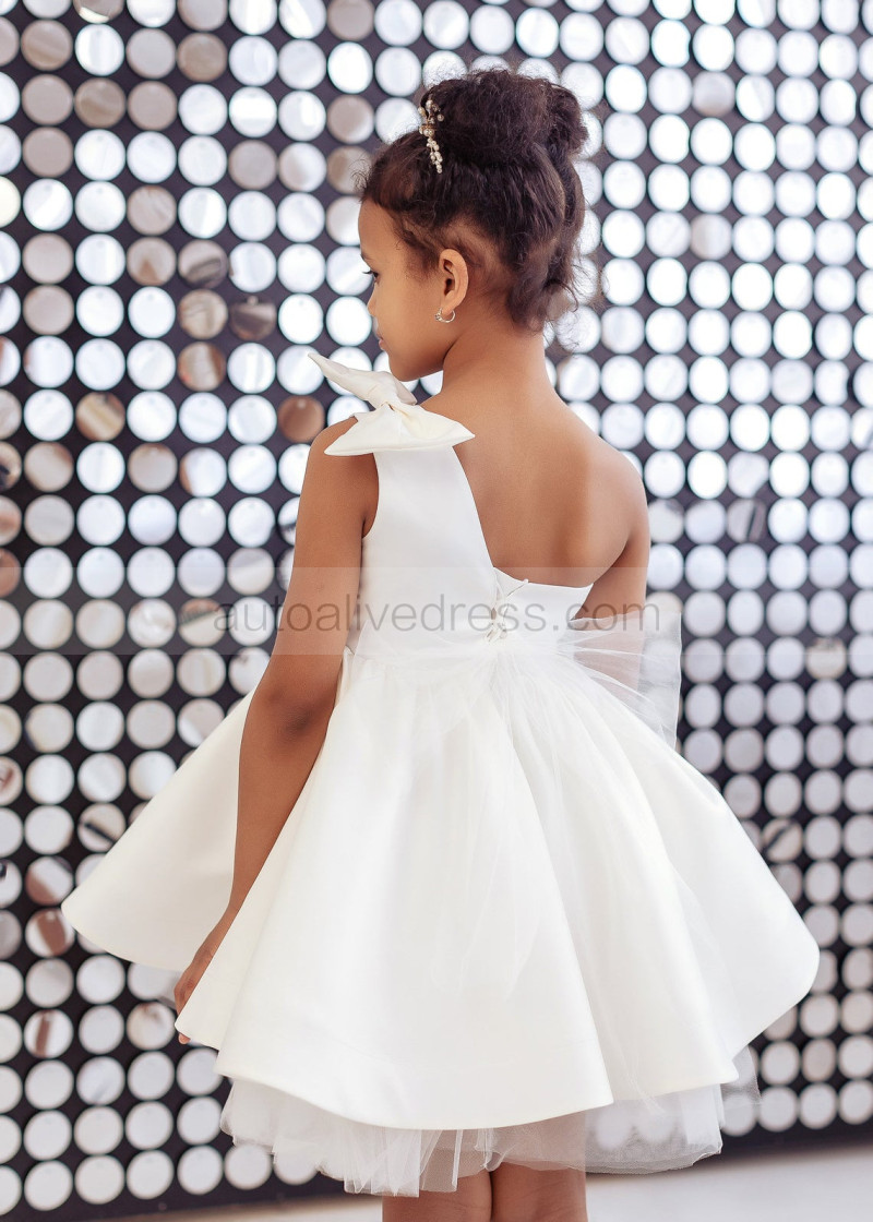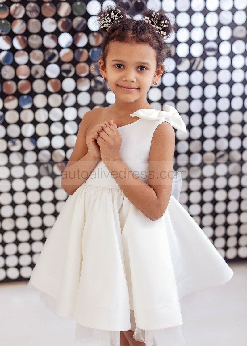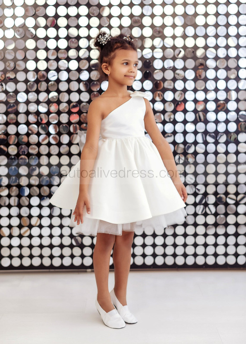 One Shoulder Ivory Satin Peek-A-Boo Tulle Flower Girl Dress