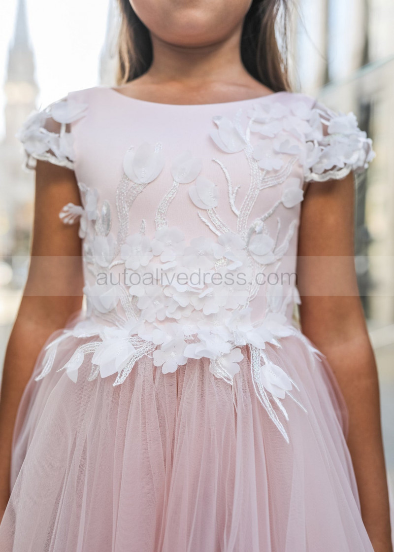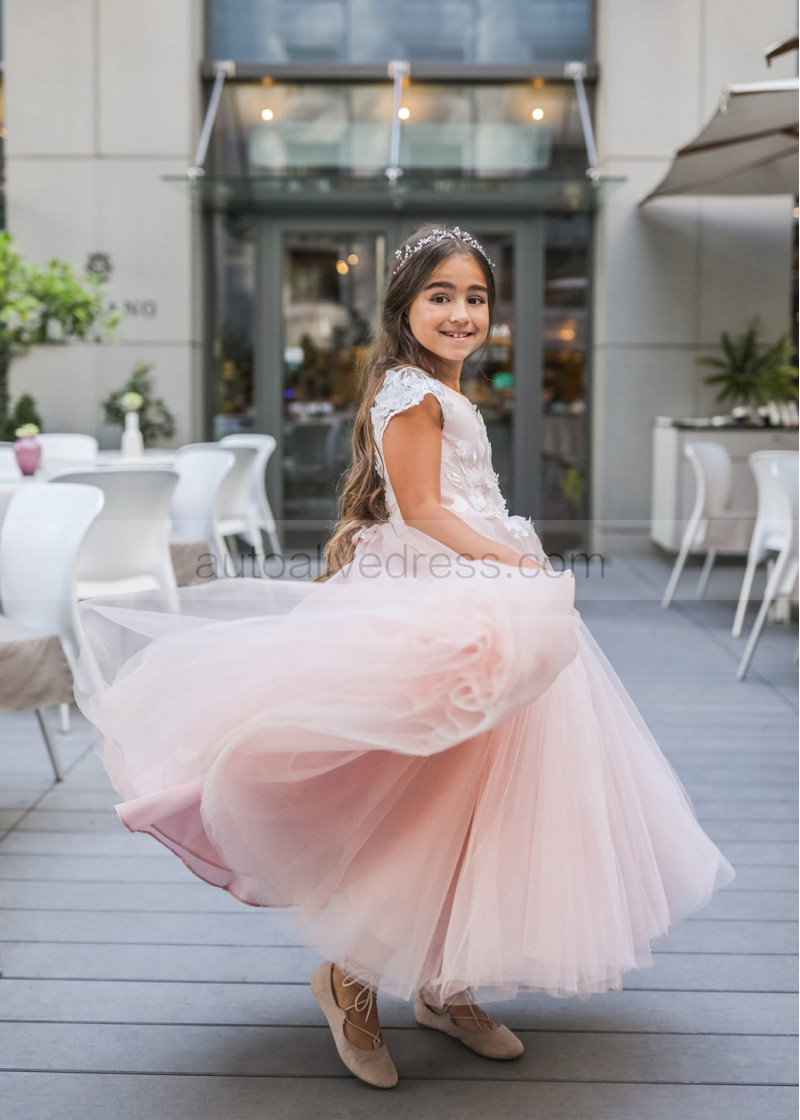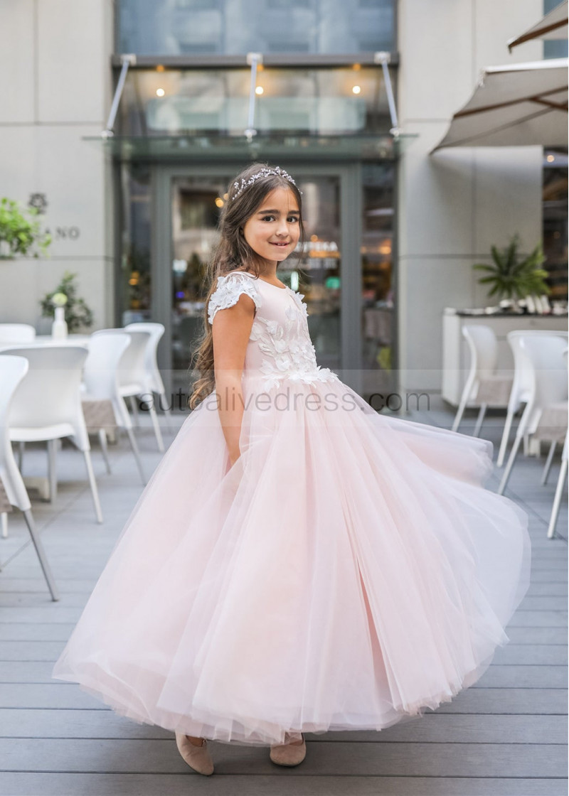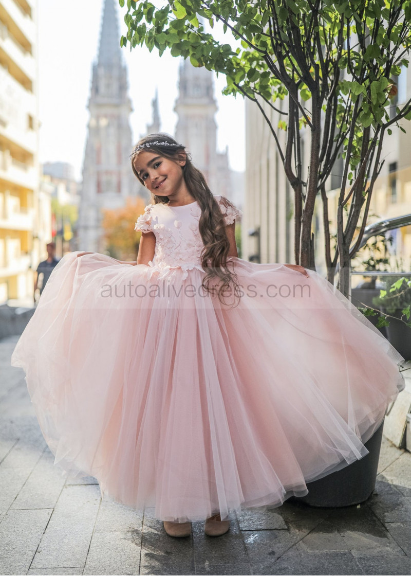 Pink Floral Appliques Tulle Romantic Flower Girl Dress