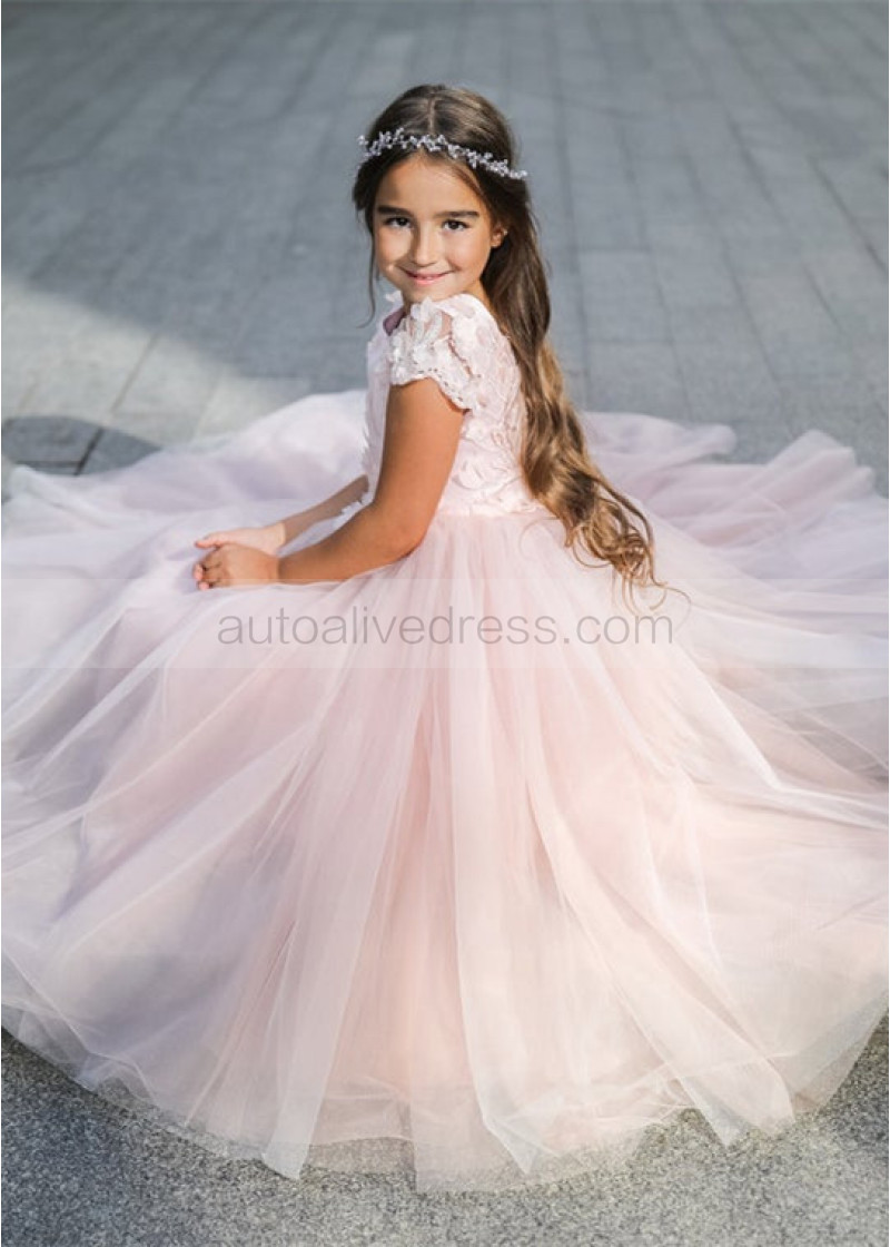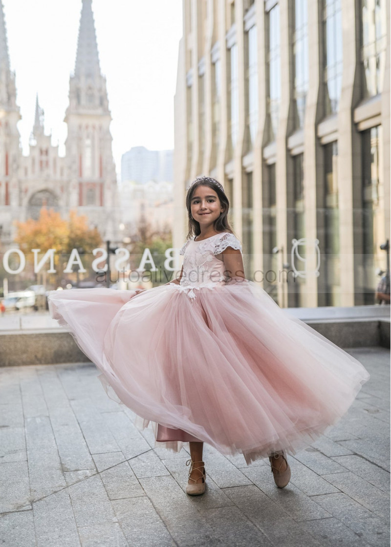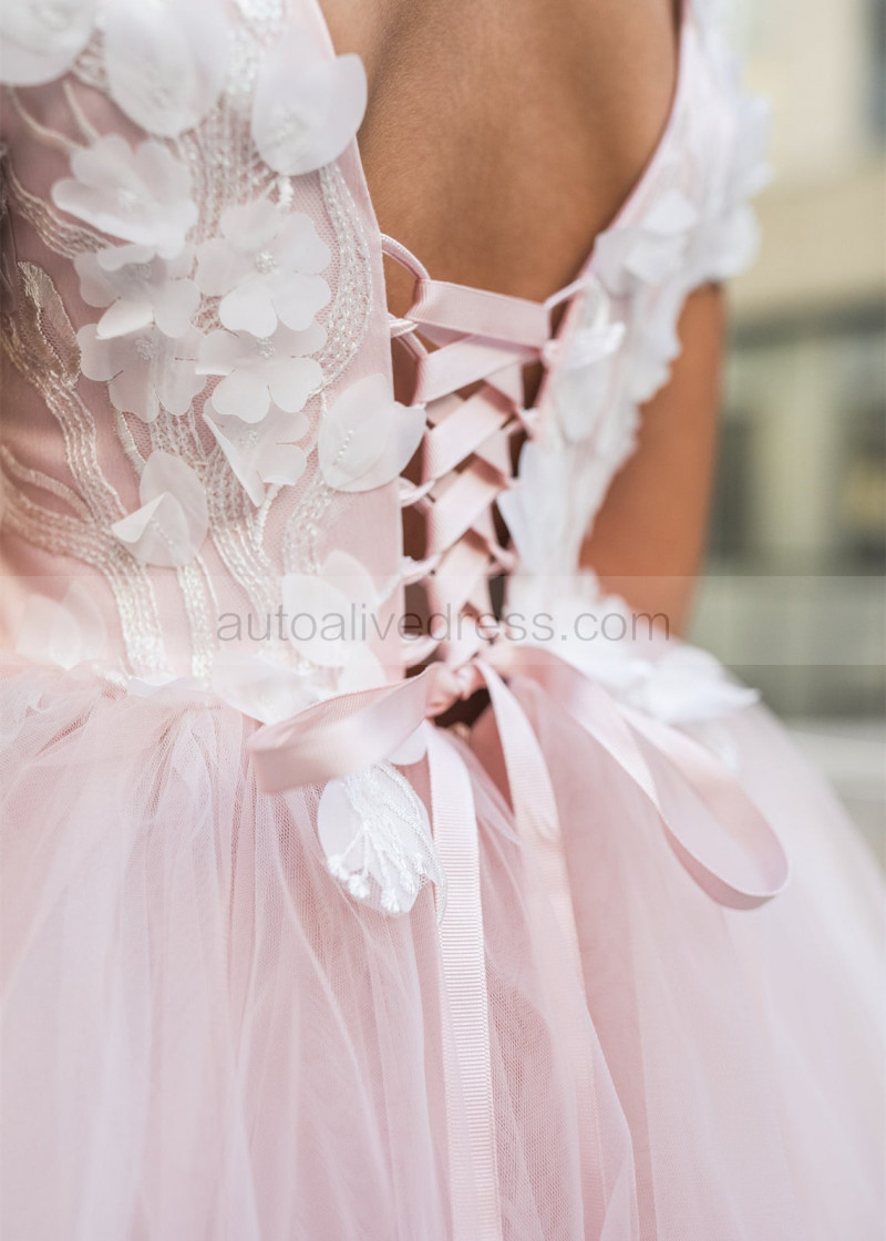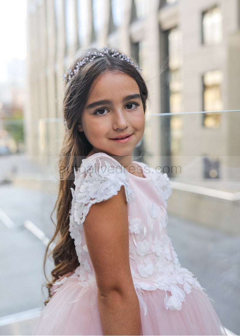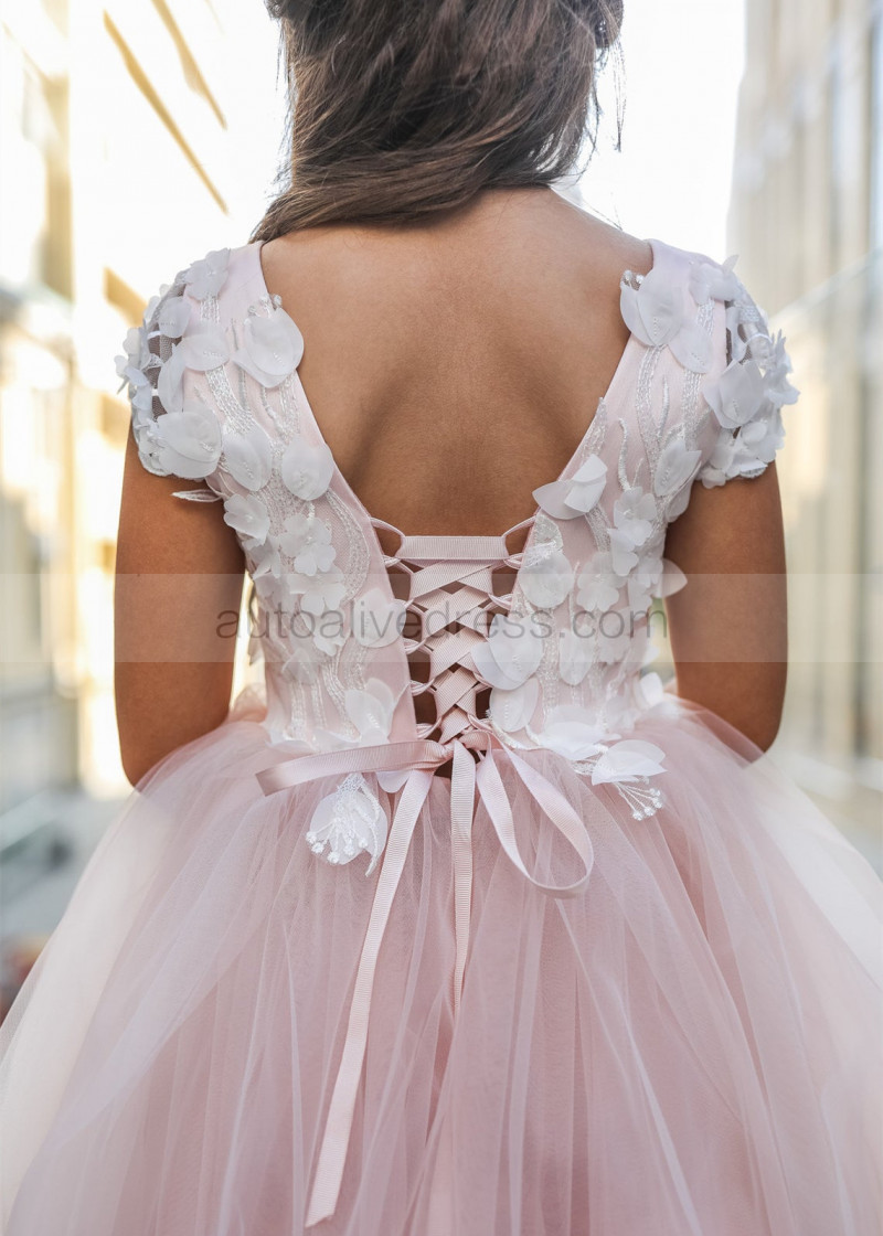 Pink Floral Appliques Tulle Romantic Flower Girl Dress
