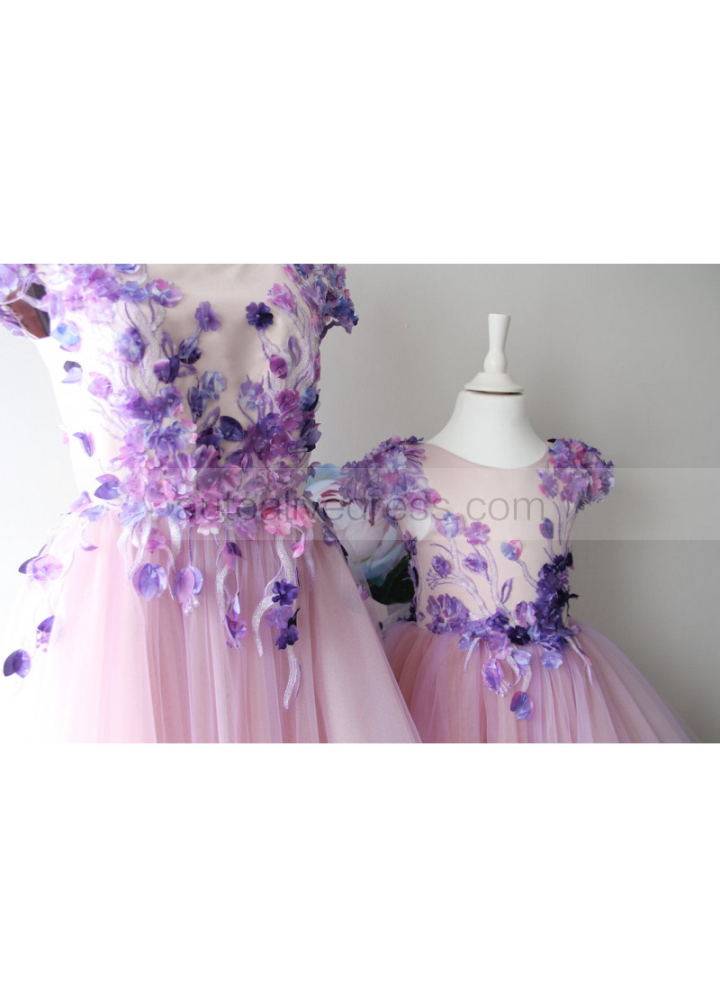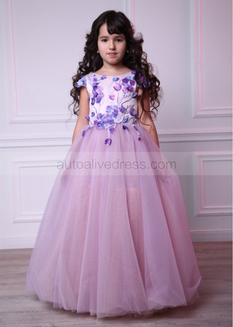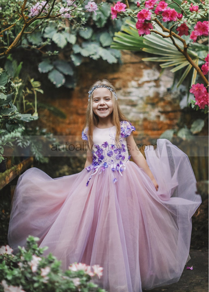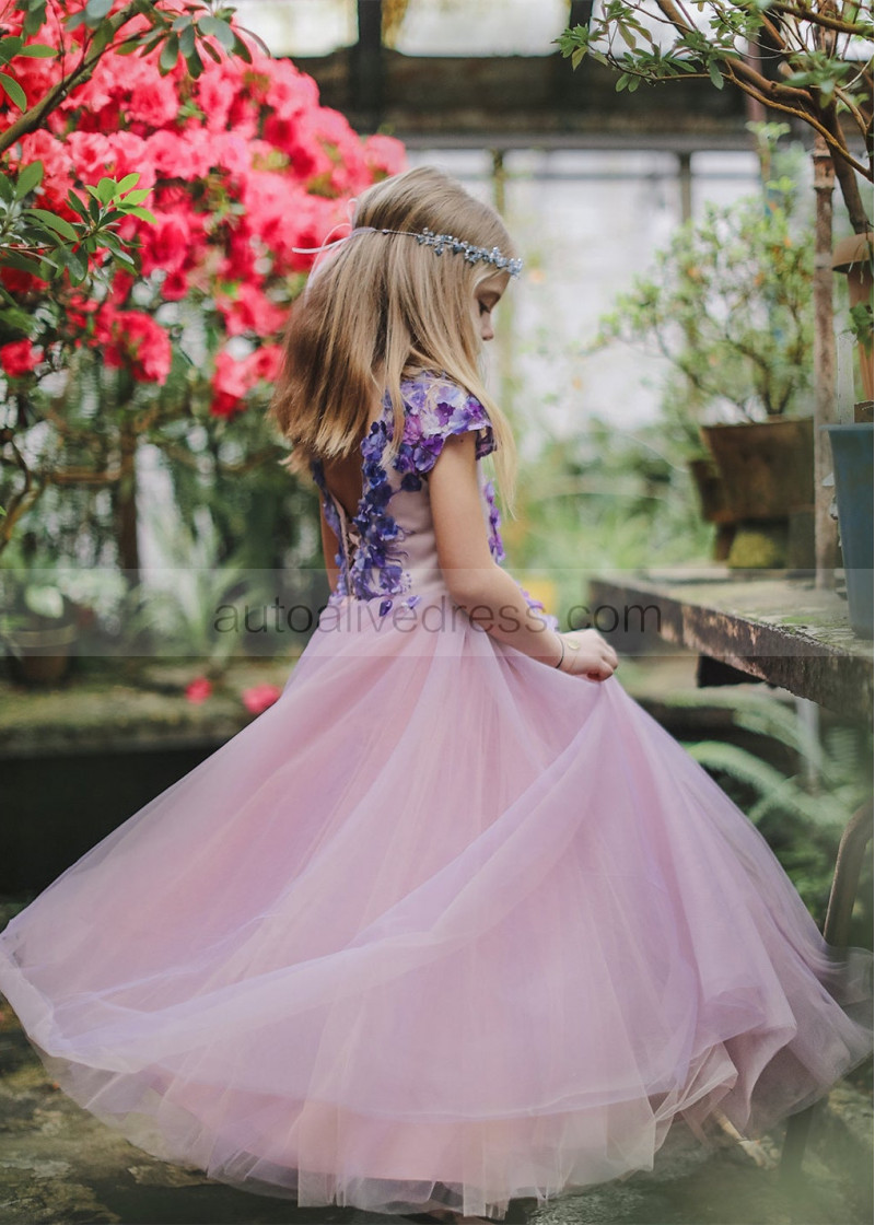 Pink Lavender Floral Appliques Tulle Dreamy Flower Girl Dress