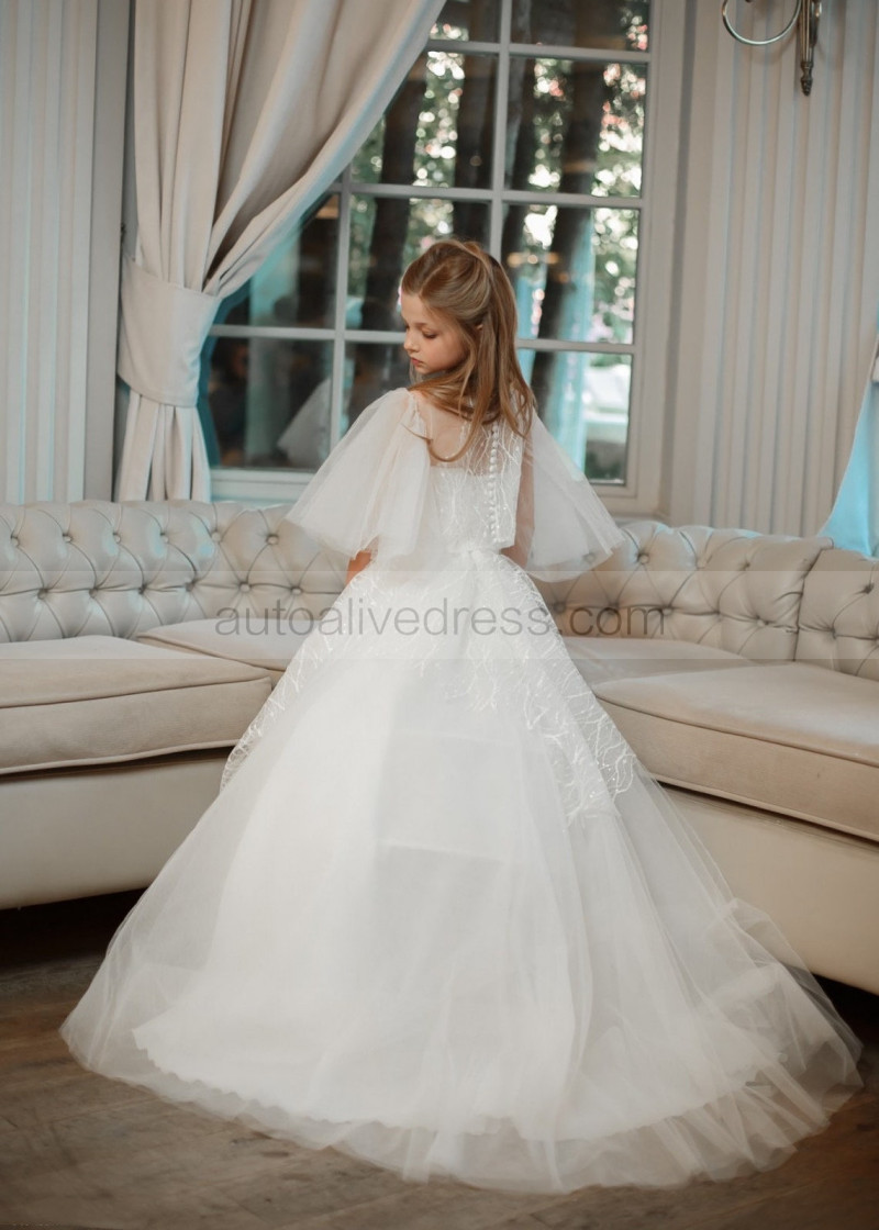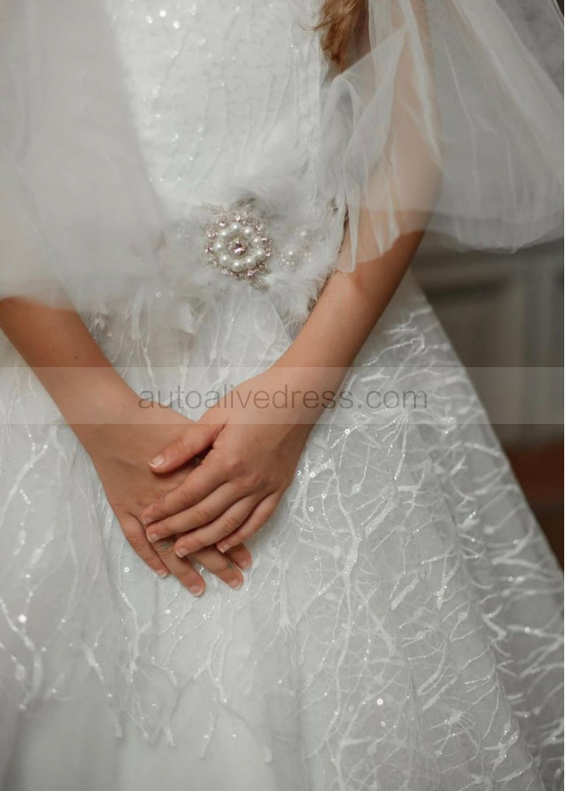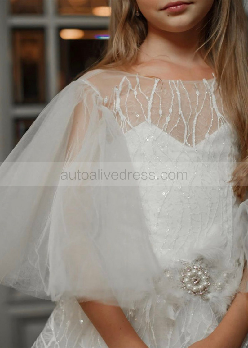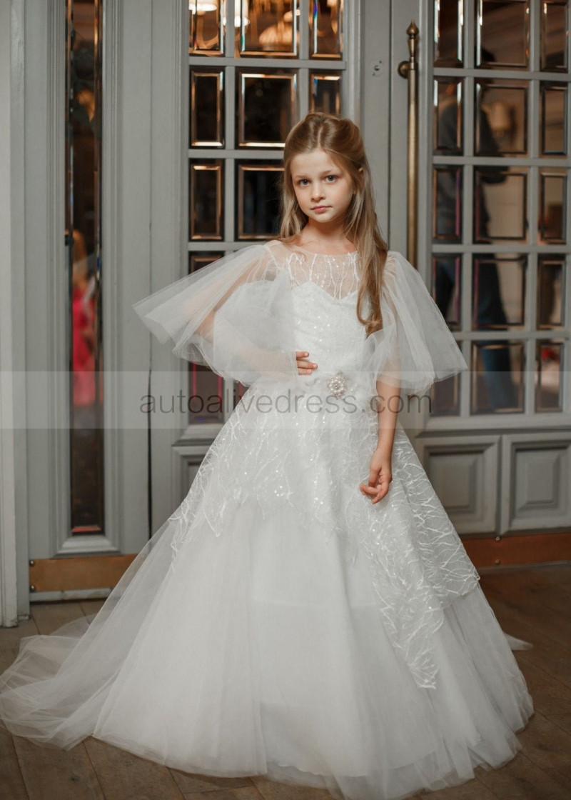 Puff Sleeves White Glitter Lace Tulle Flower Girl Dress