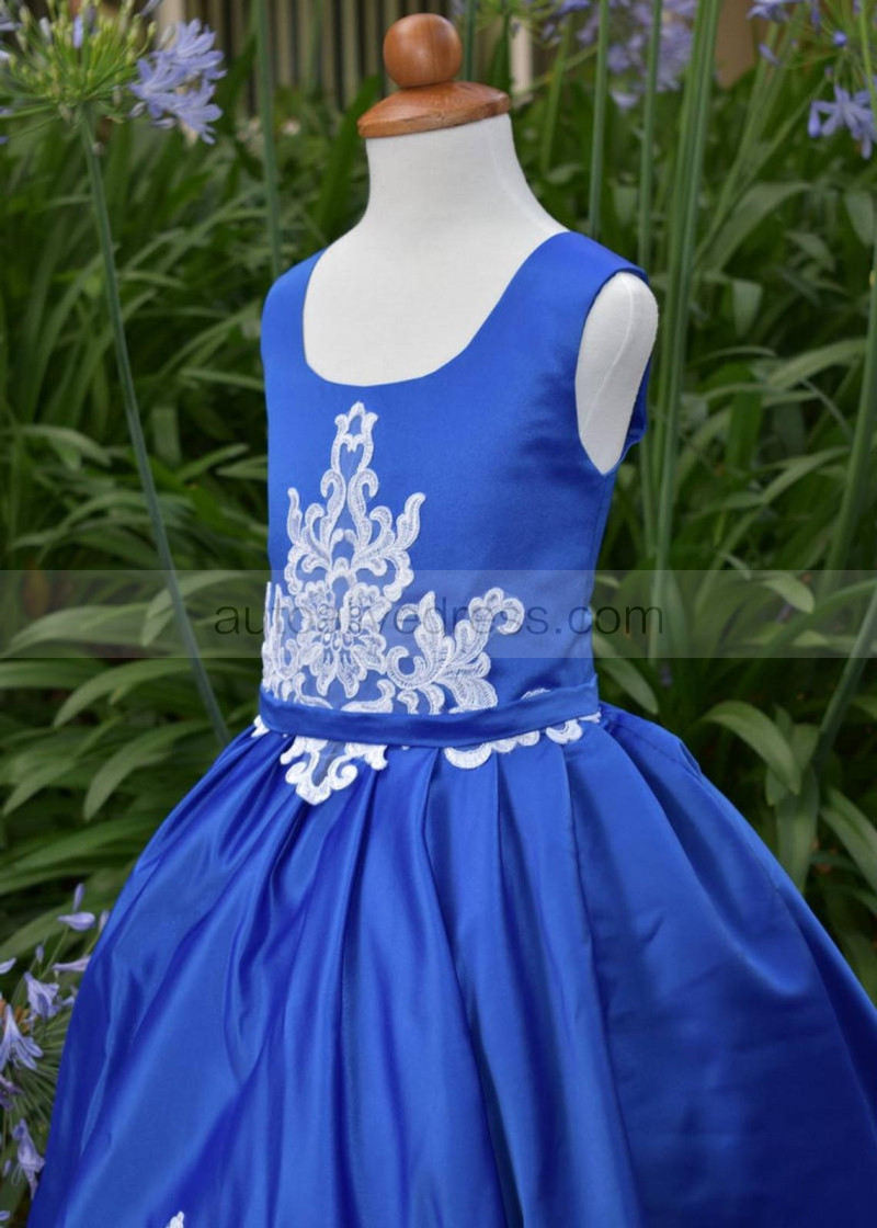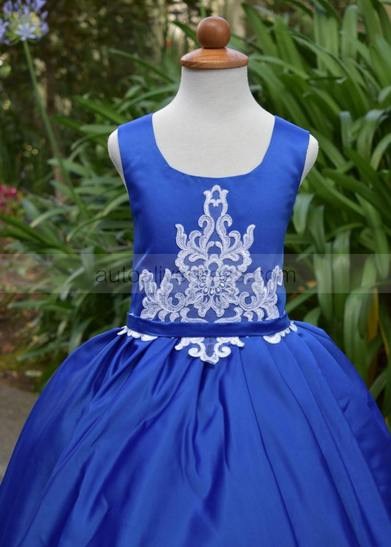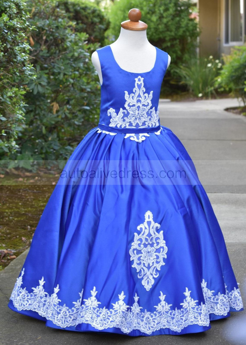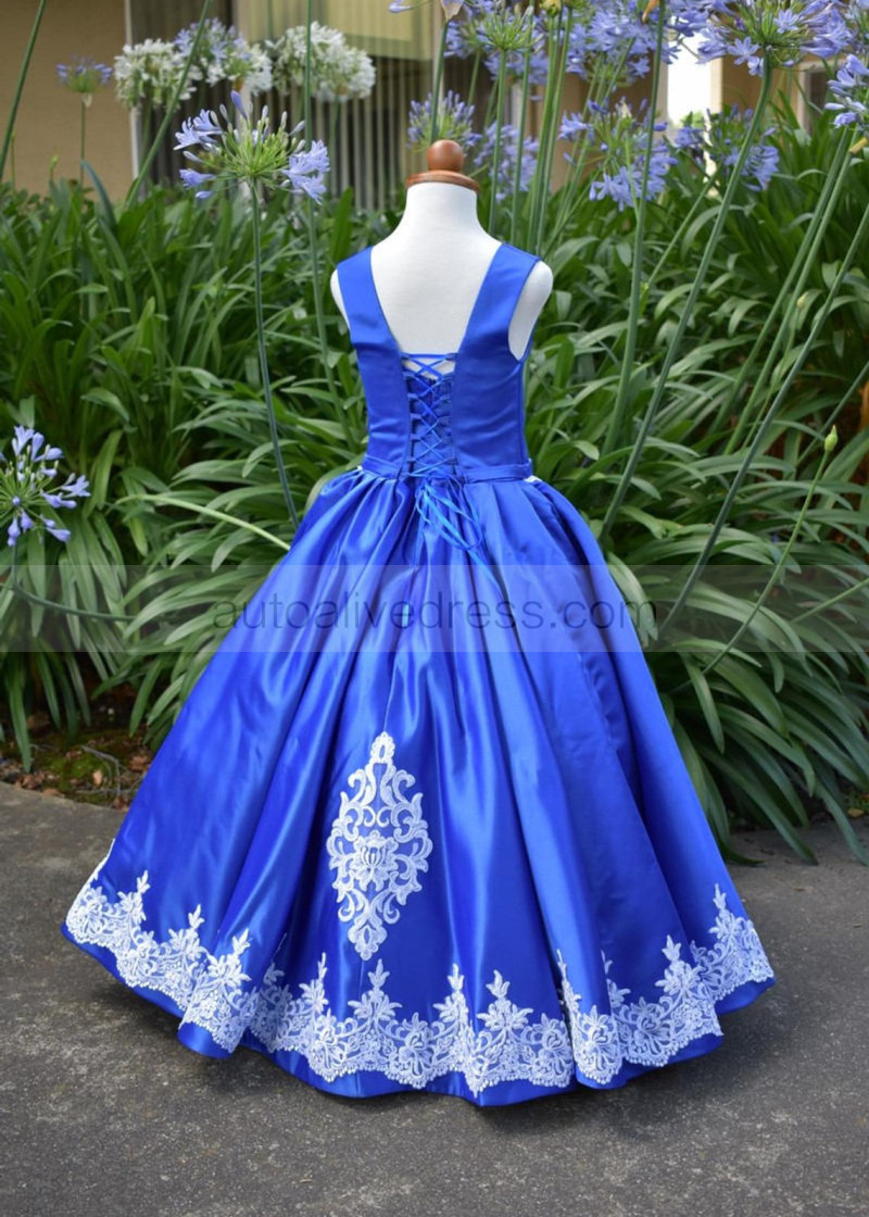 Royal Blue Satin White Lace Appliques Flower Girl Dress