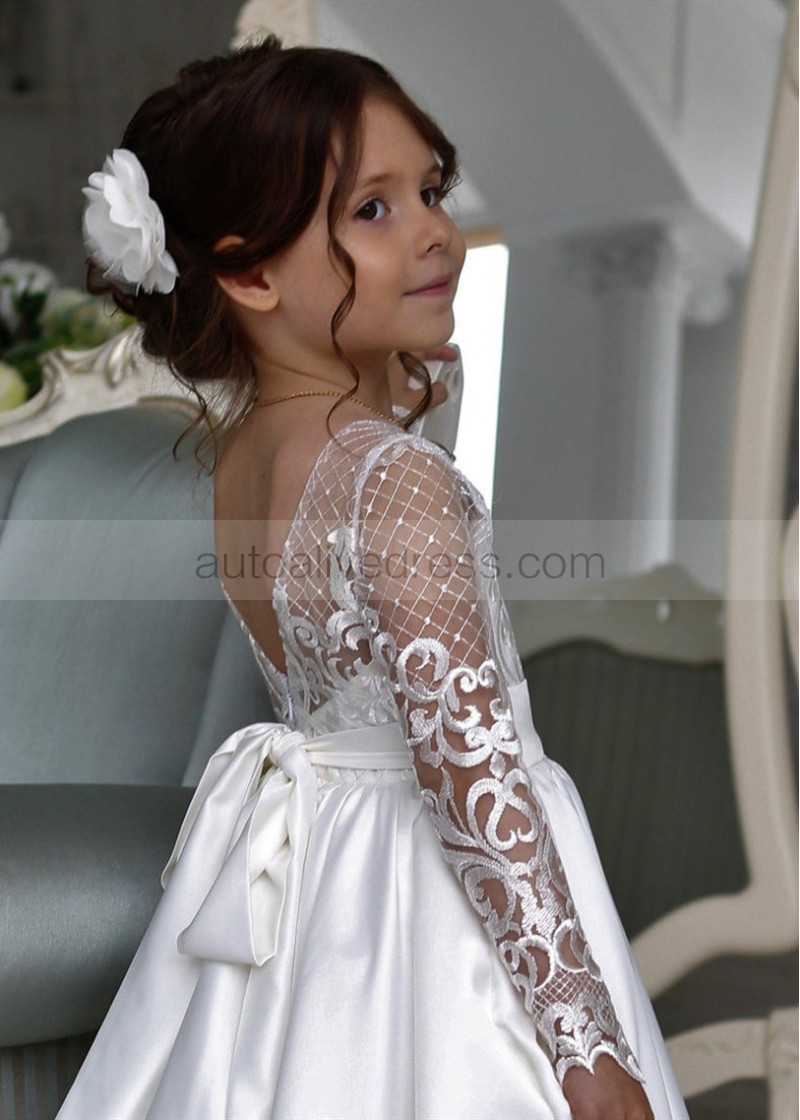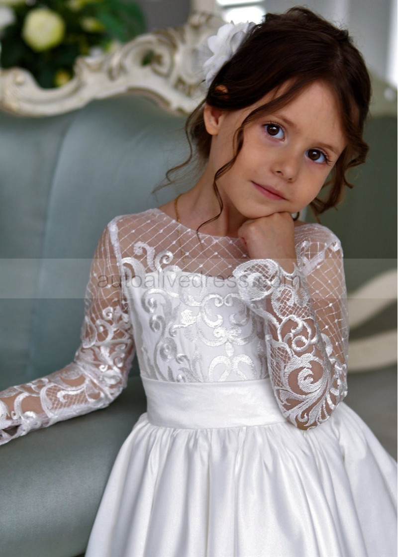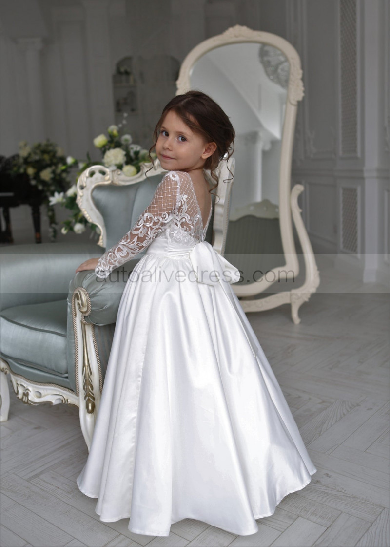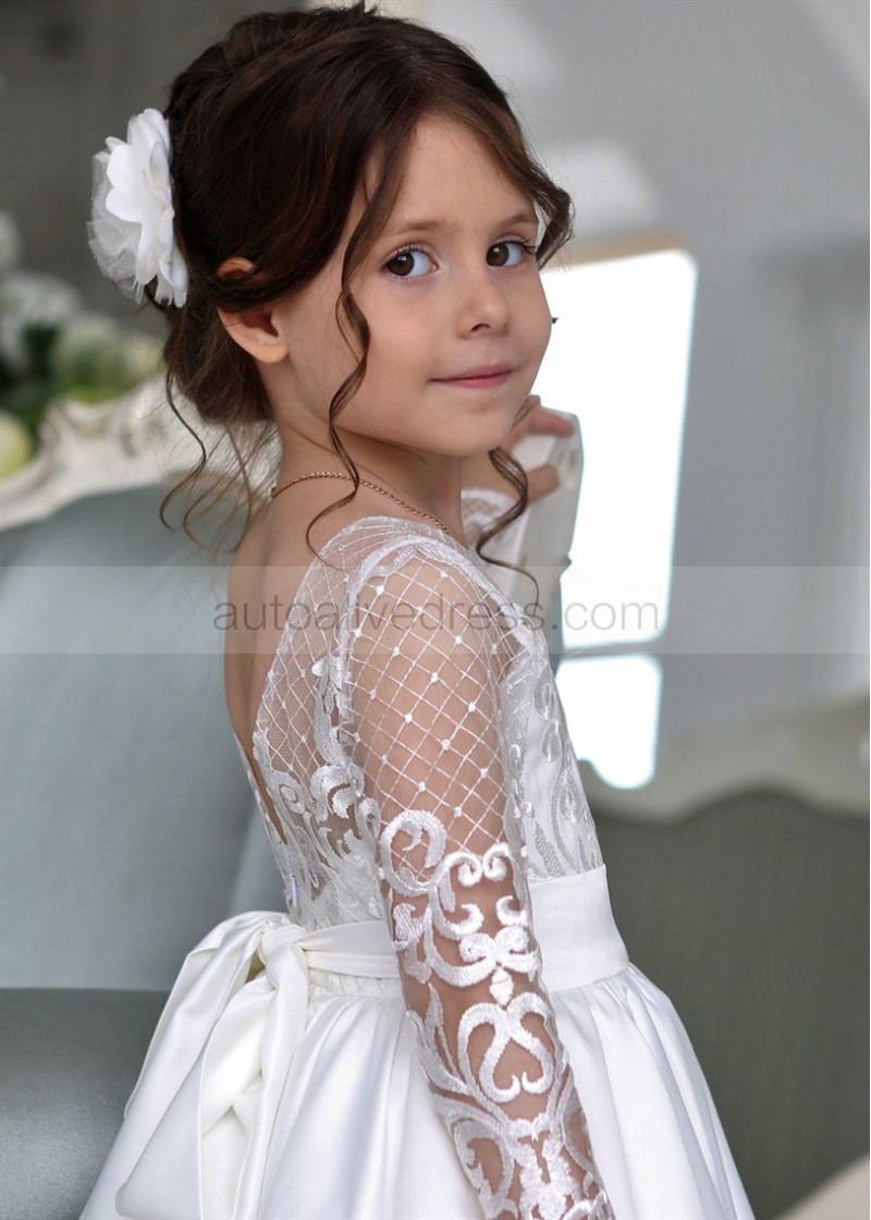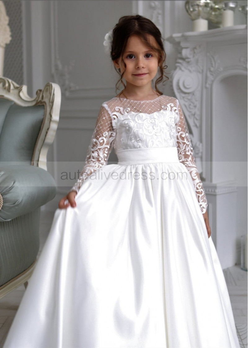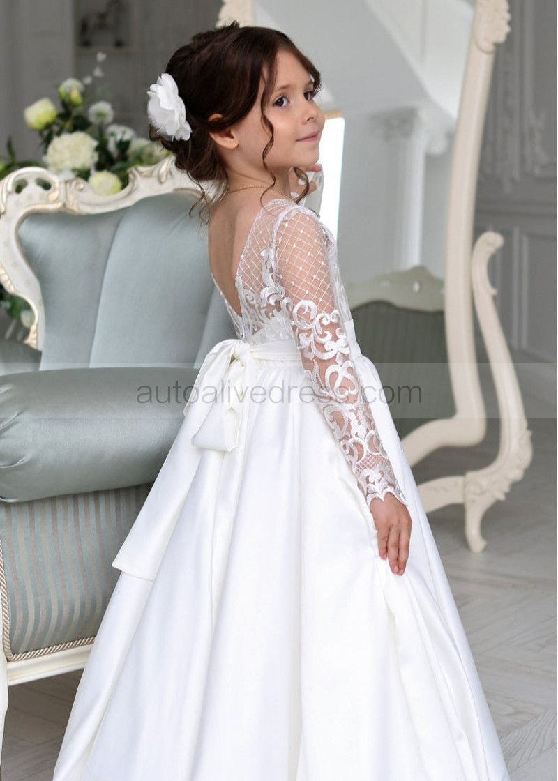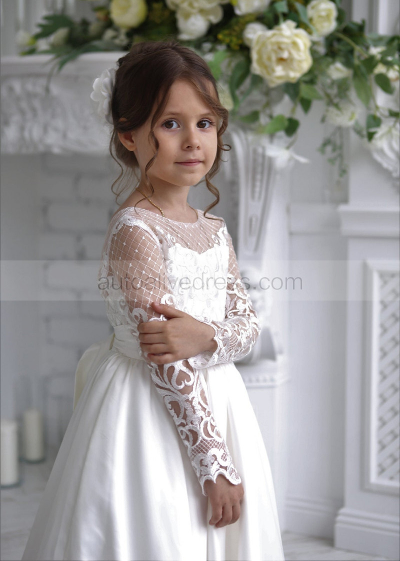 Sheer Long Sleeve Ivory Lace Satin Flower Girl Dress