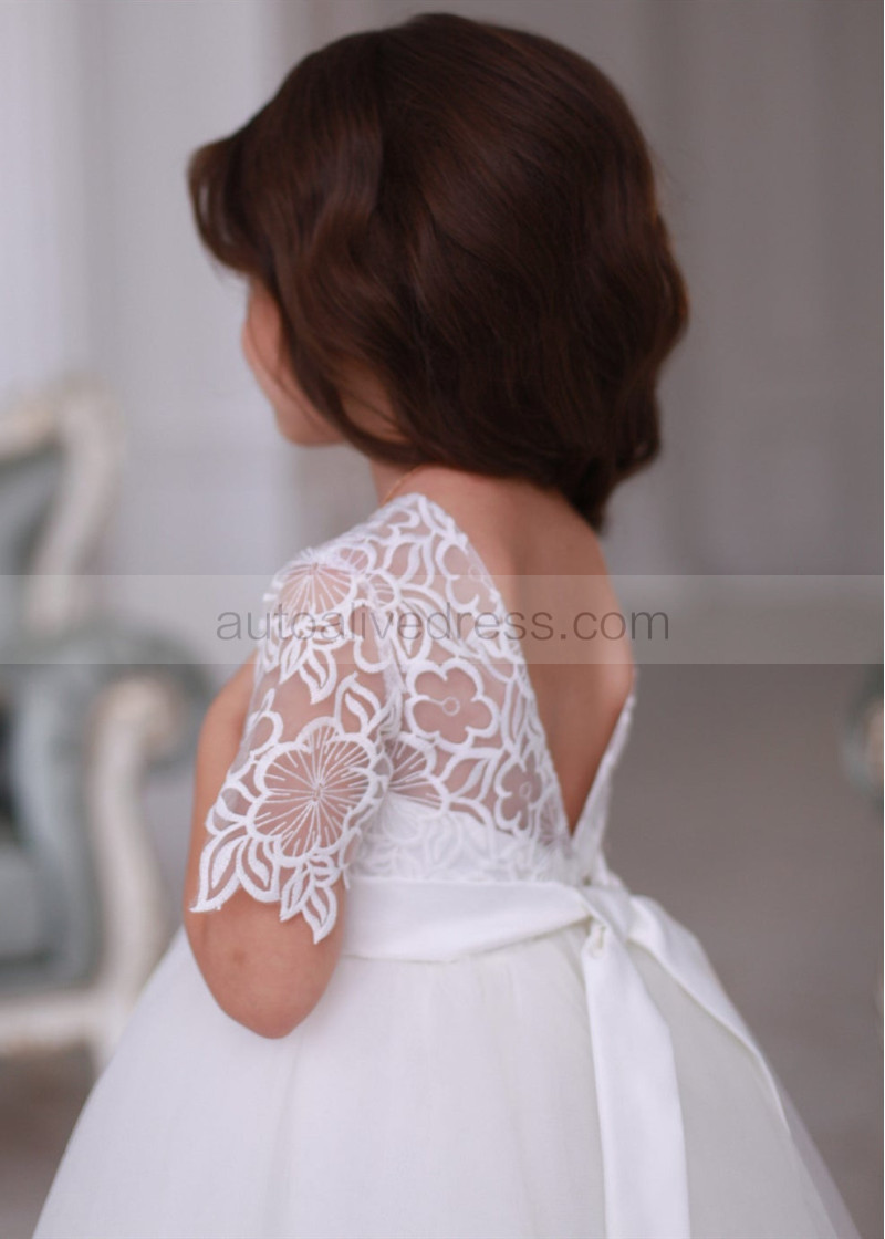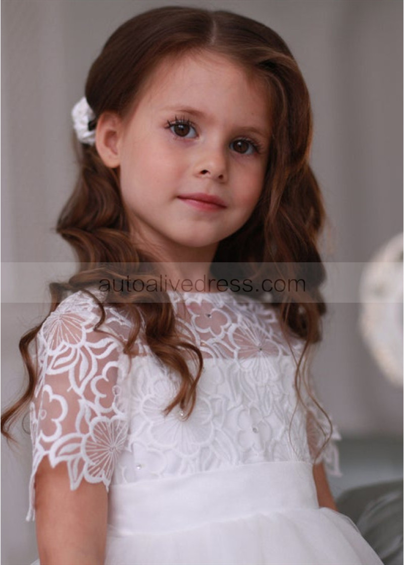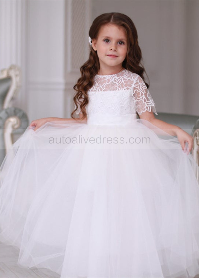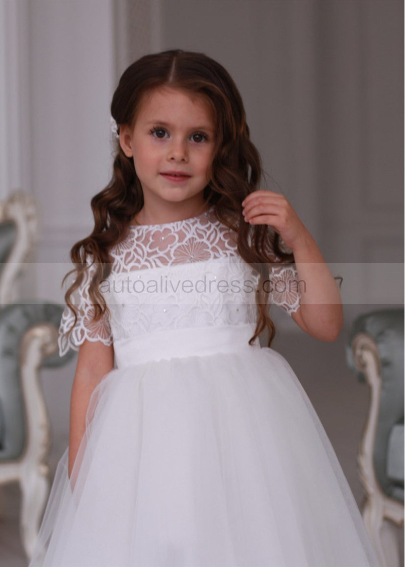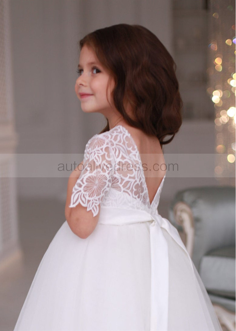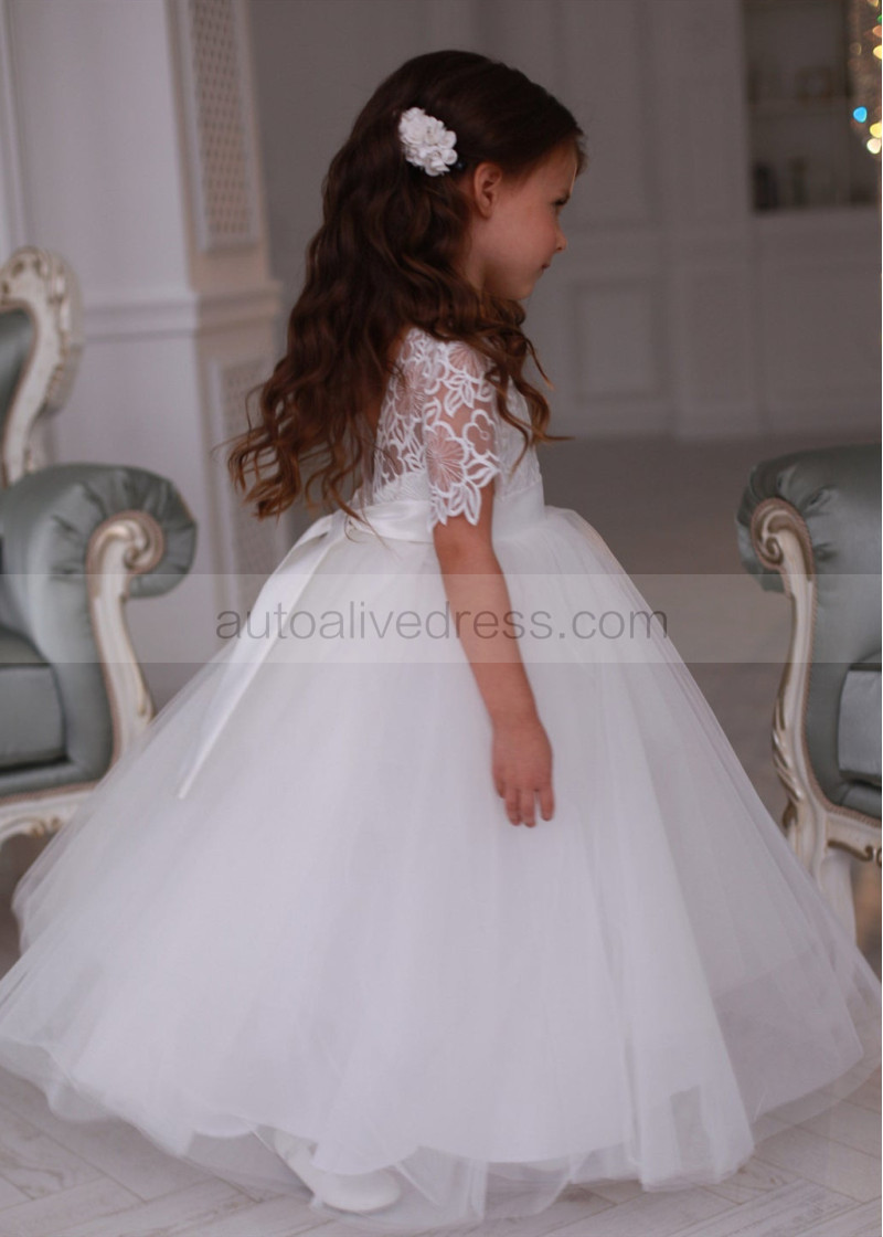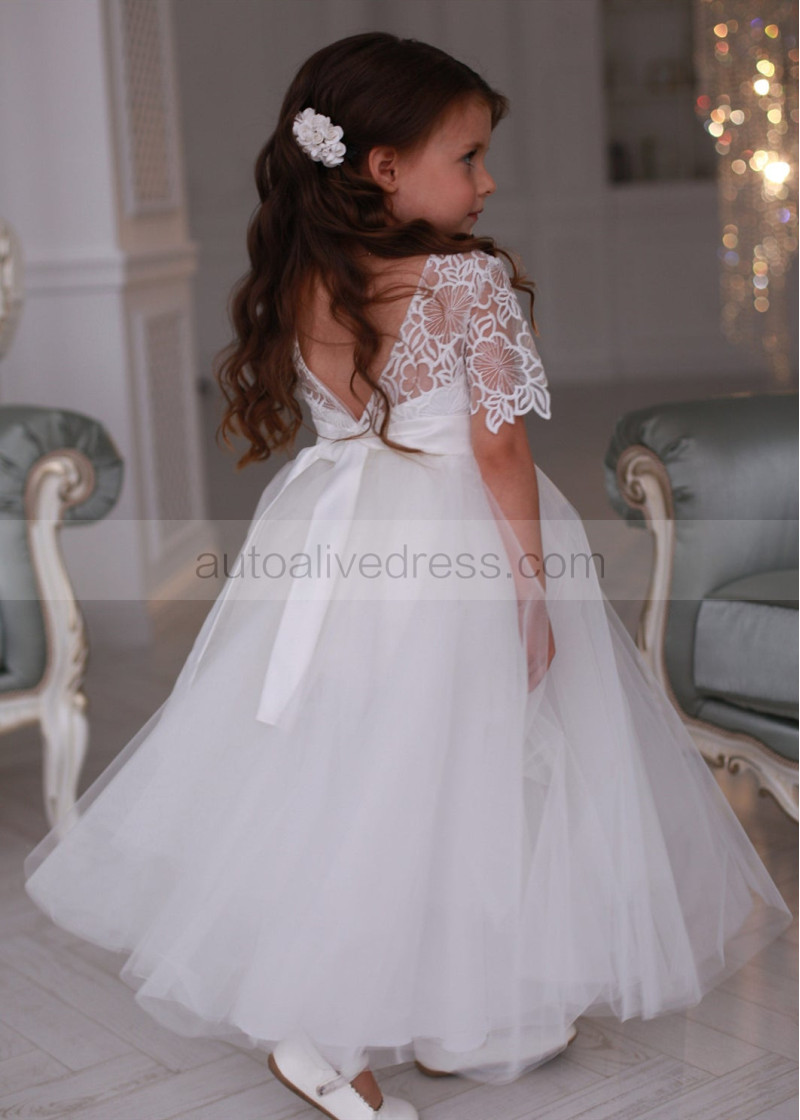 Short Sleeve Ivory Lace Tulle Long Flower Girl Dress