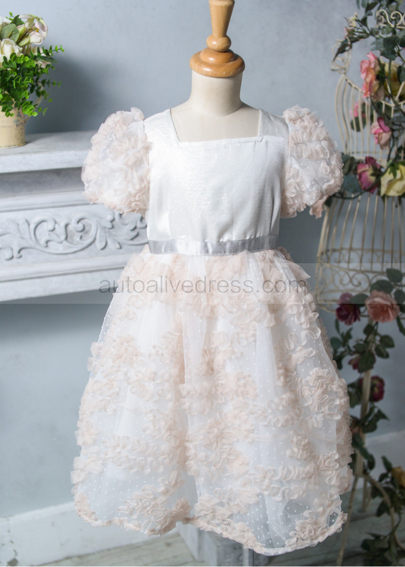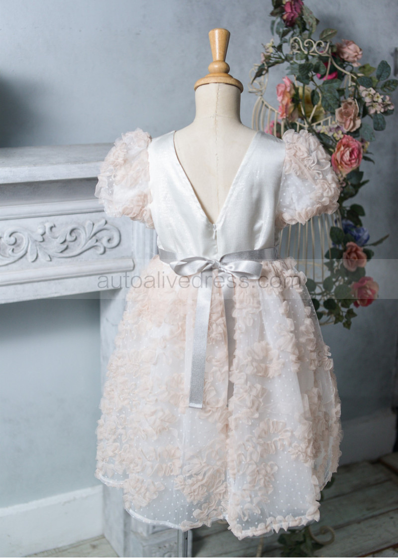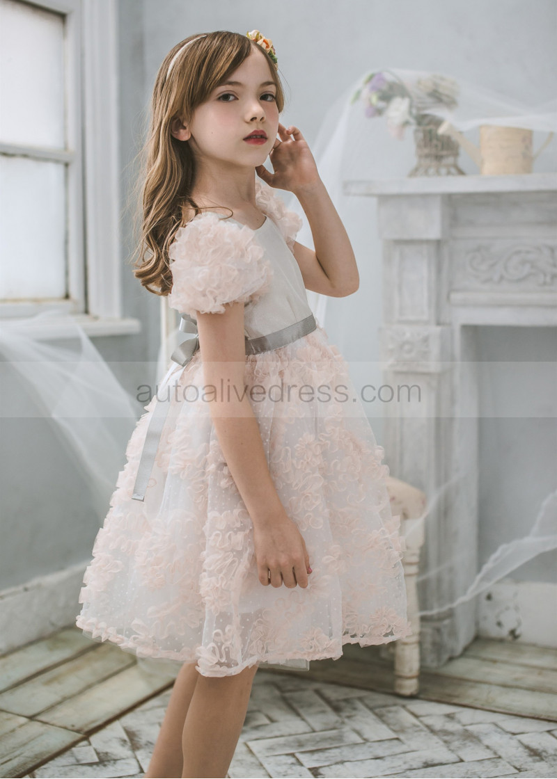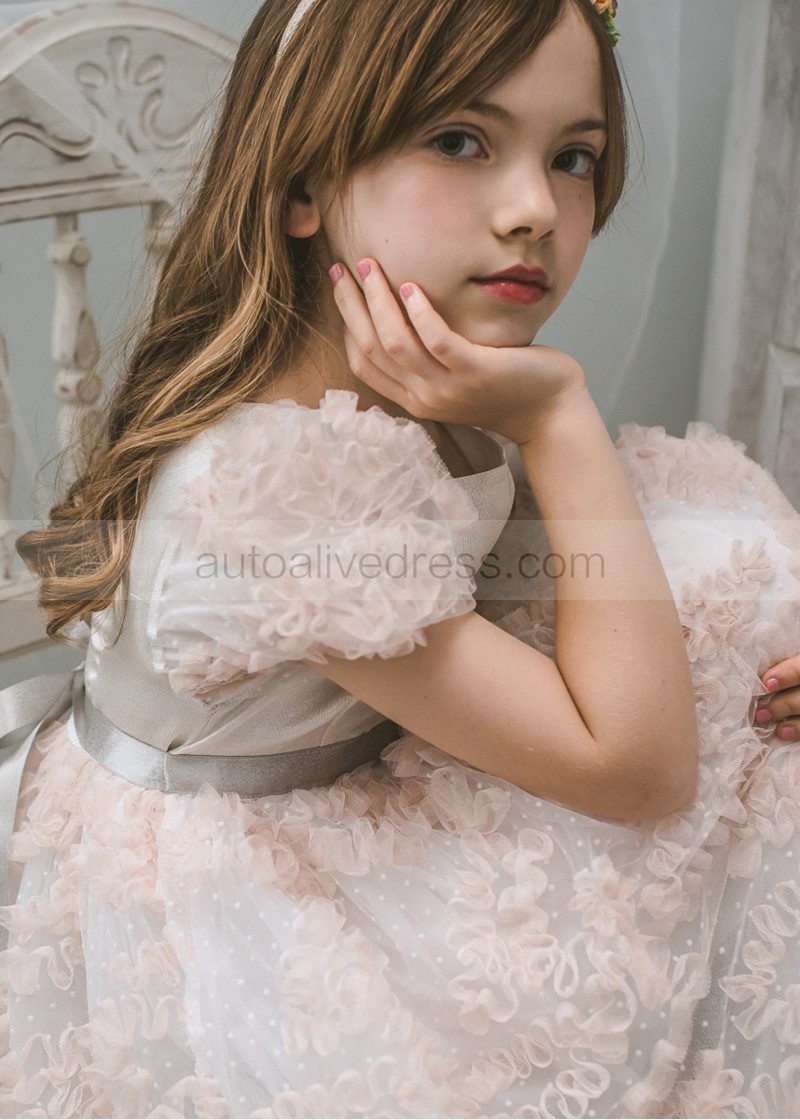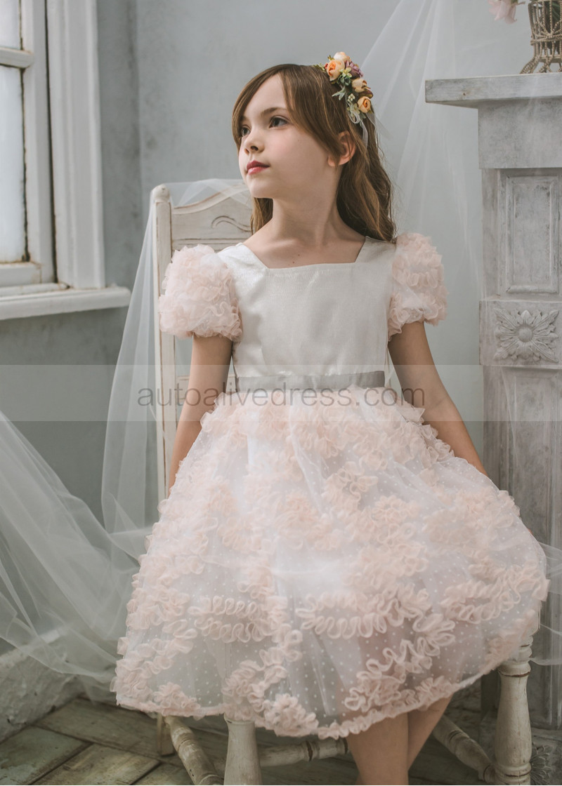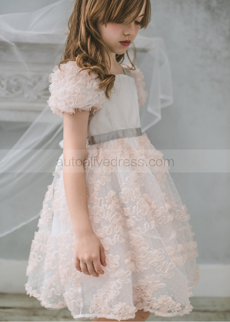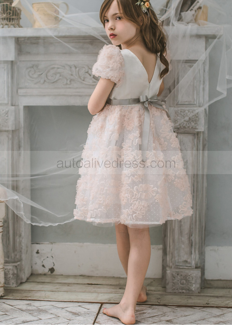 Short Sleeves Pink Dotted Tulle V Back Flower Girl Dress