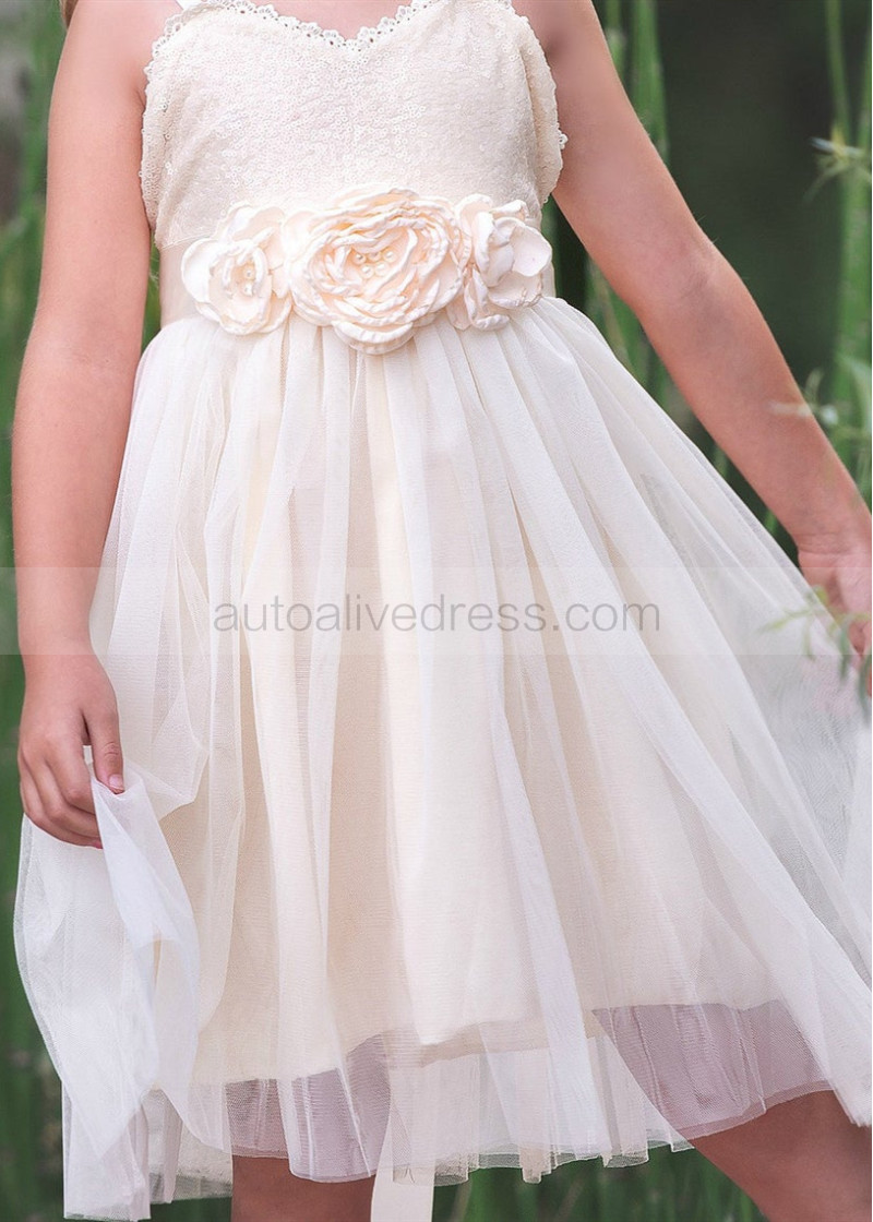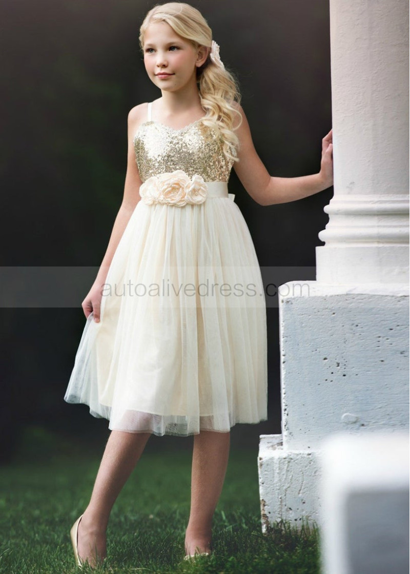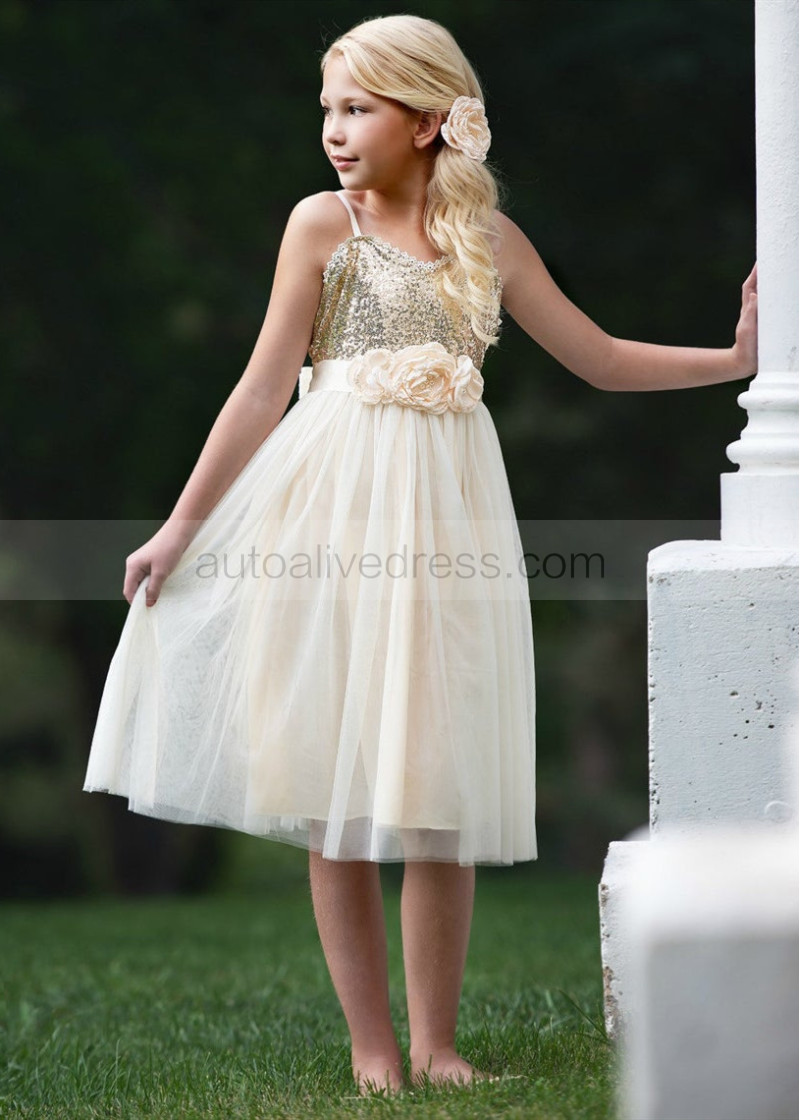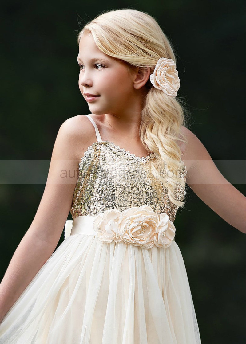 Spaghetti Straps Ivory Gold Sequin Tulle Boho Flower Girl Dress