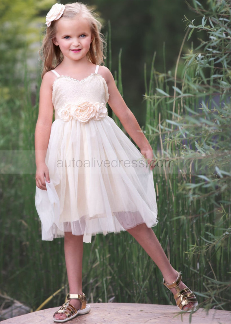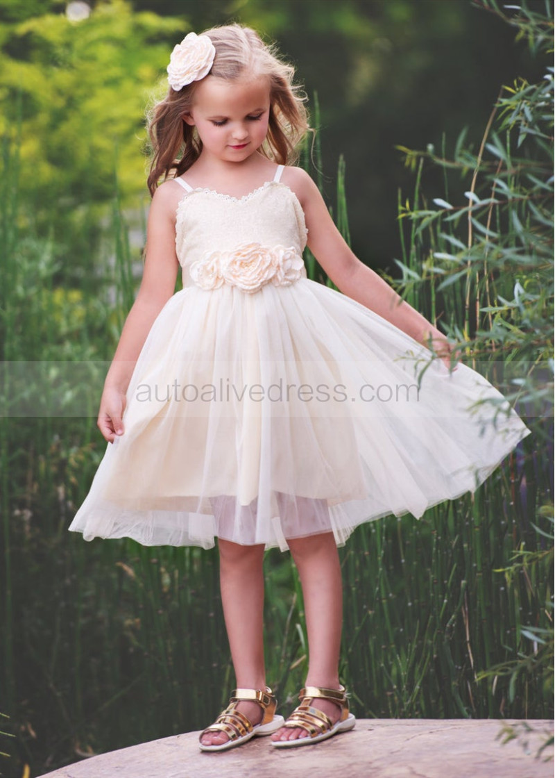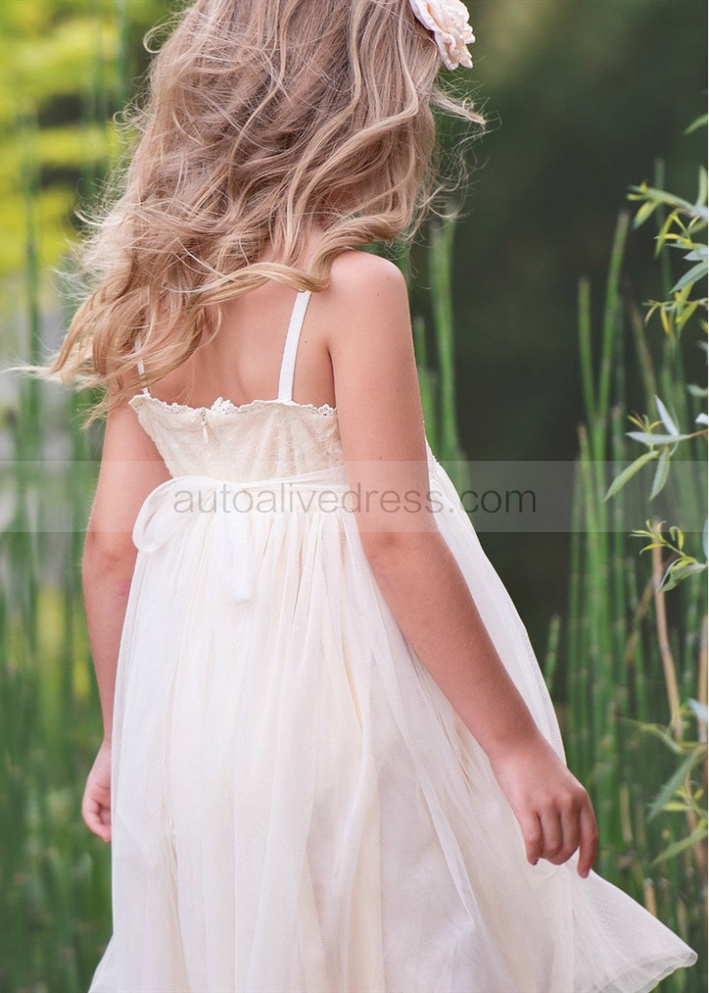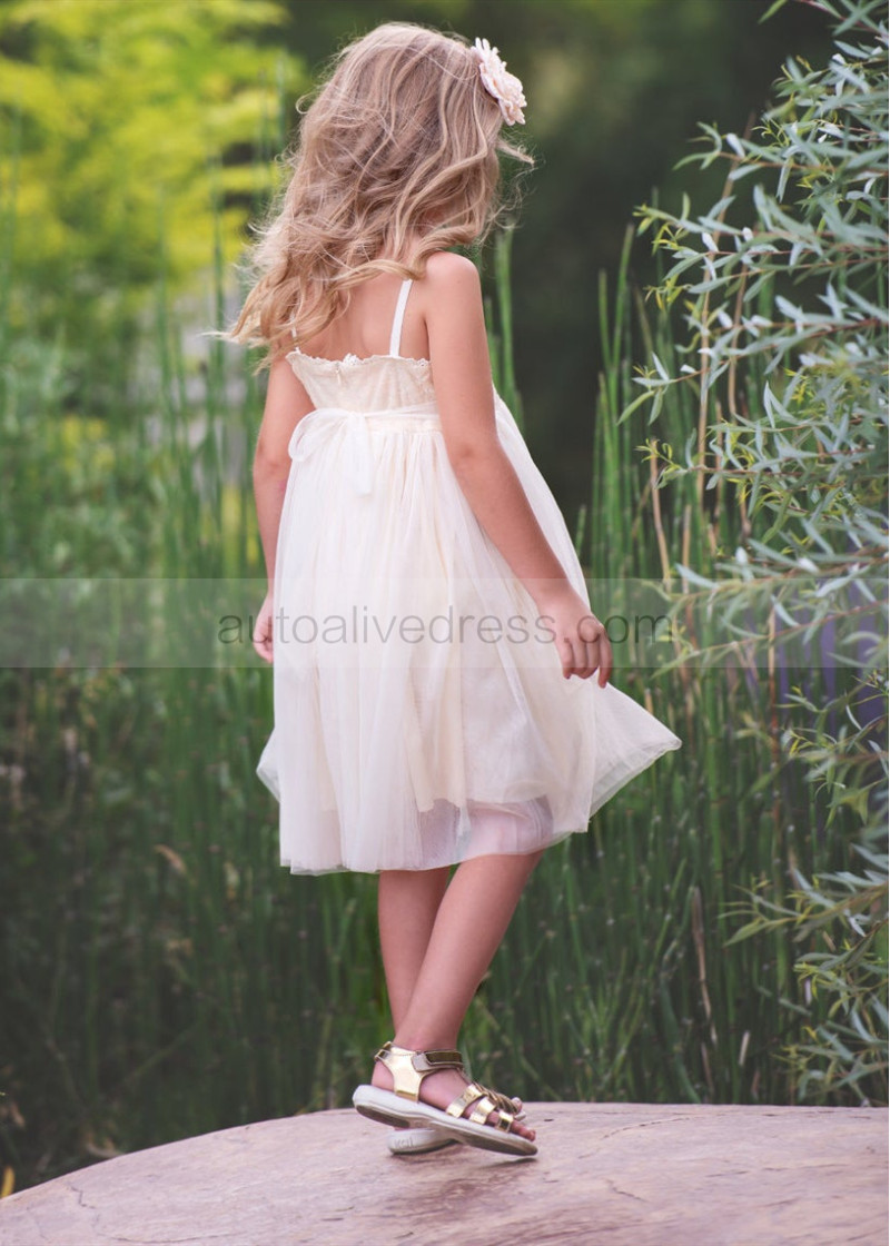 Spaghetti Straps Ivory Gold Sequin Tulle Boho Flower Girl Dress
