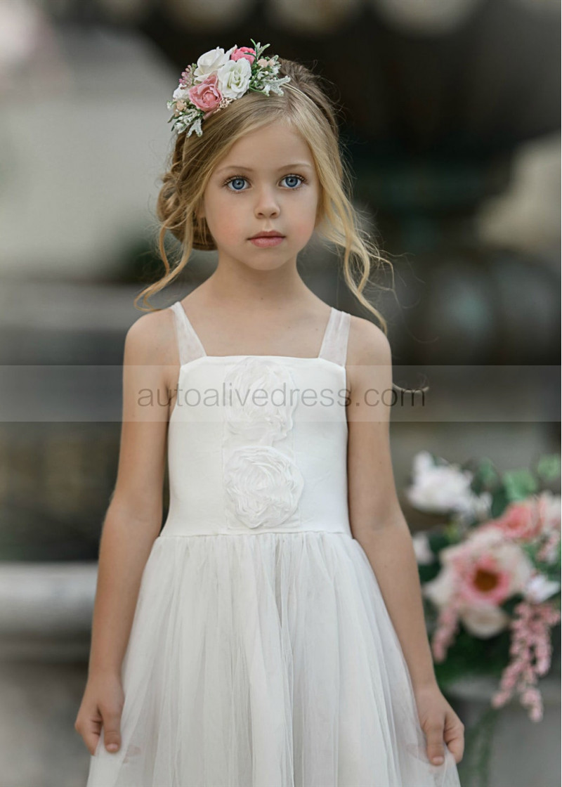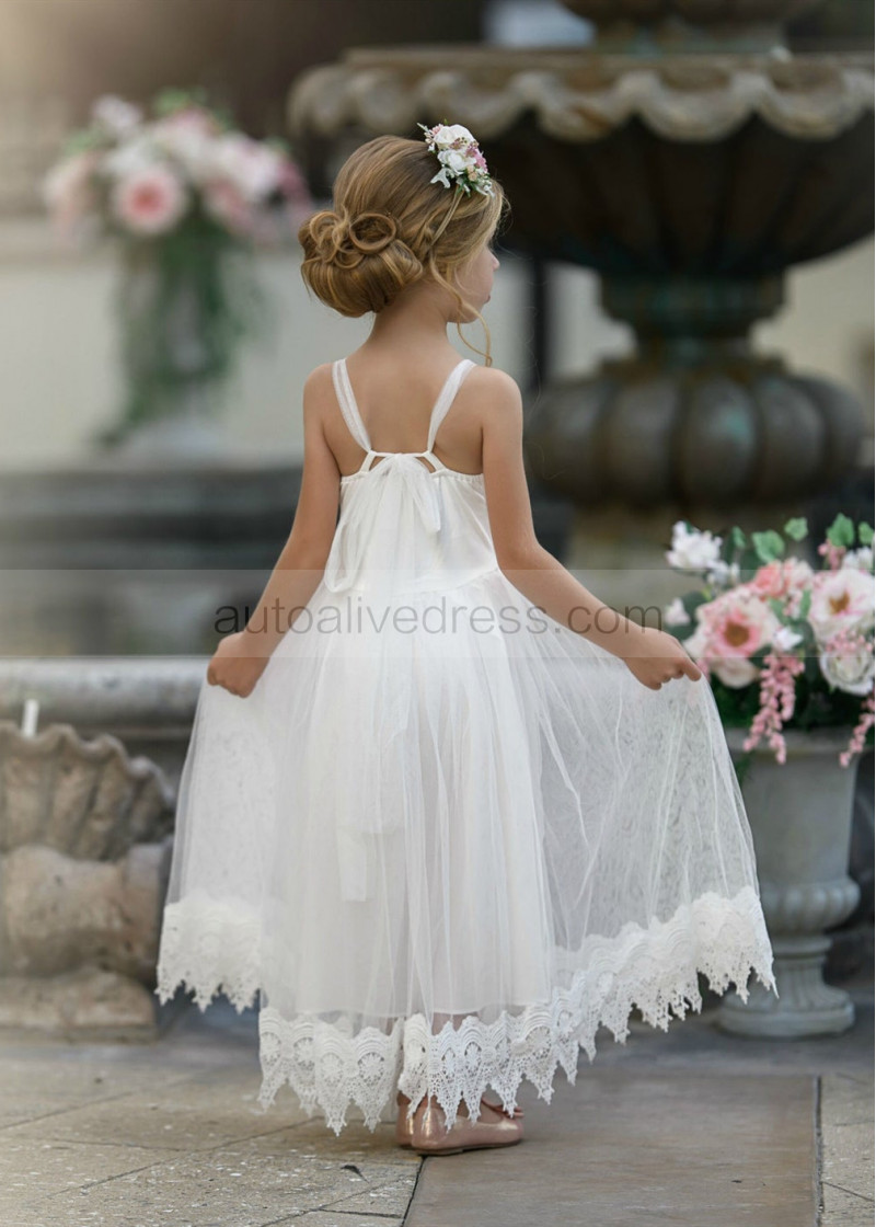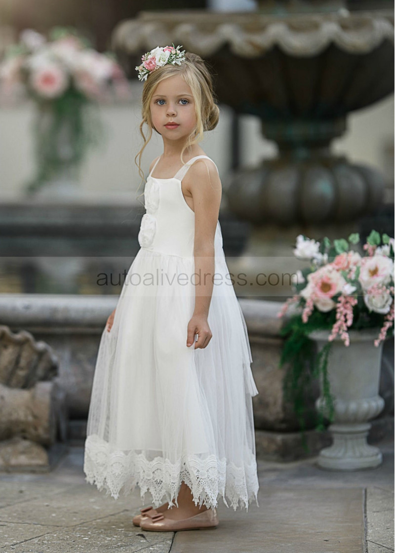 Straight Neck Ivory Lace Tulle Boho Flower Girl Dress