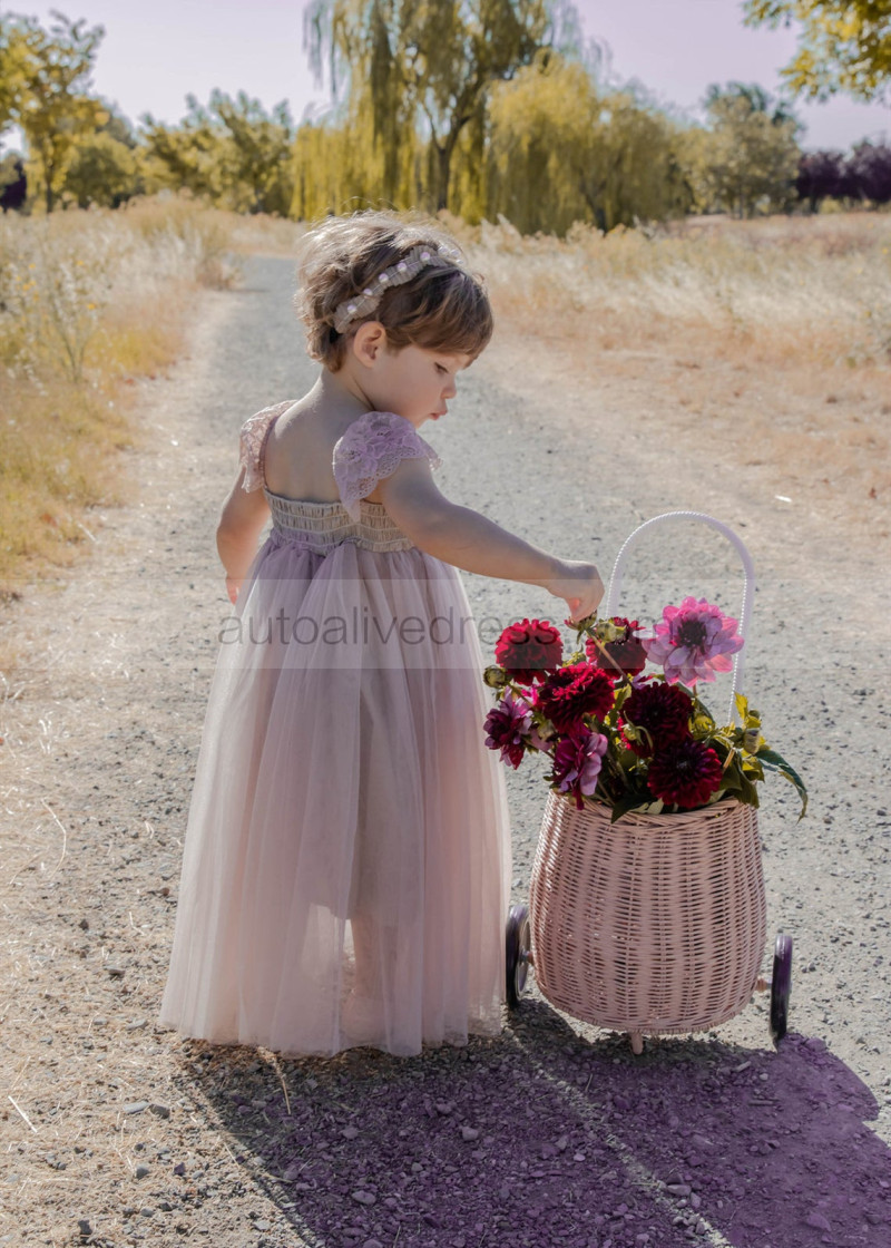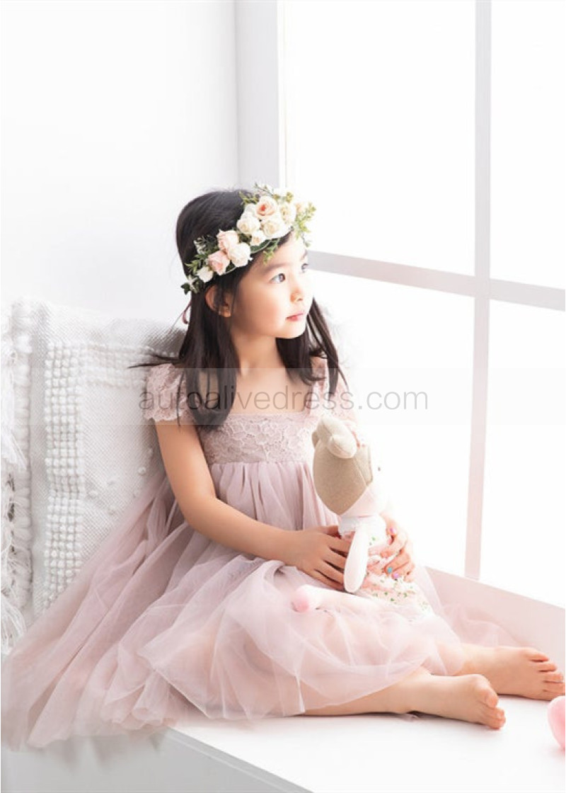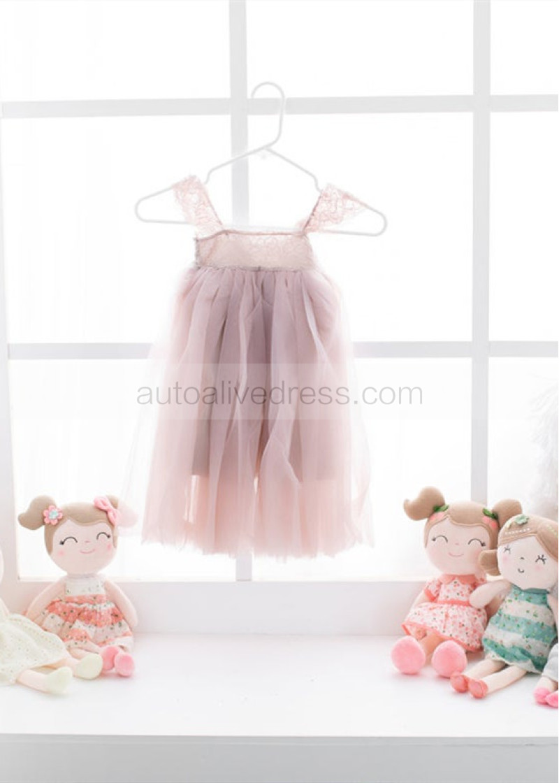 Taupe Lace Tulle Floor Length Romantic Wedding Flower Girl Dress