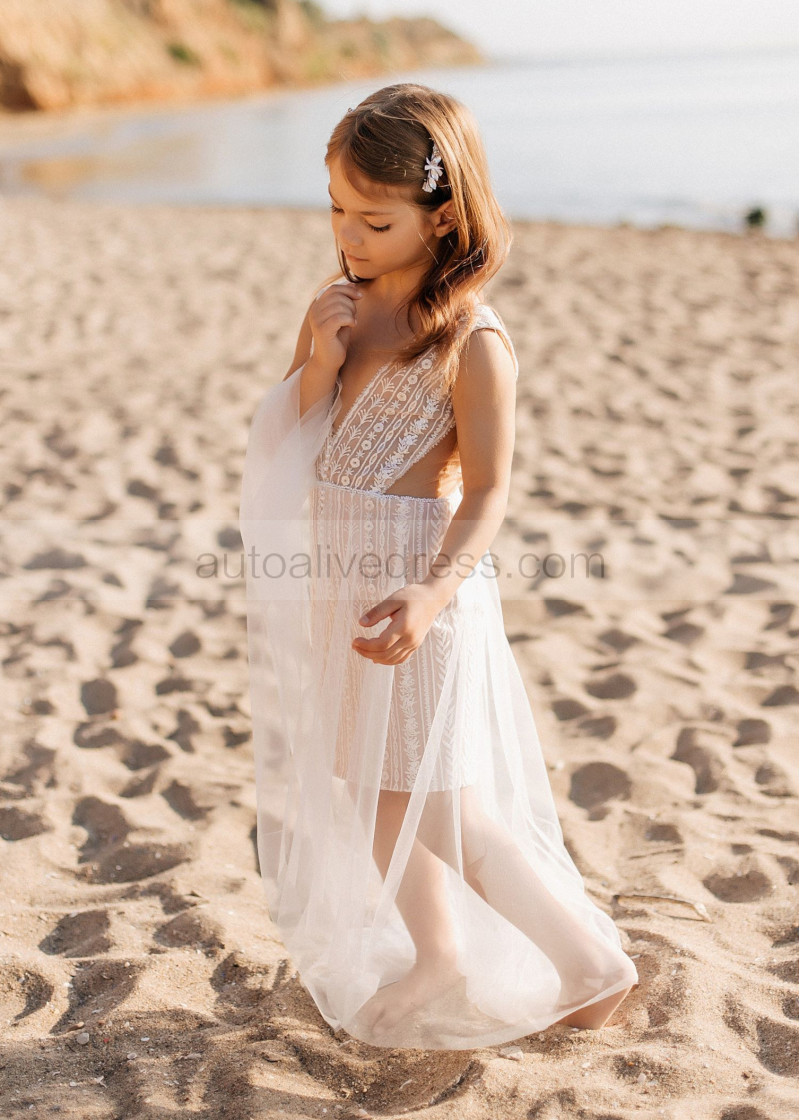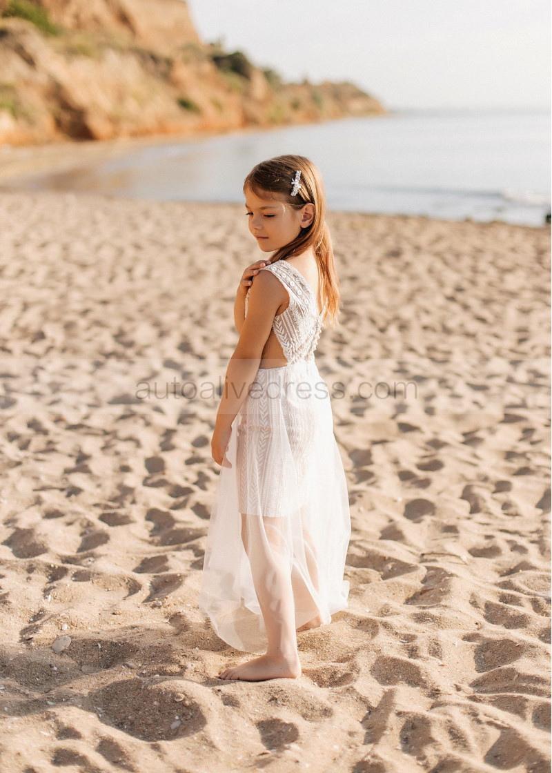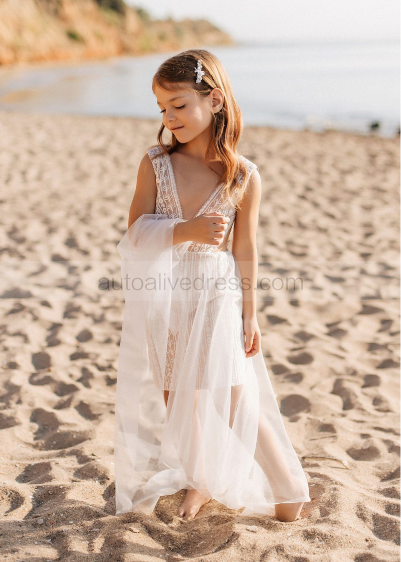 V Neck Beaded Ivory Lace Tulle Bohemian Flower Girl Dress
