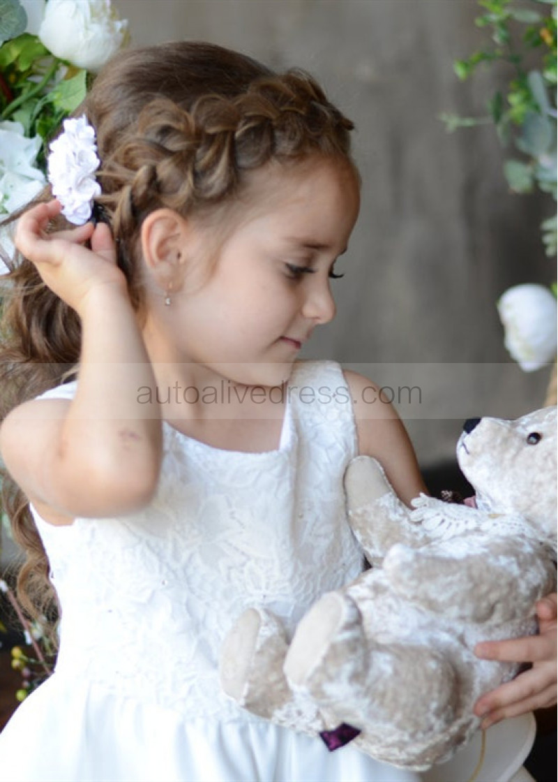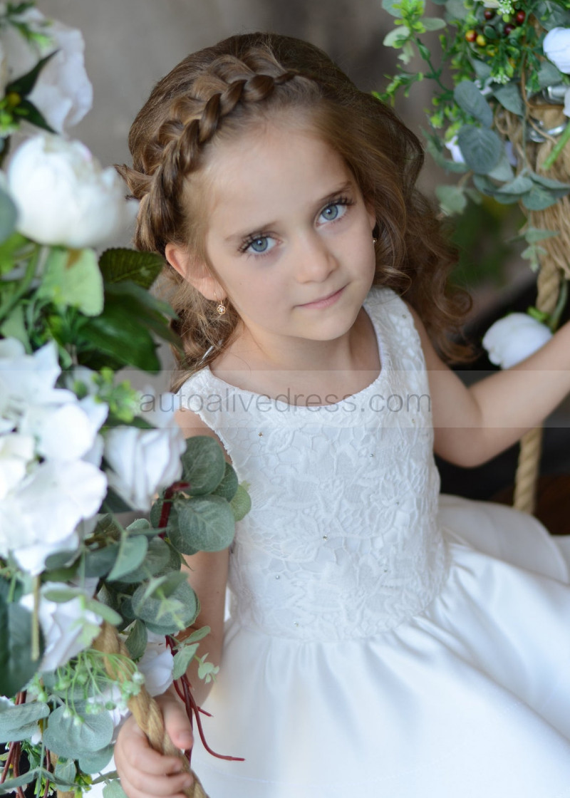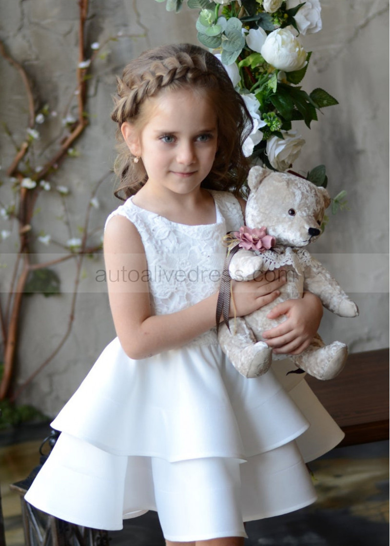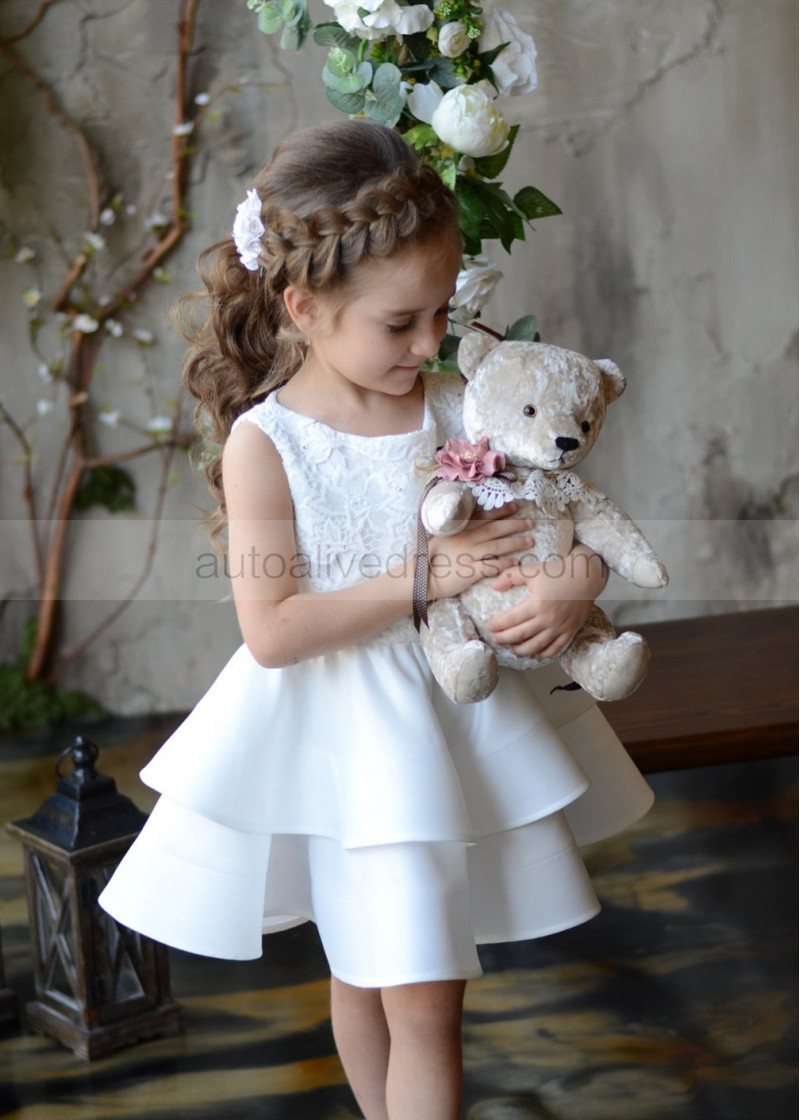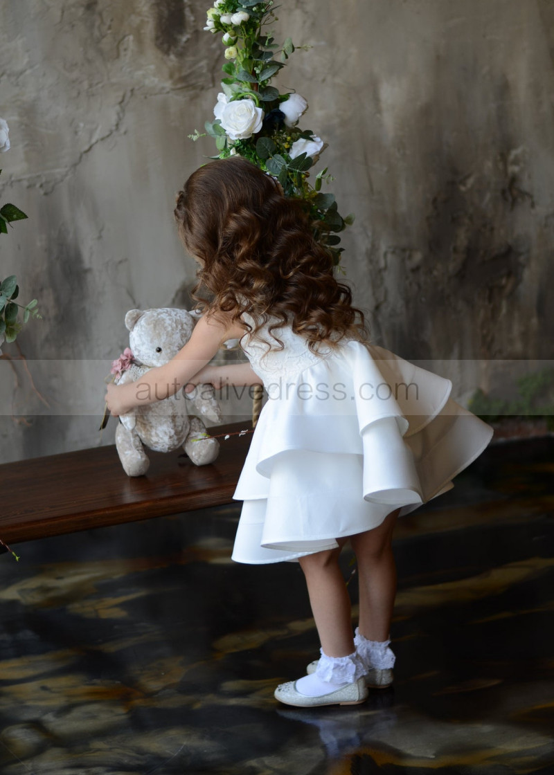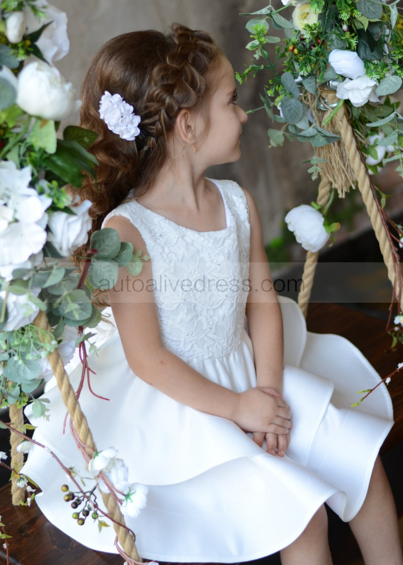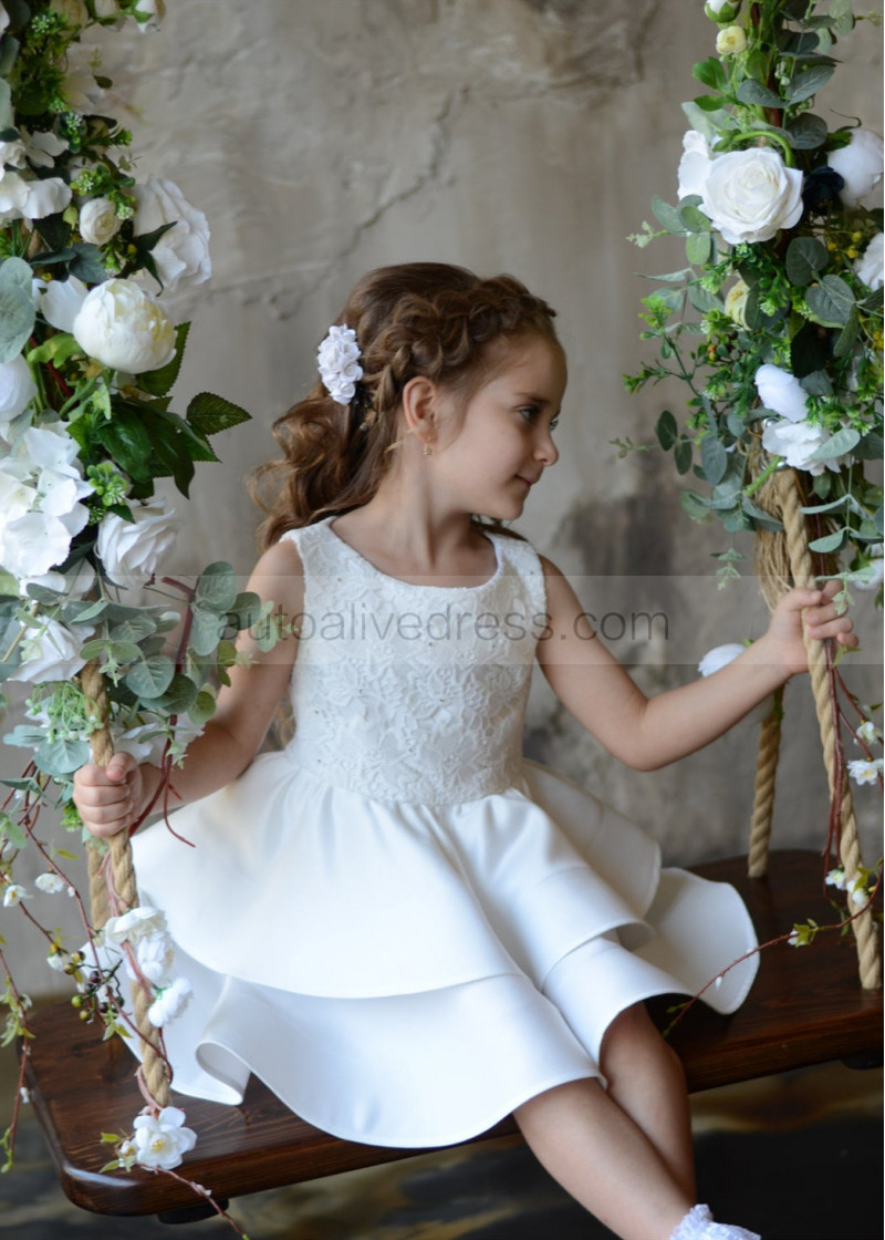 White Lace Satin Layered Flower Girl Dress First Birthday Dress