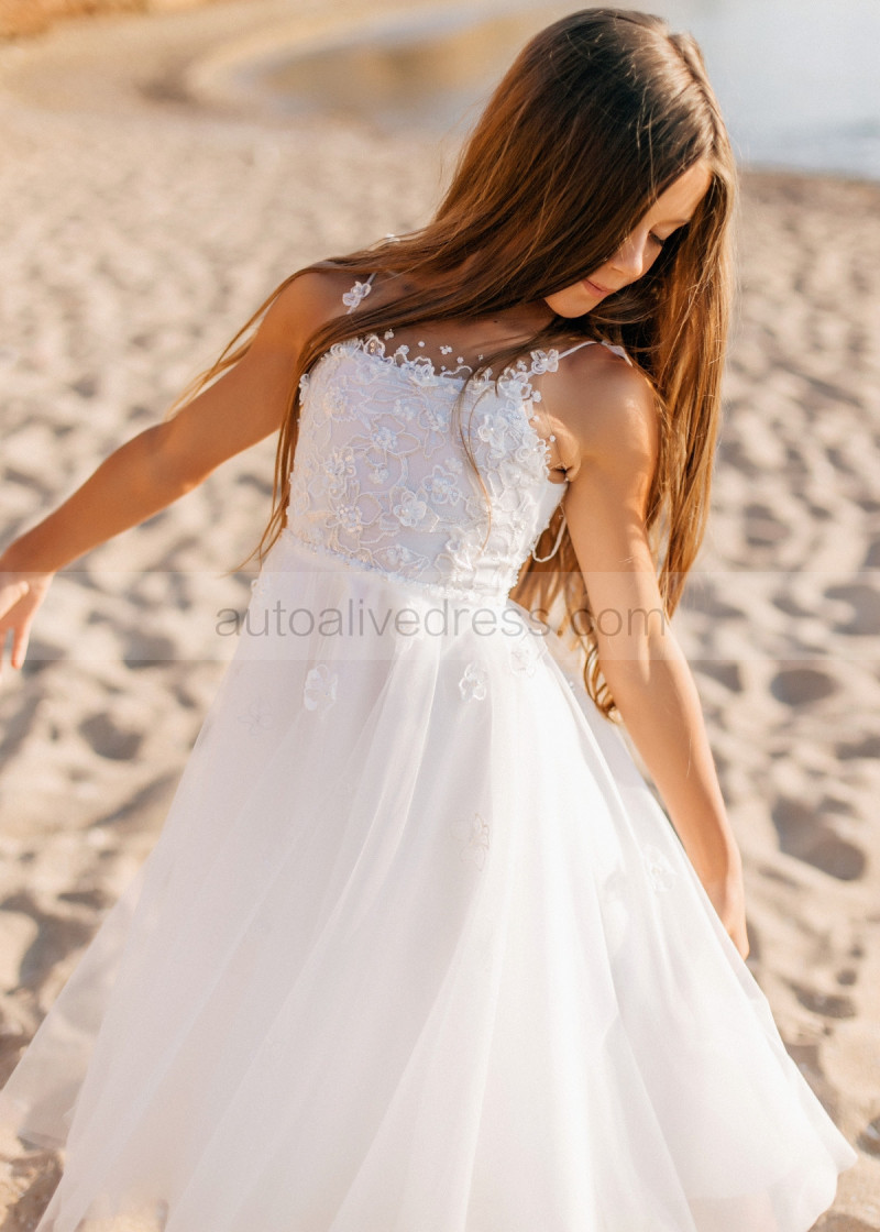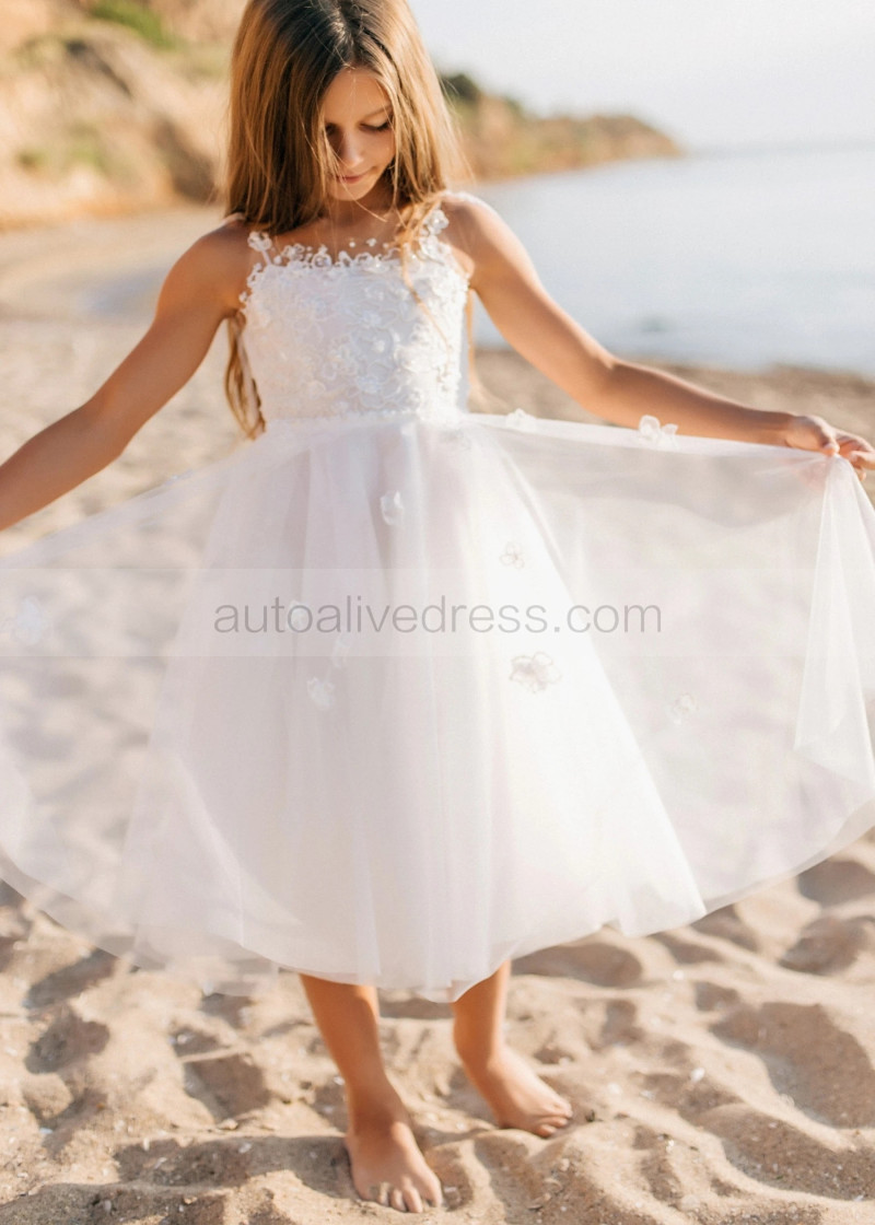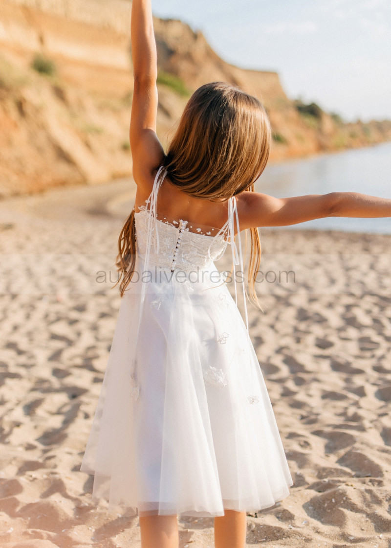 White Lace Tulle Pearl Buttons Back Boho Flower Girl Dress