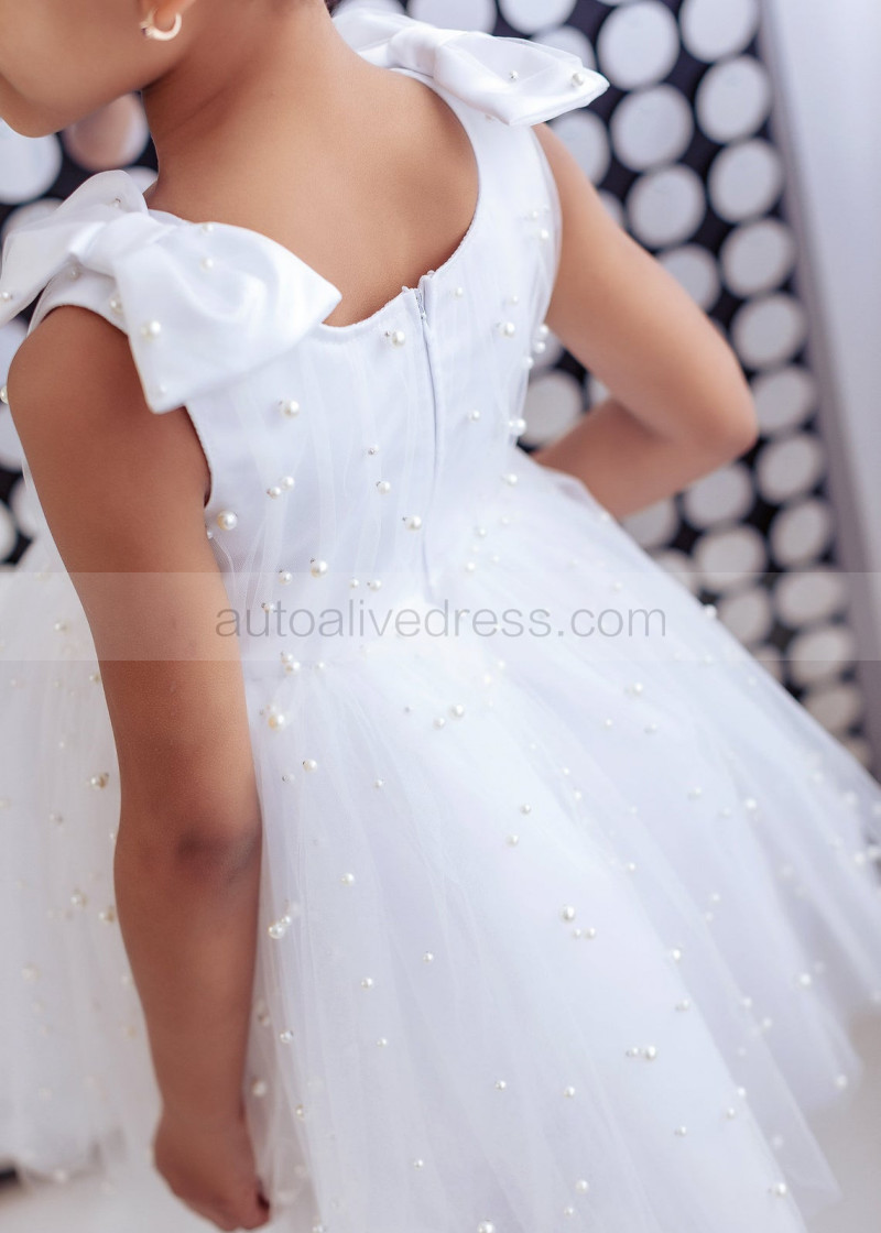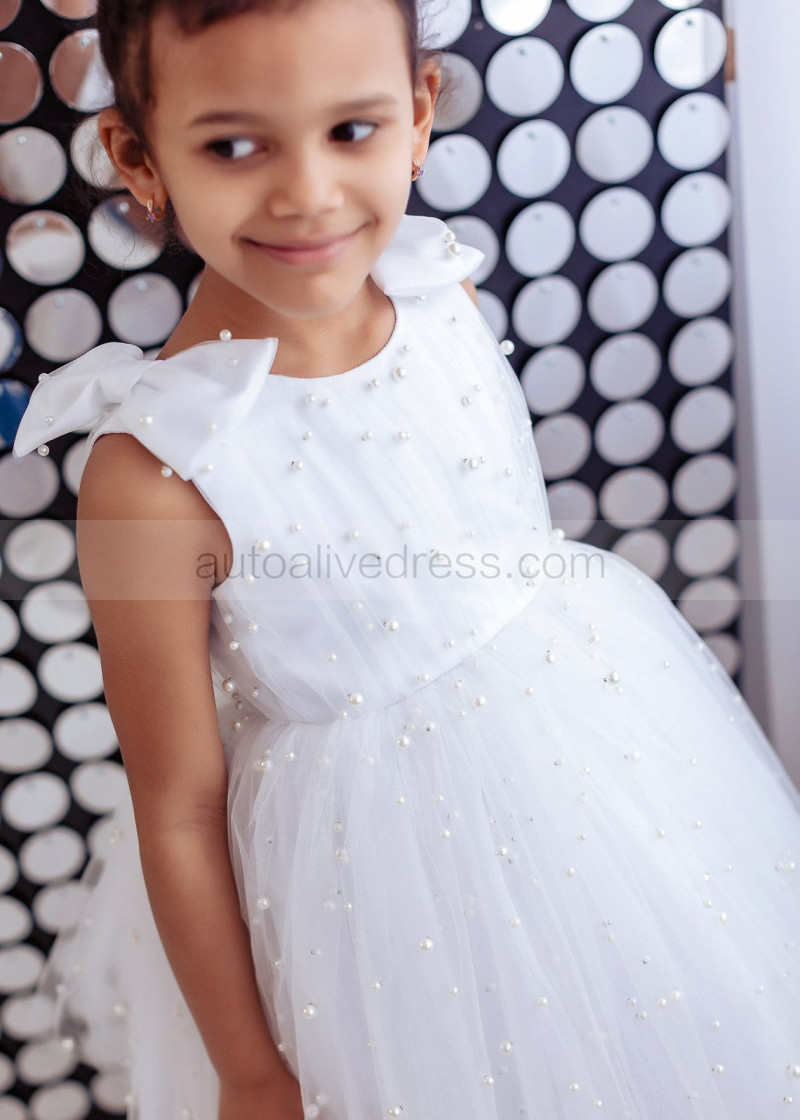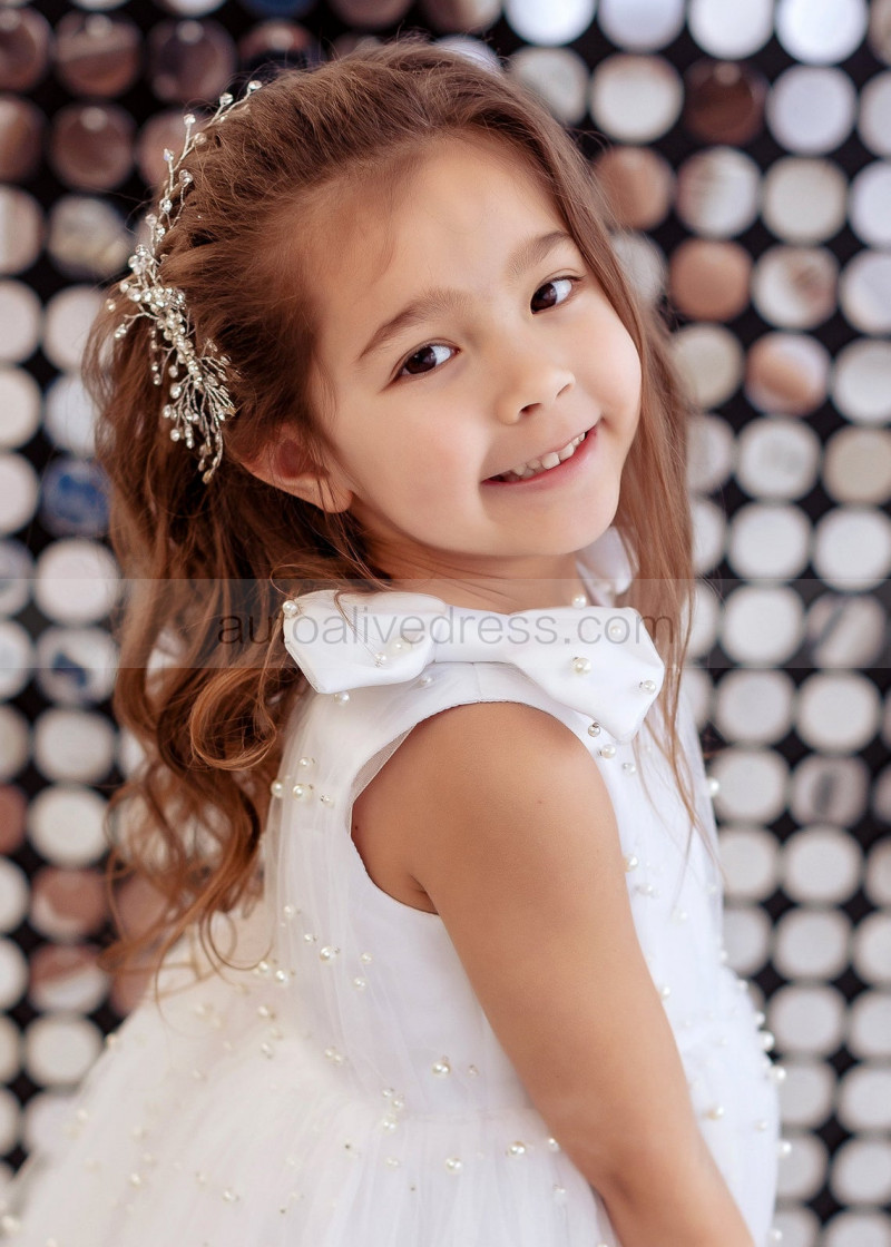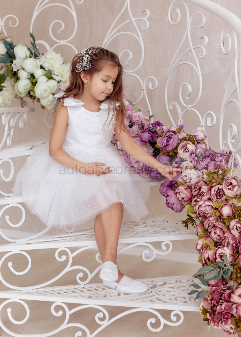 White Satin Tulle Pearl Beading Rustic Flower Girl Dress