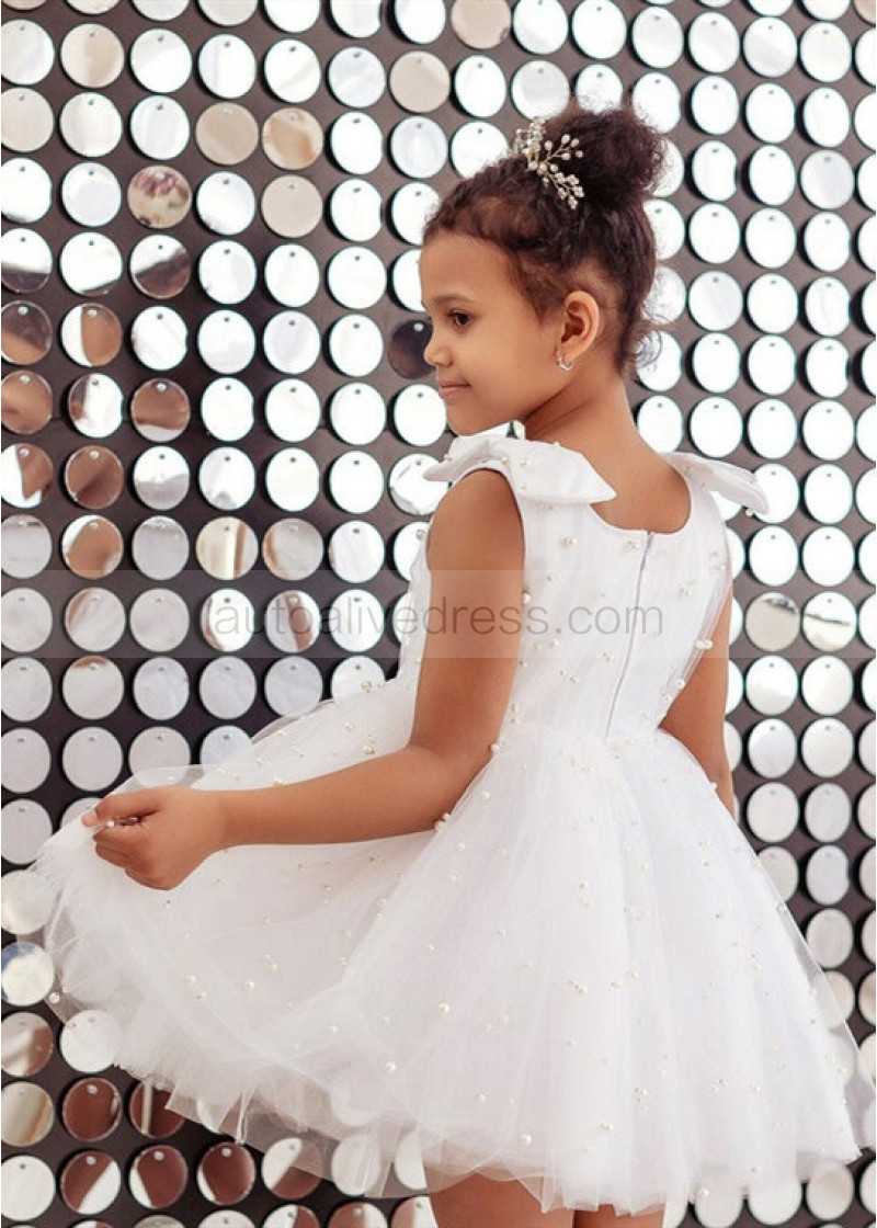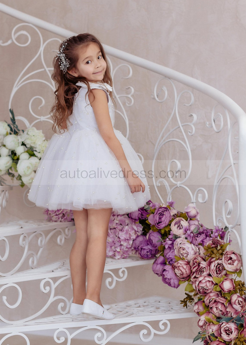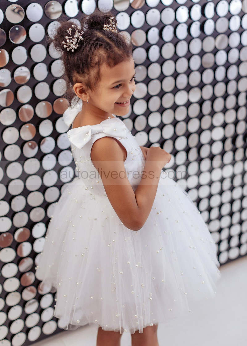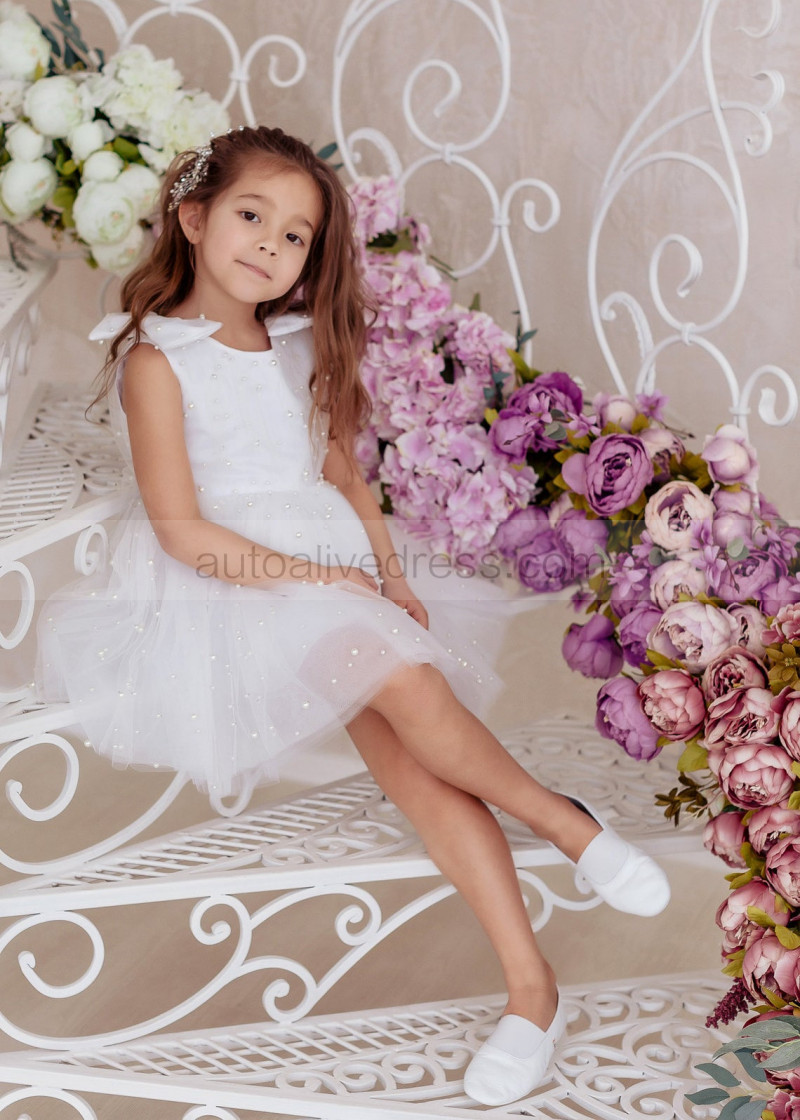 White Satin Tulle Pearl Beading Rustic Flower Girl Dress