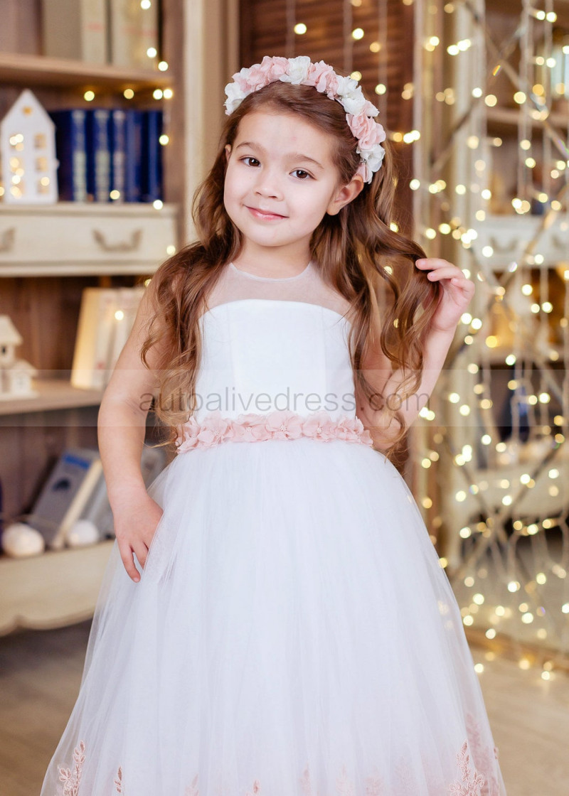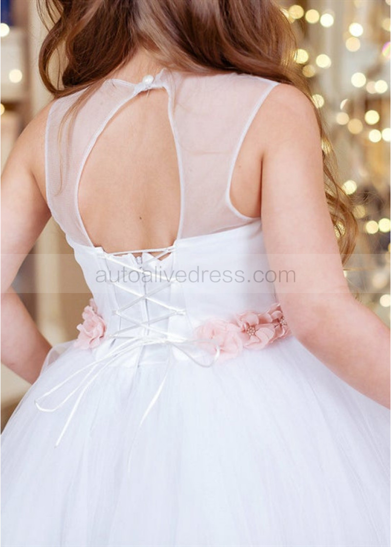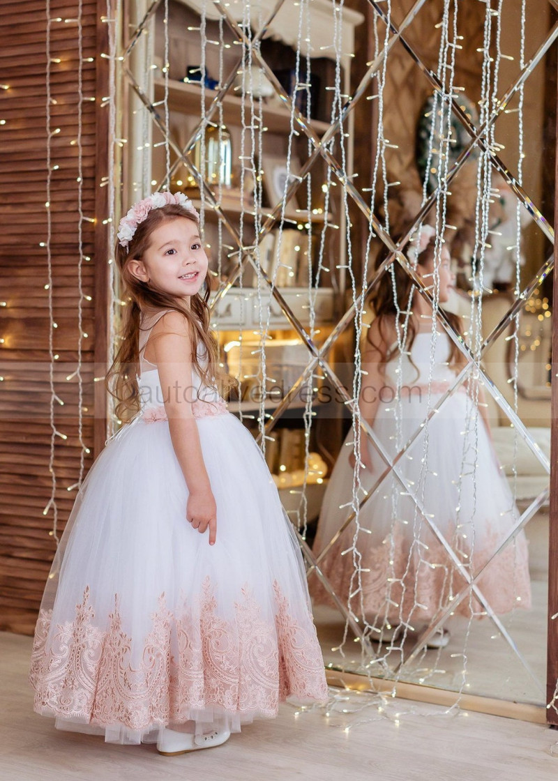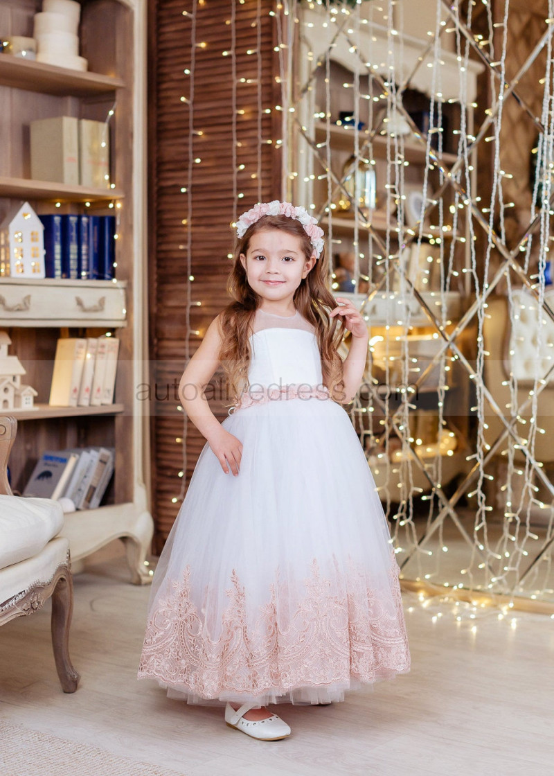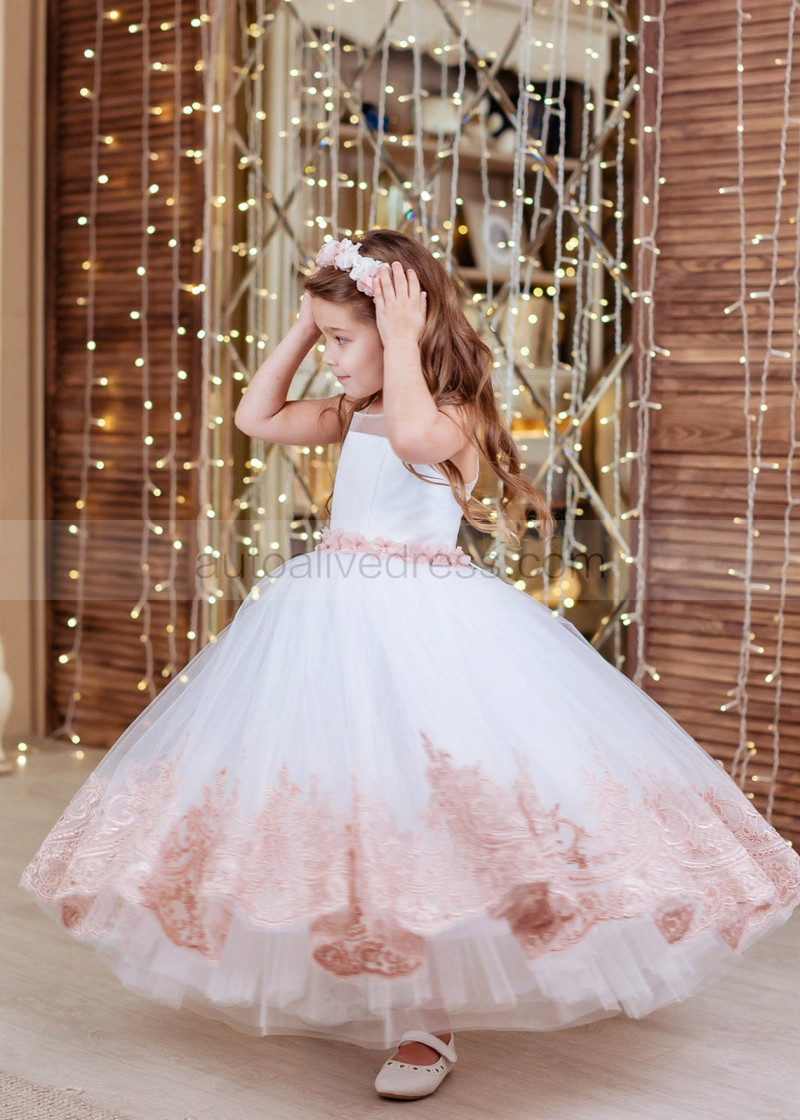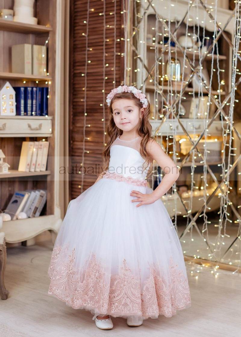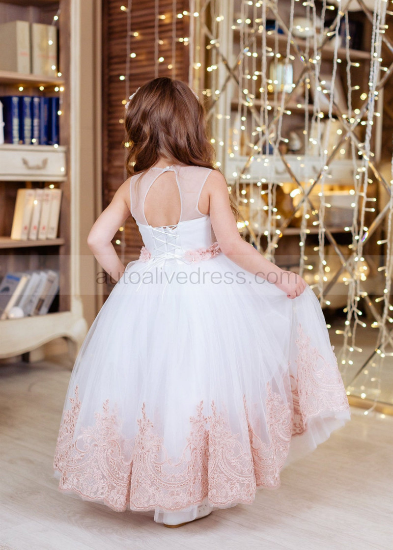 White Tulle Rose Pink Lace Ankle Length Flower Girl Dress