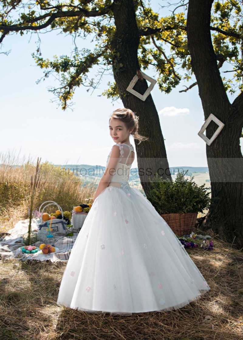 Beaded 3D Flowers Tulle Keyhole Back Fairytale Flower Girl Dress