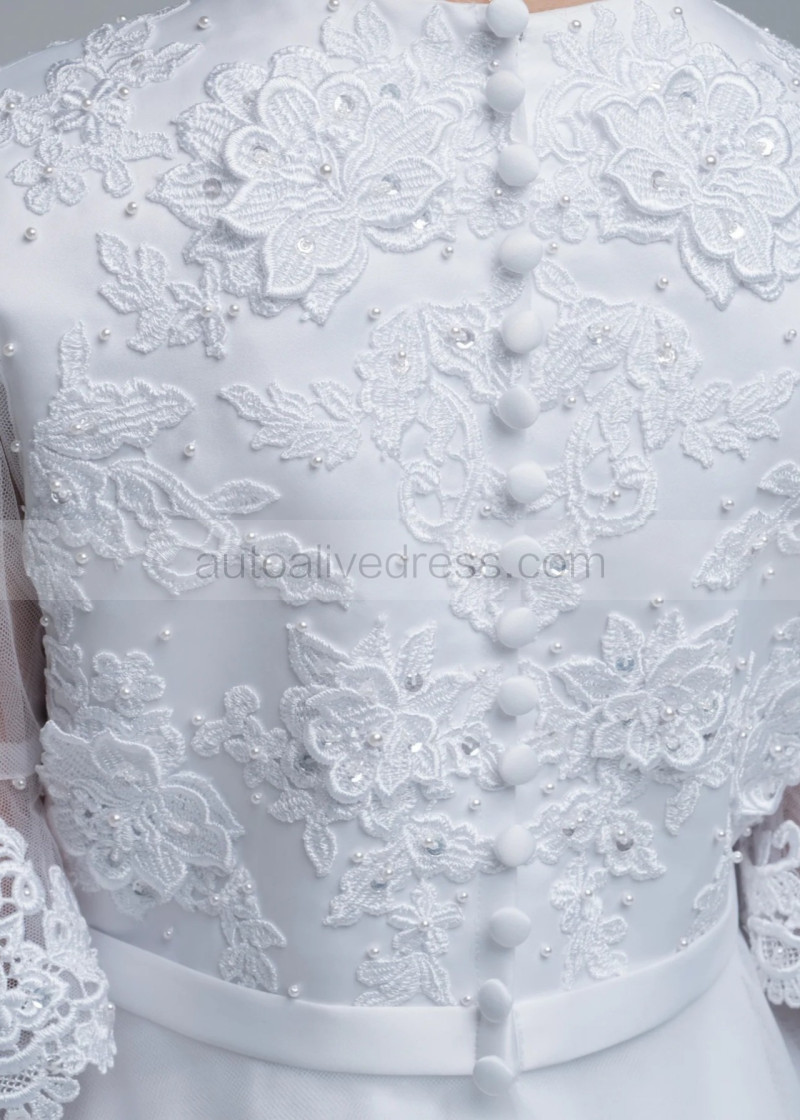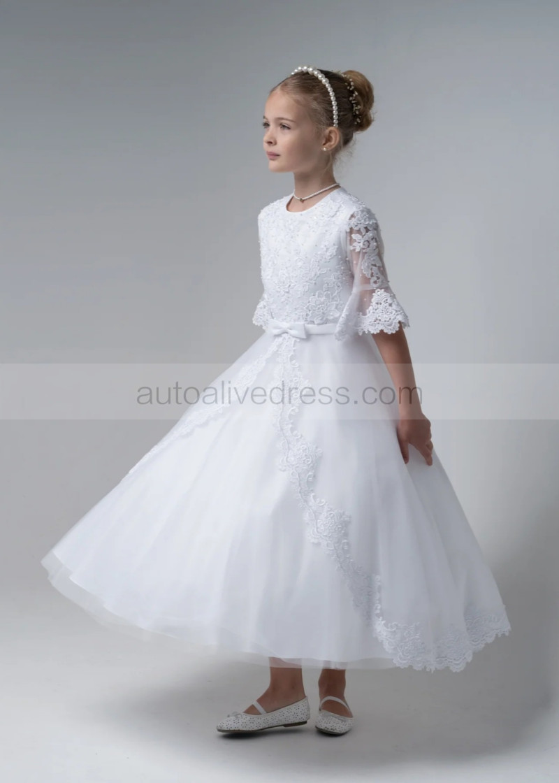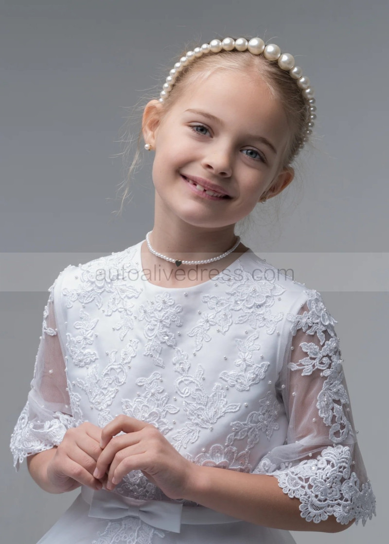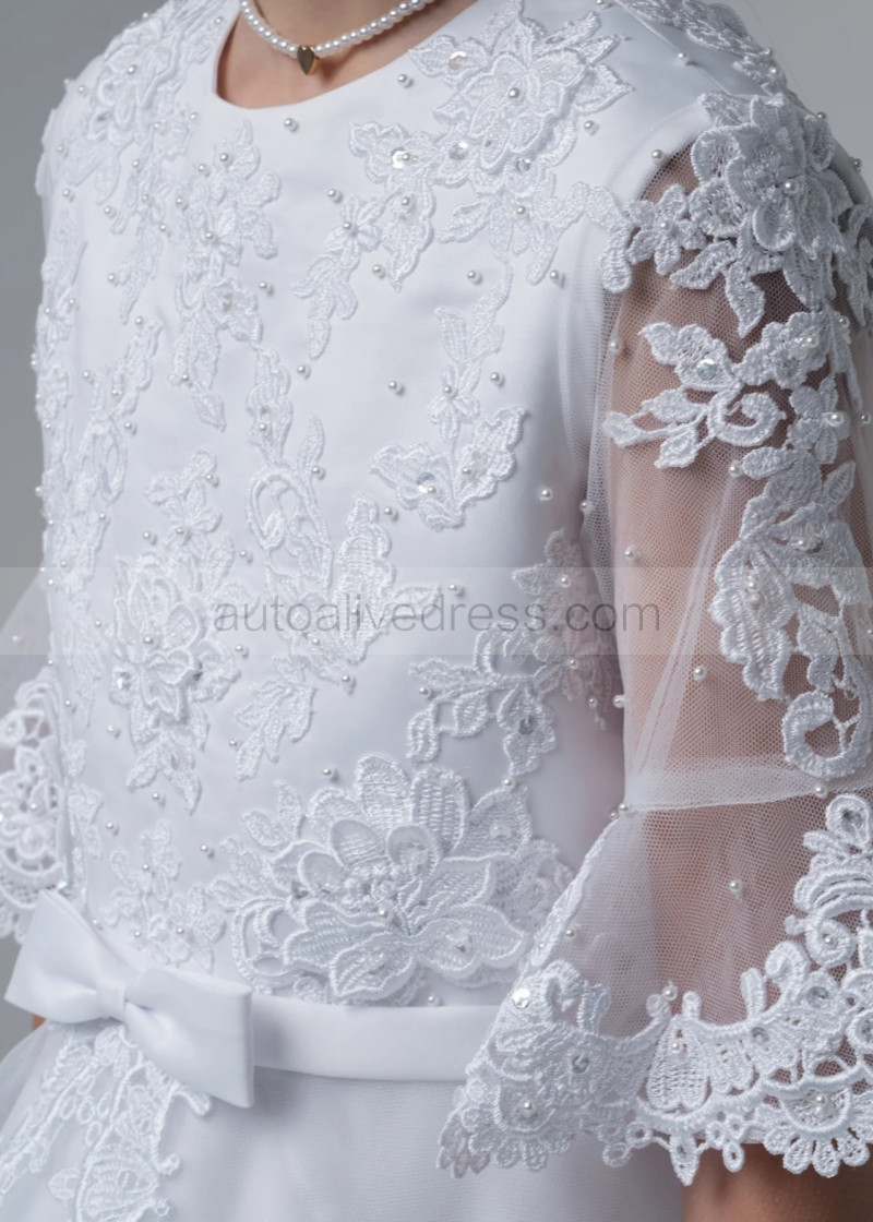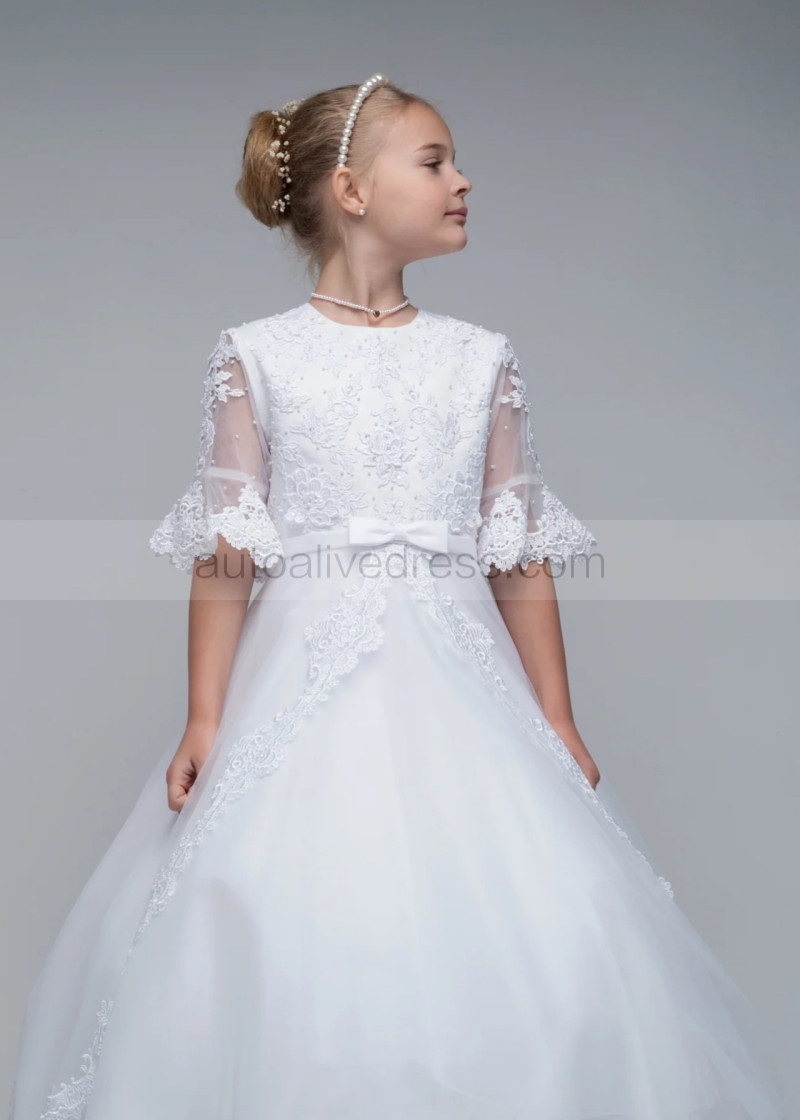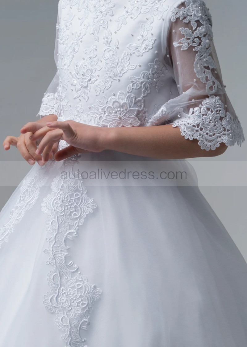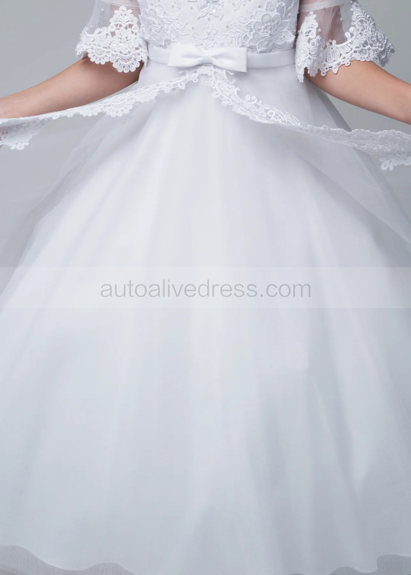 Beaded Elbow Sleeves White Lace Tulle Flower Girl Dress