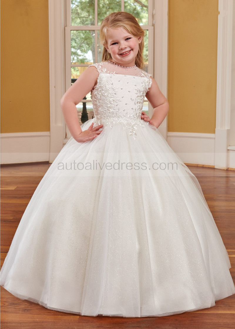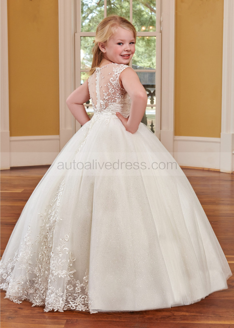 Beaded Ivory Lace Glitter Tulle Illusion Back Flower Girl Dress