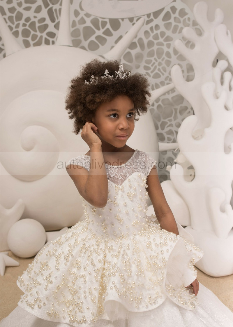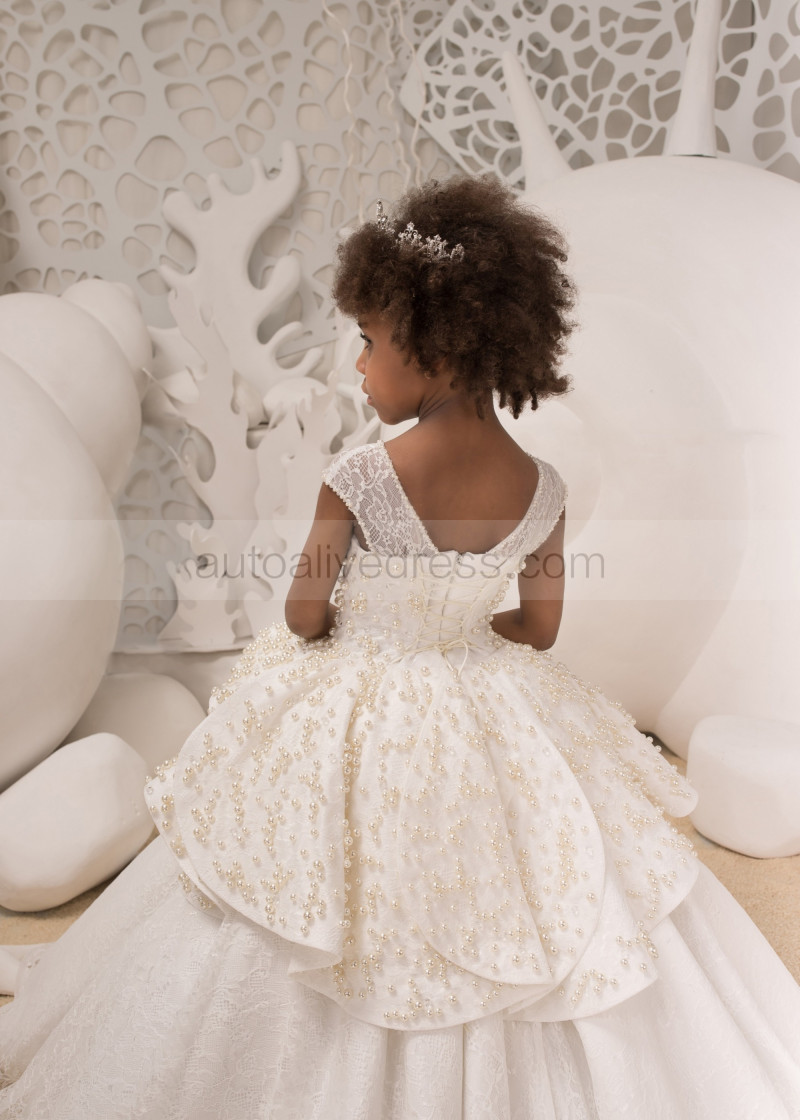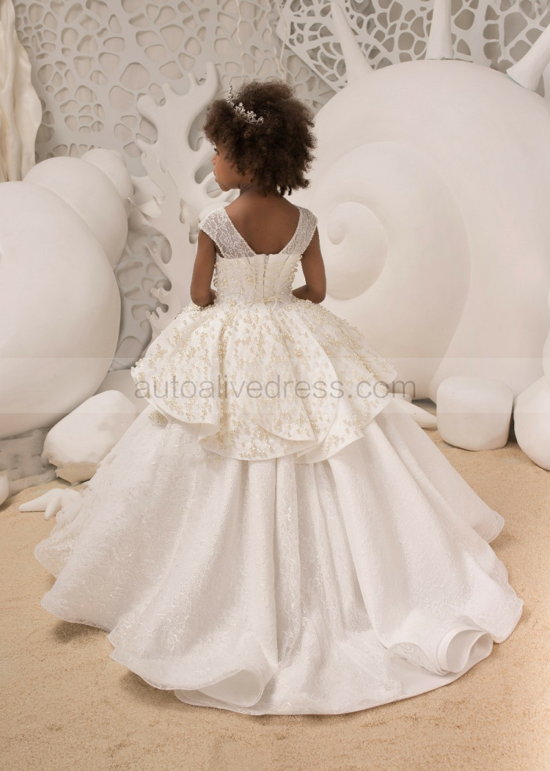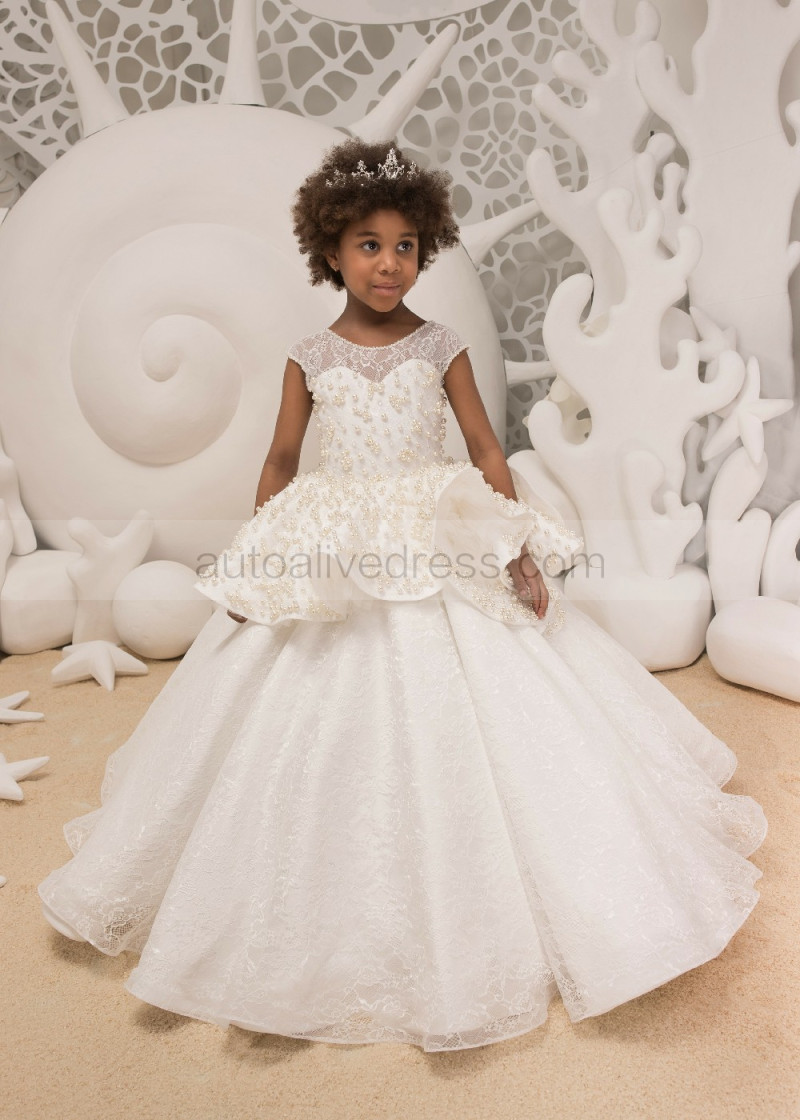 Beaded Ivory Lace Tulle Peplum Flower Girl Dress