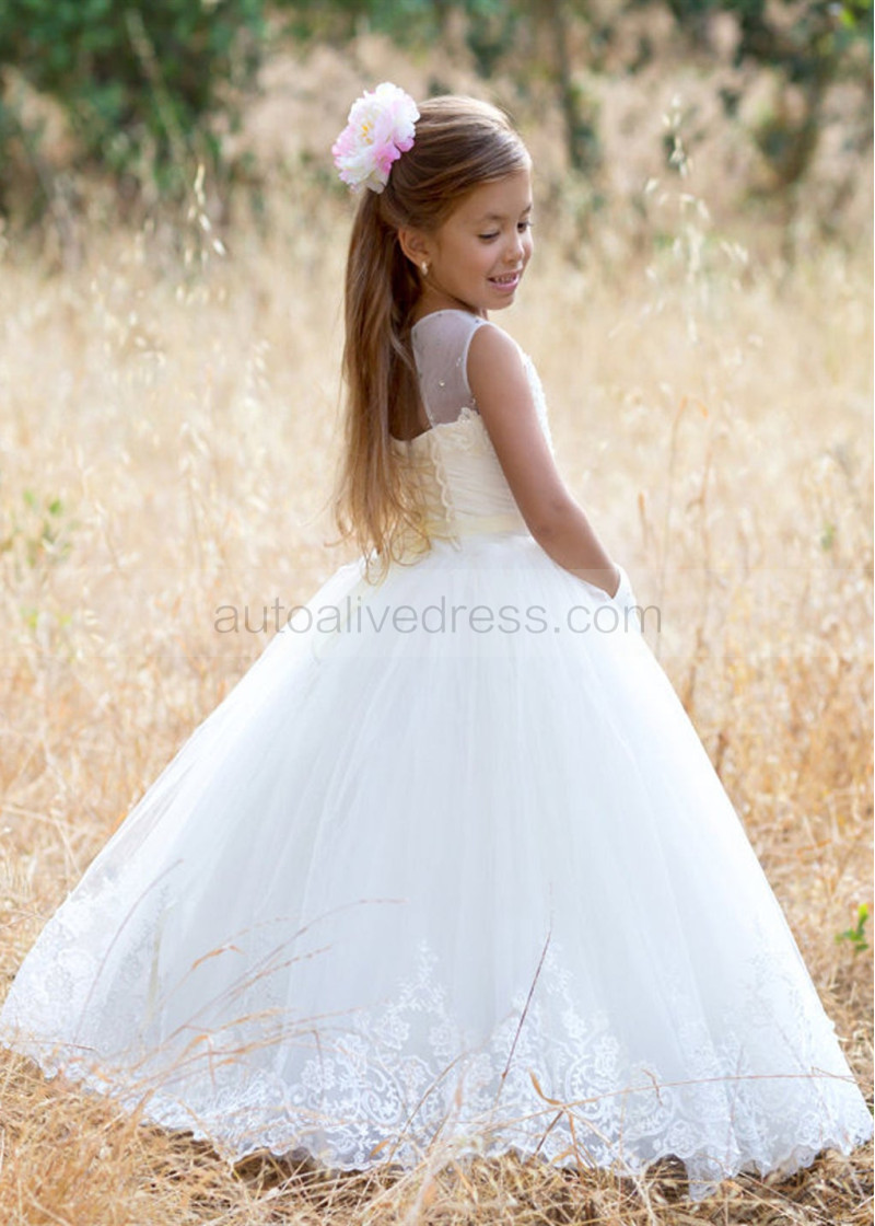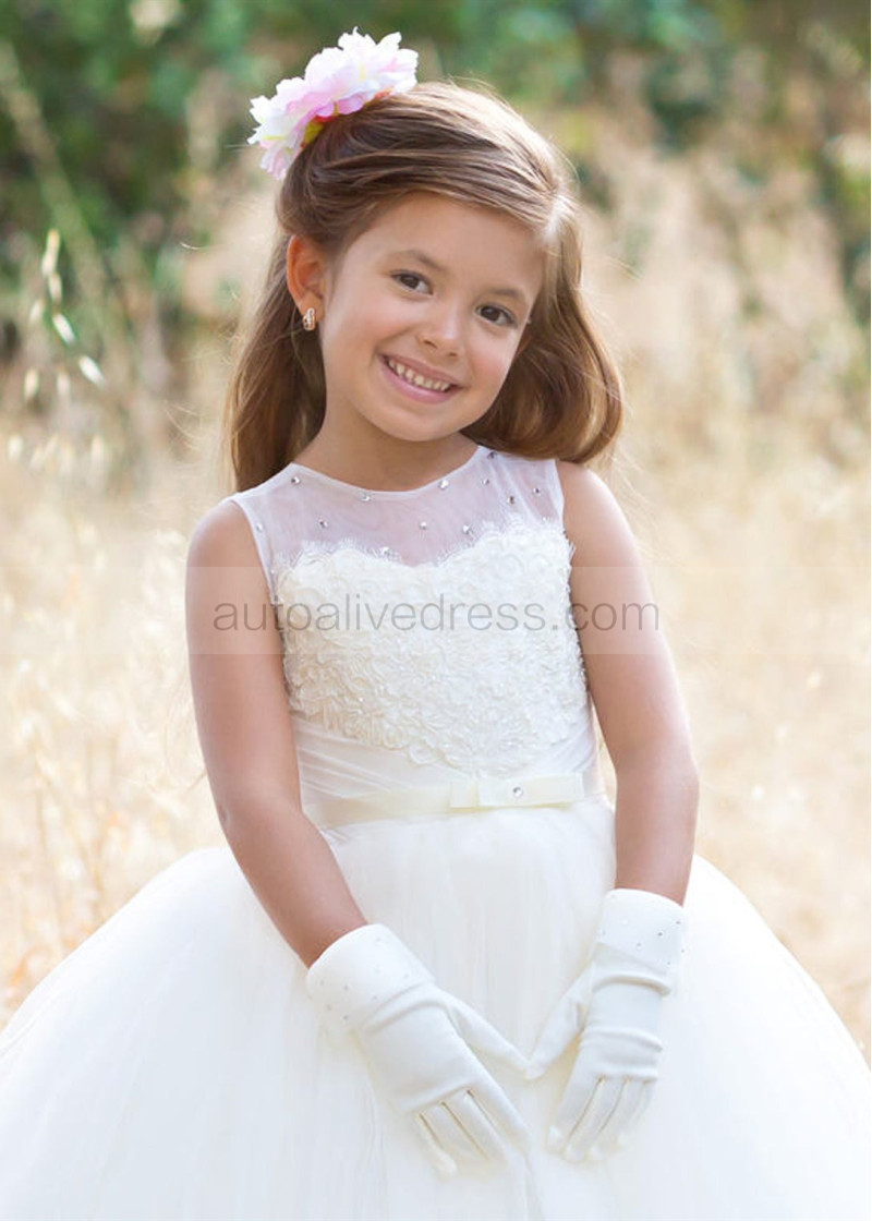 Beaded Ivory Lace Tulle Sweet Flower Girl Dress With Bow