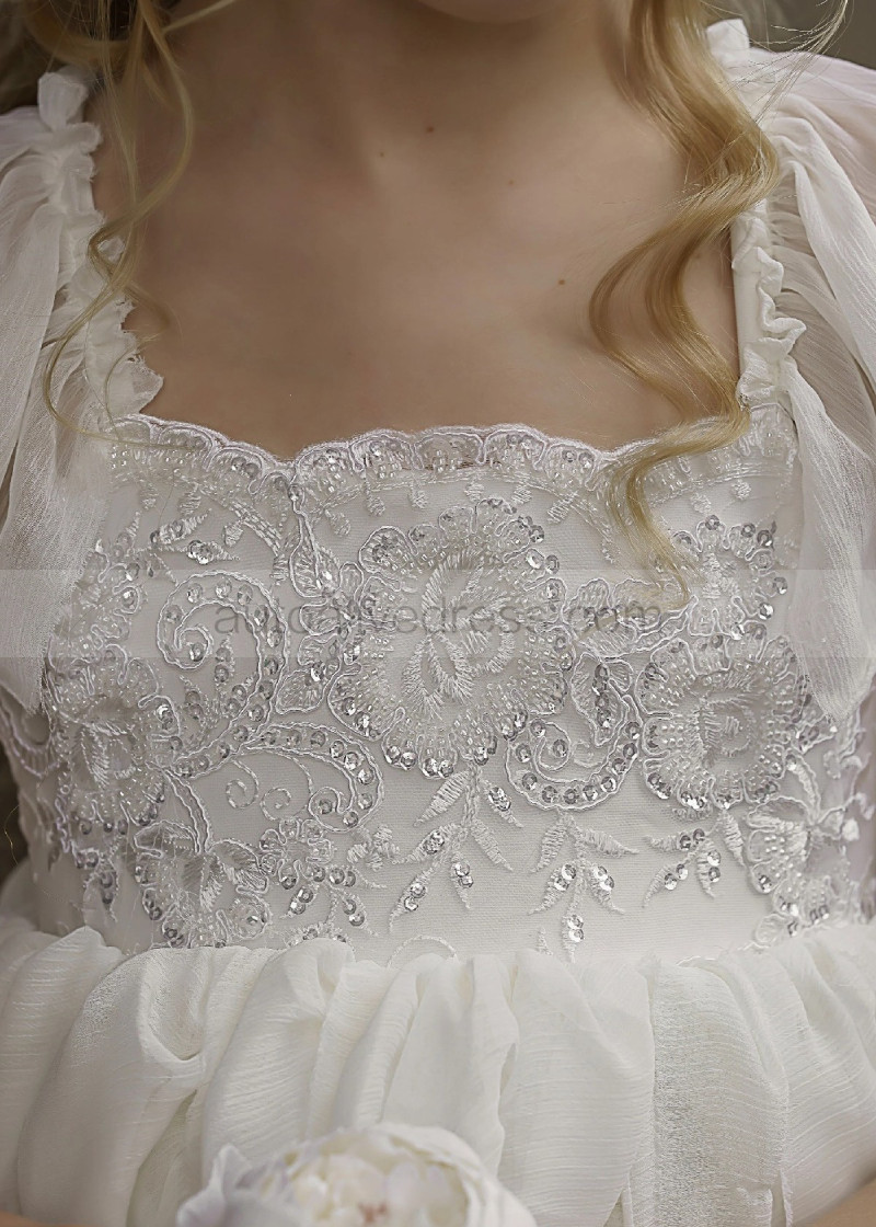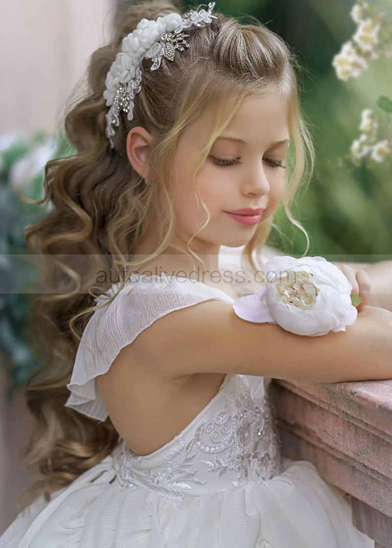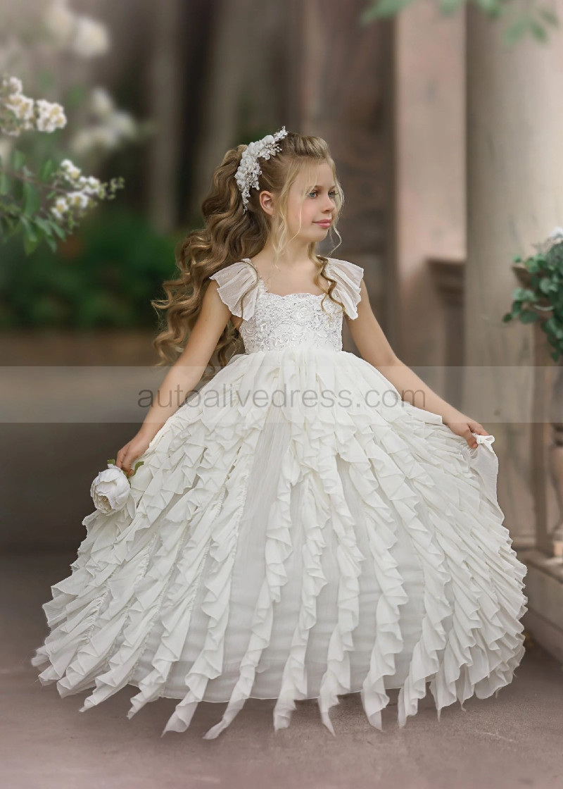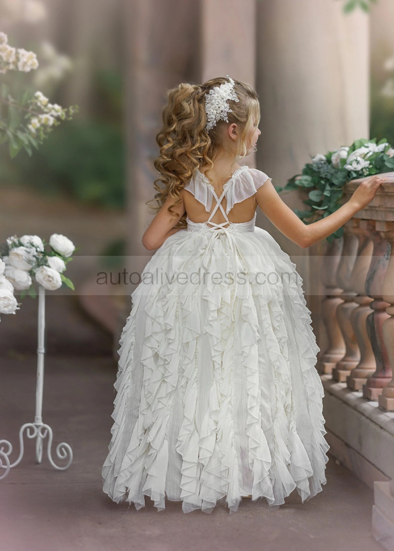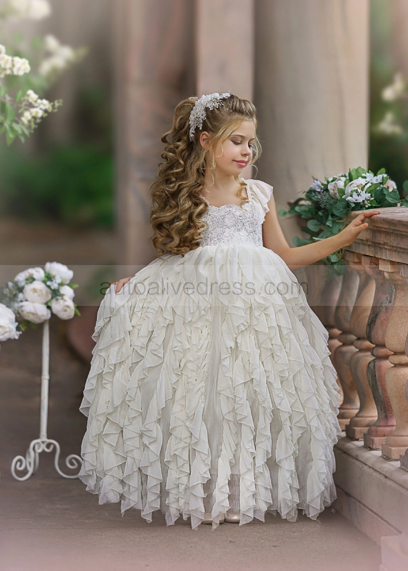 Beaded Ivory Lace Wrinkled Chiffon Ruffled Flower Girl Dress