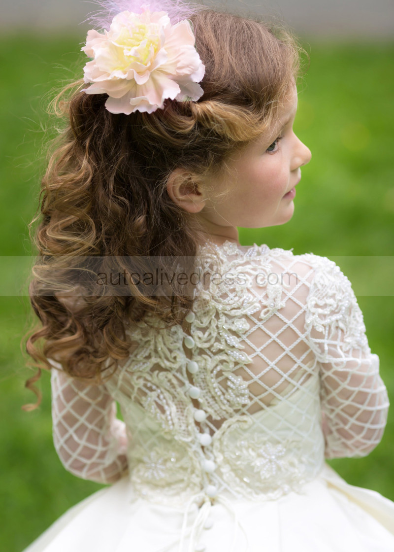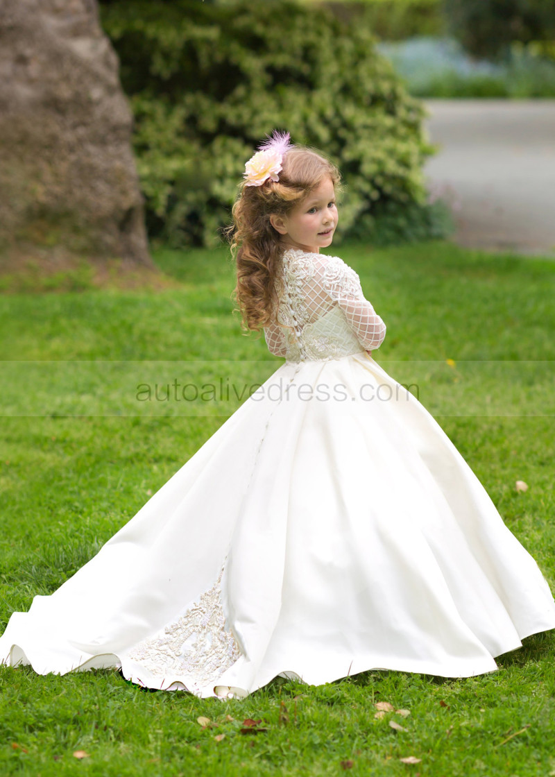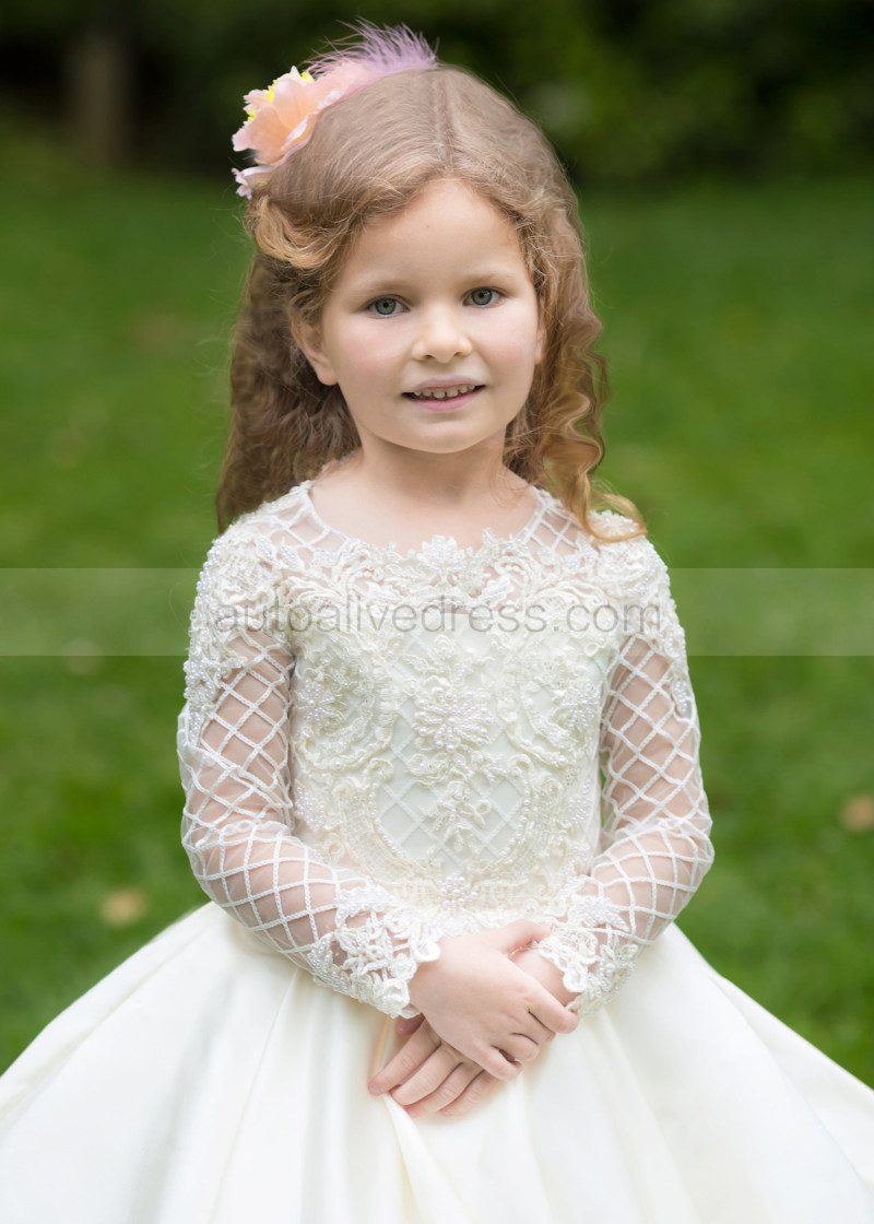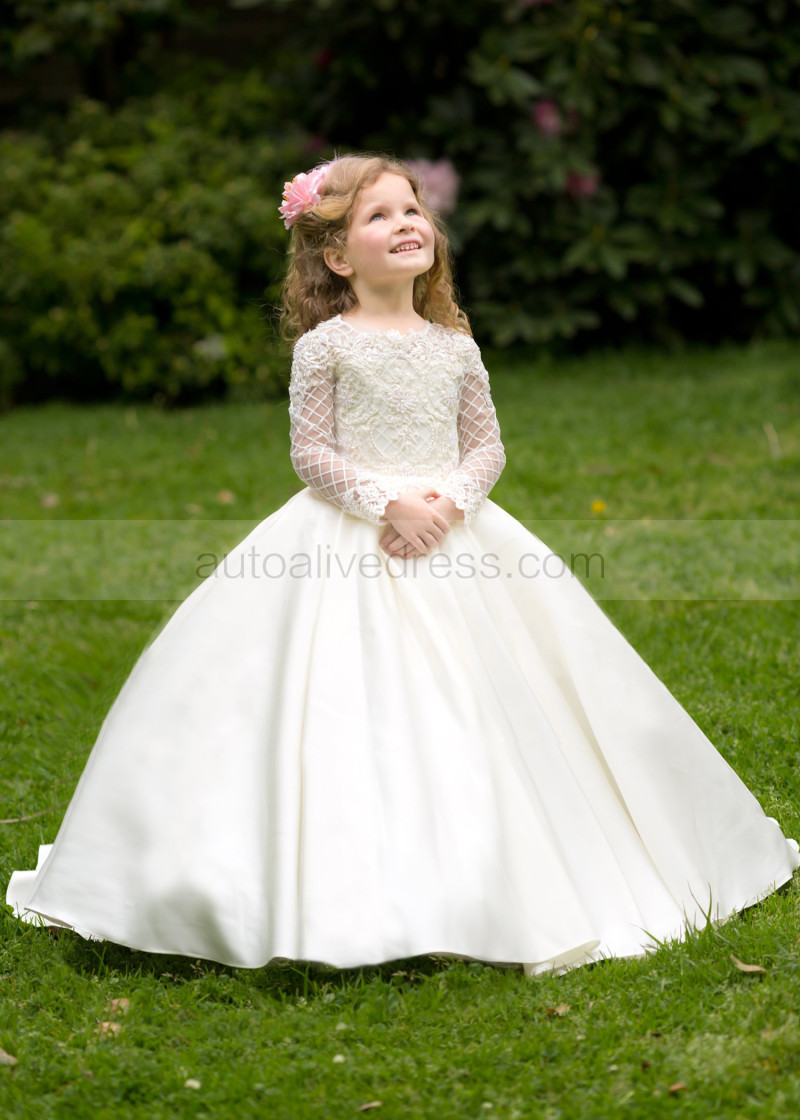Beaded Ivory Lattice Lace Satin Floor Length Wedding Flower Girl Dress