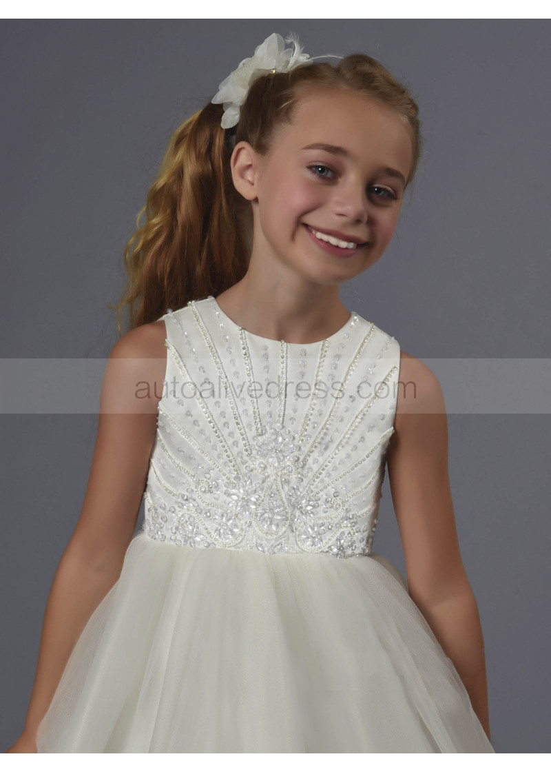Beaded Ivory Satin Tulle Floor Length Luxury Flower Girl Dress