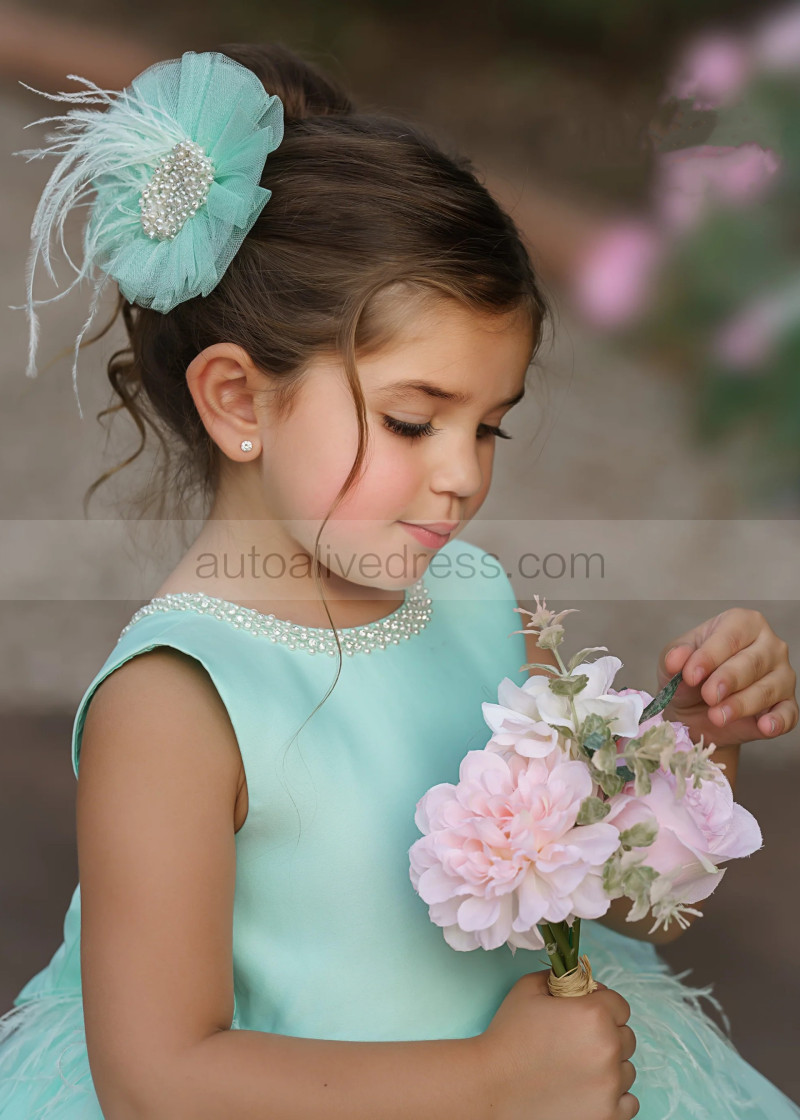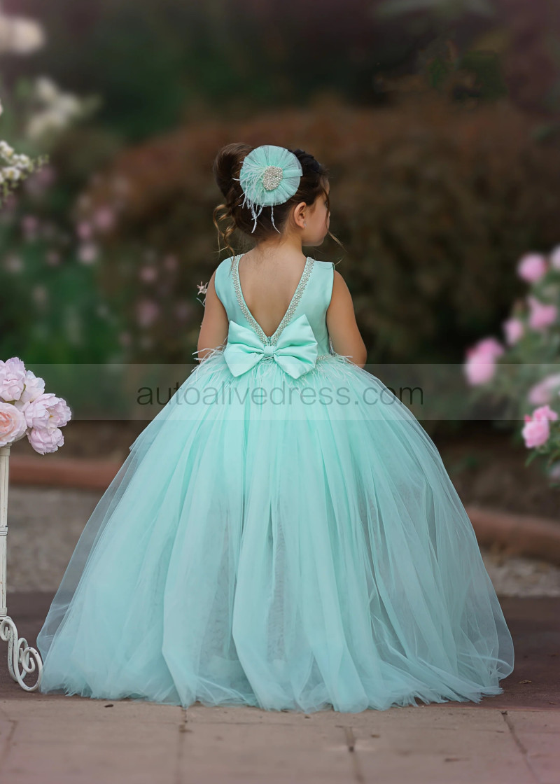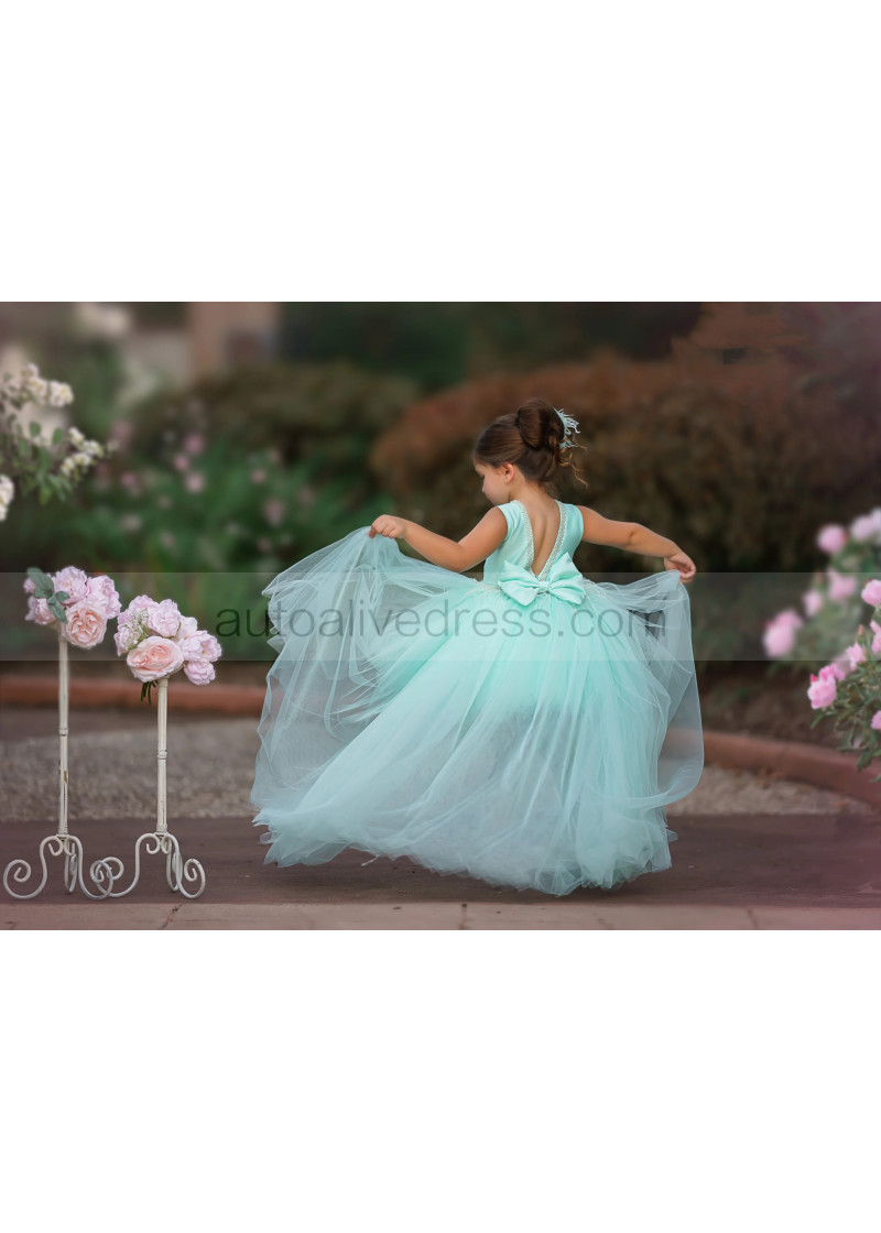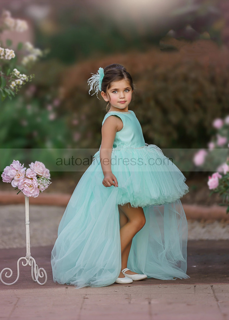 Beaded Mint Green Satin Tulle High Low Flower Girl Dress