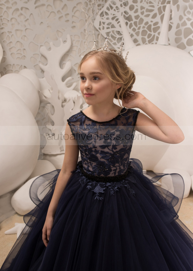 Beaded Navy Blue And Blush Lace Tulle V Back Flower Girl Dress