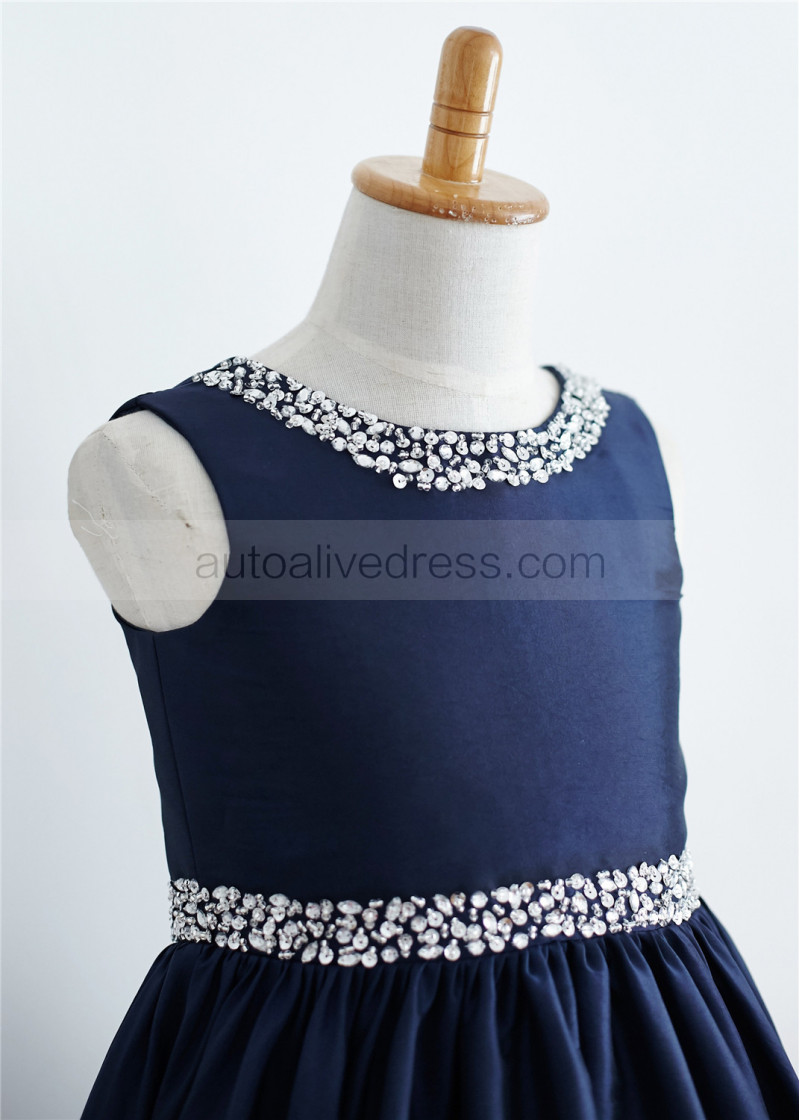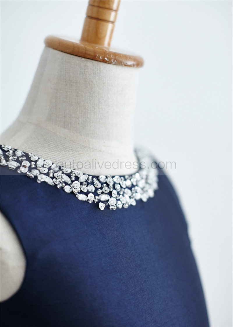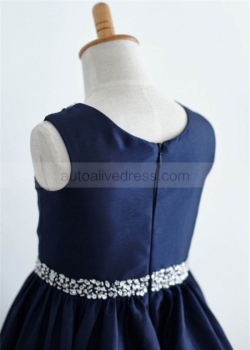 Beaded Navy Blue Taffeta Knee Length Flower Girl Dress