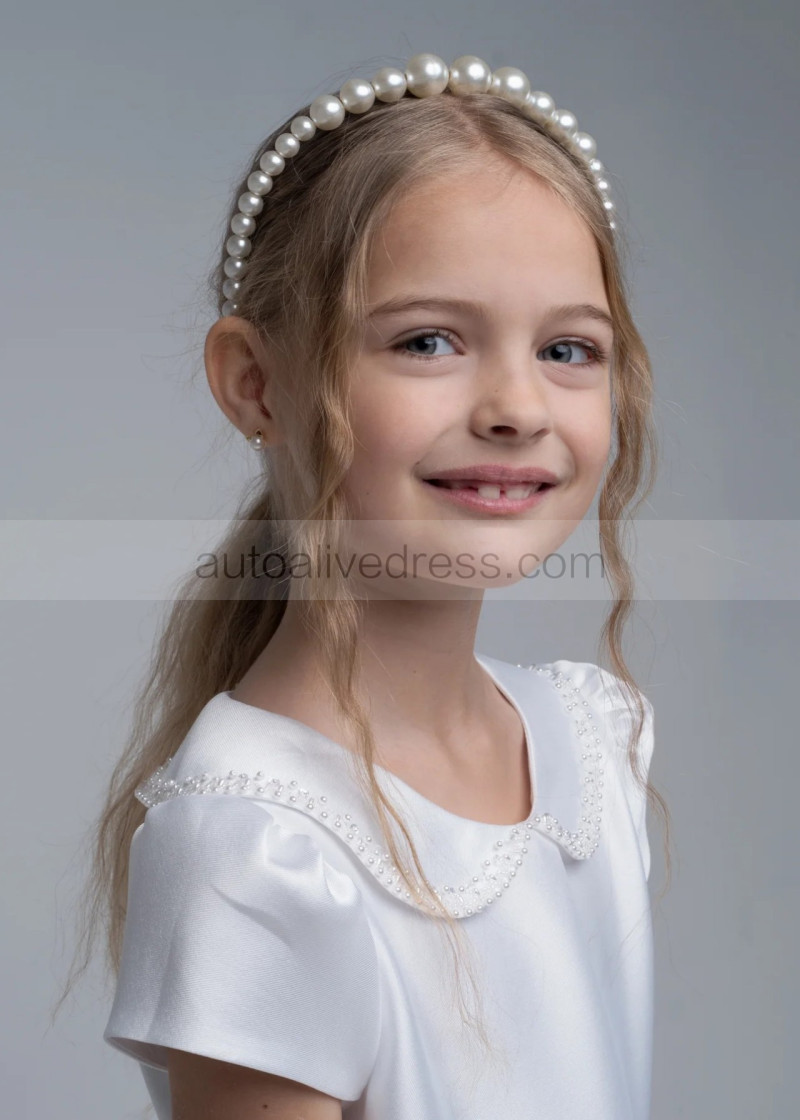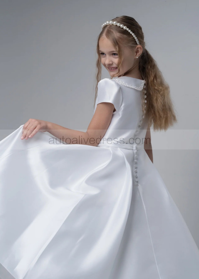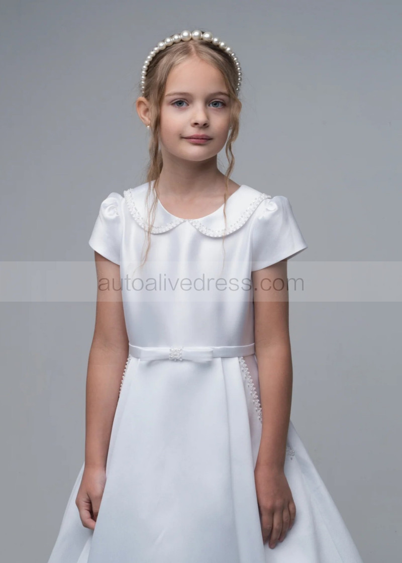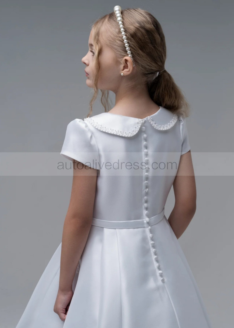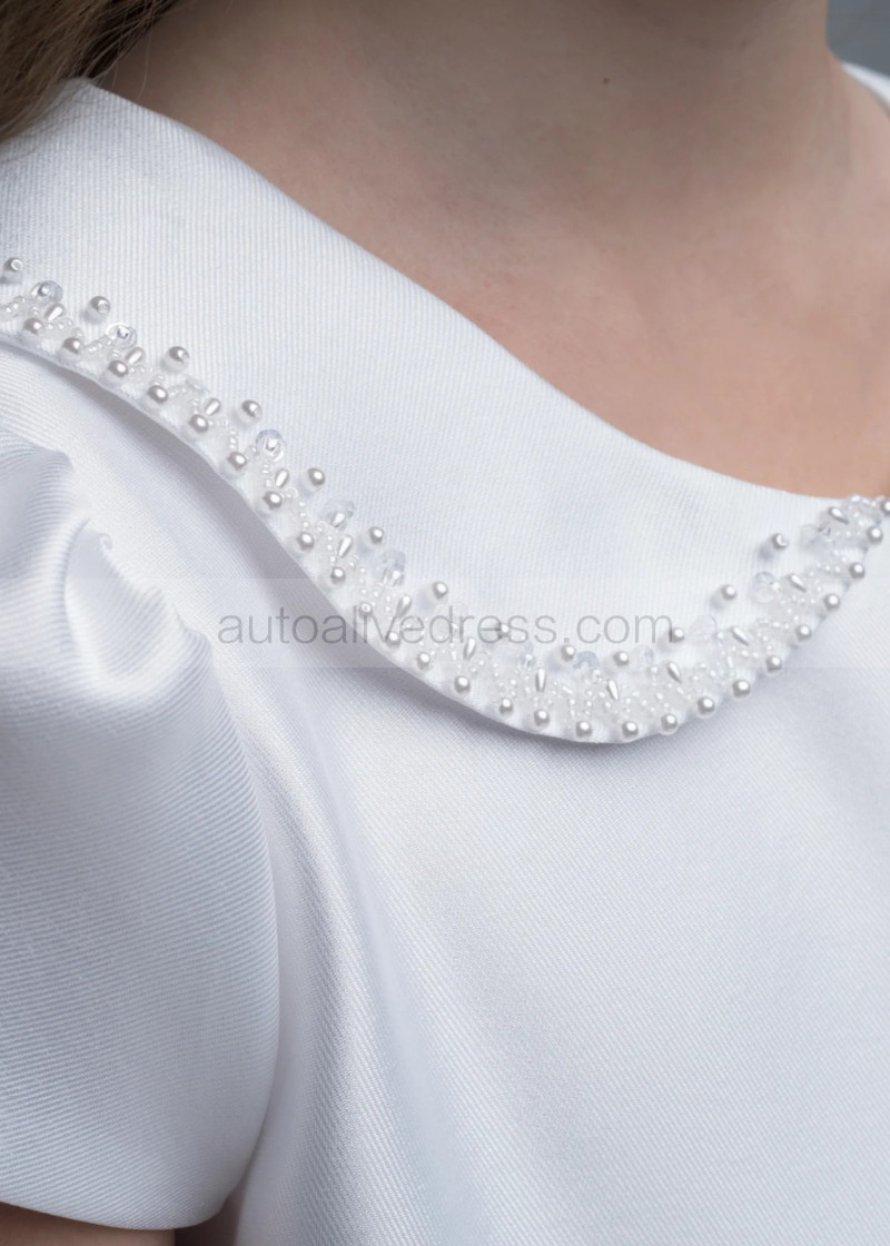 Beaded Peter Pan Collar White Satin Box Pleated Flower Girl Dress