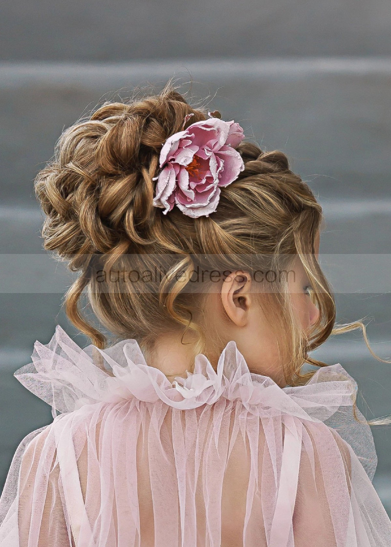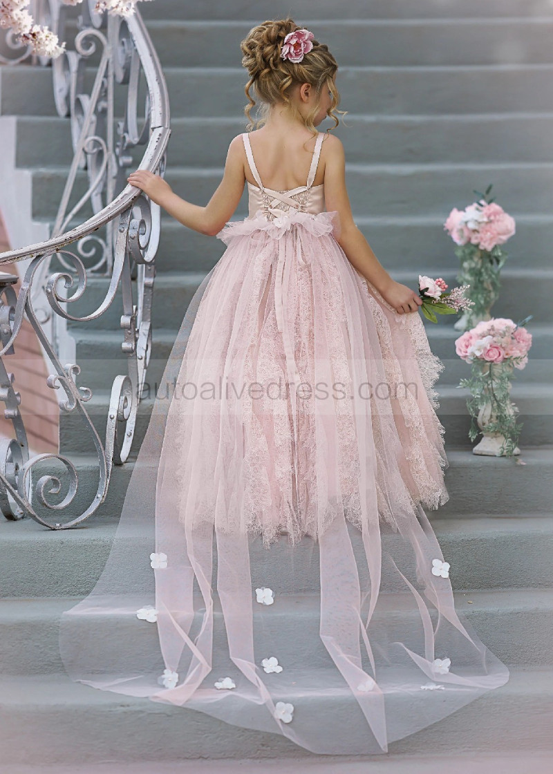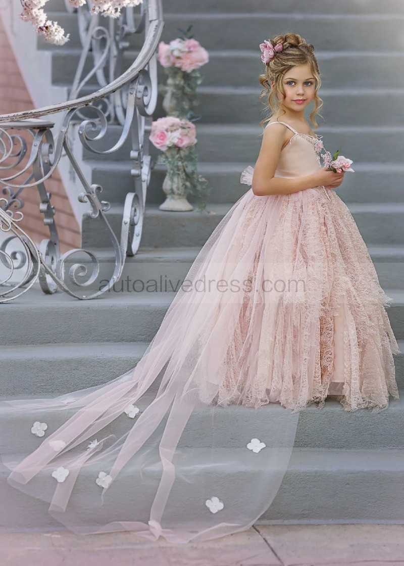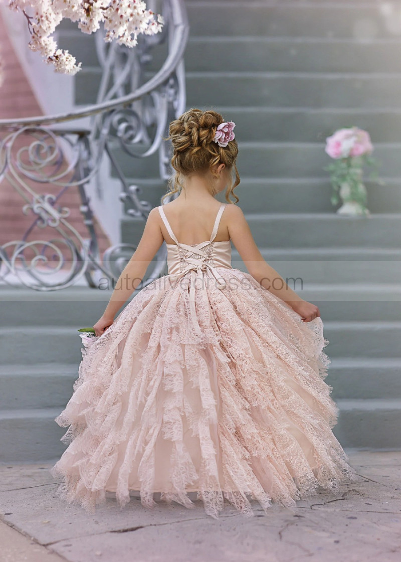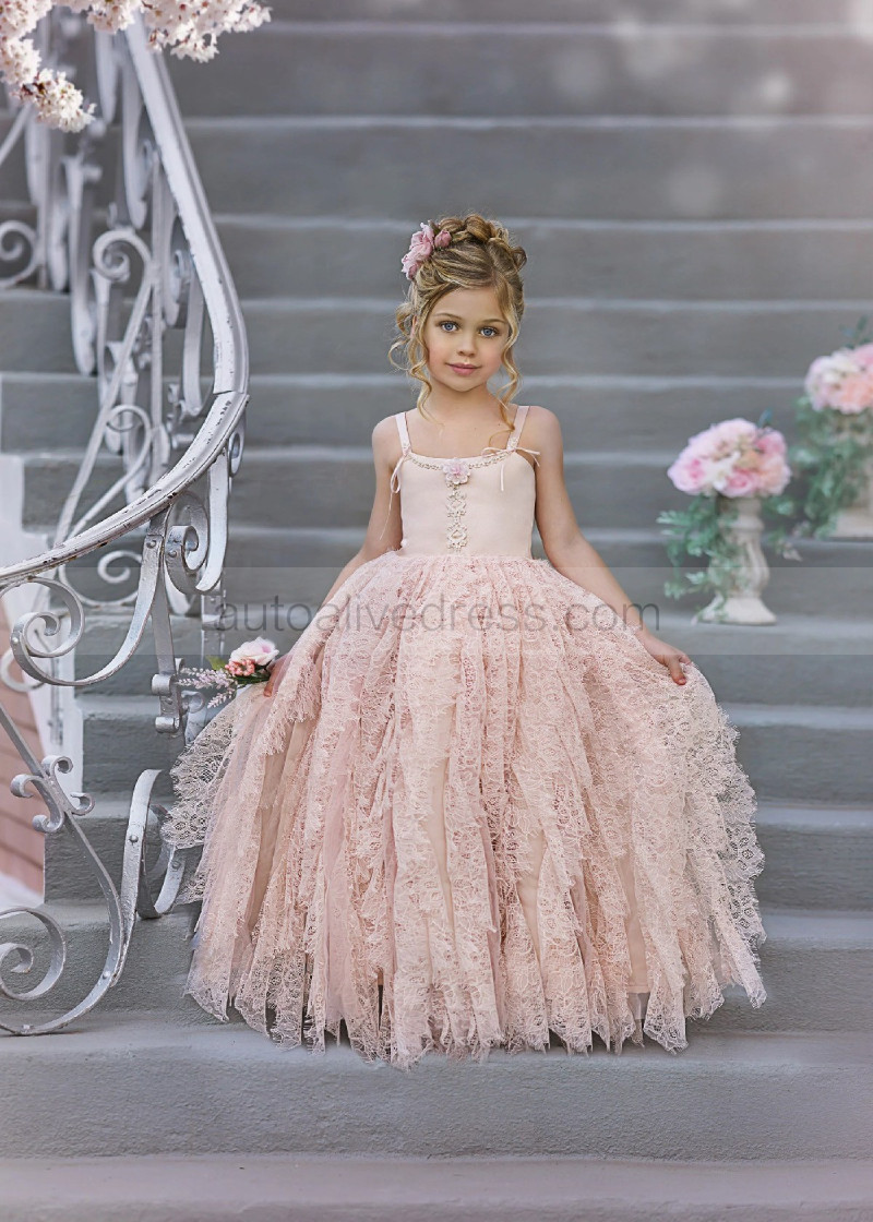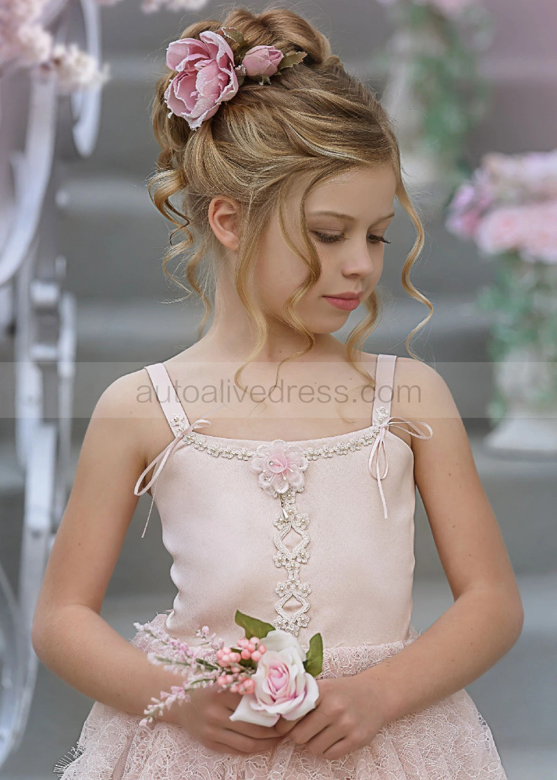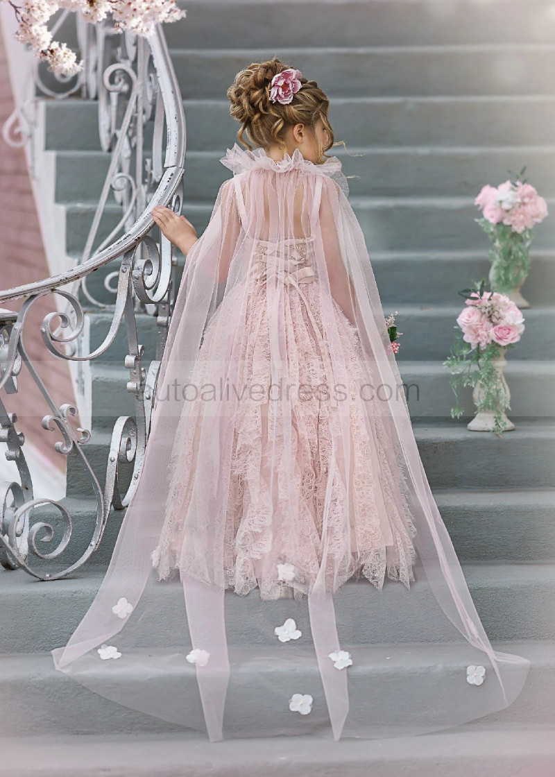 Beaded Pink Eyelash Lace Satin Flower Girl Dress With Cape