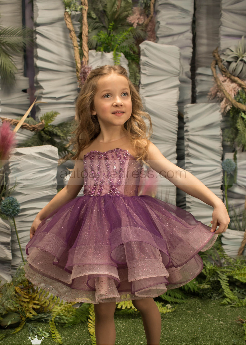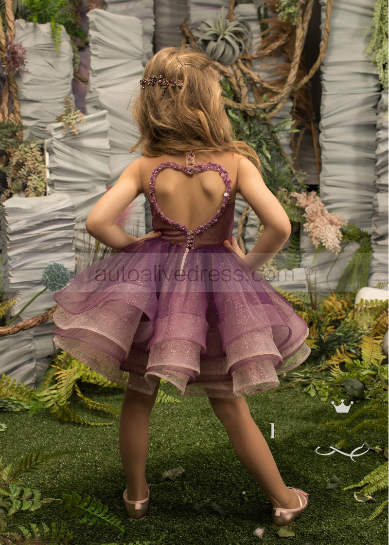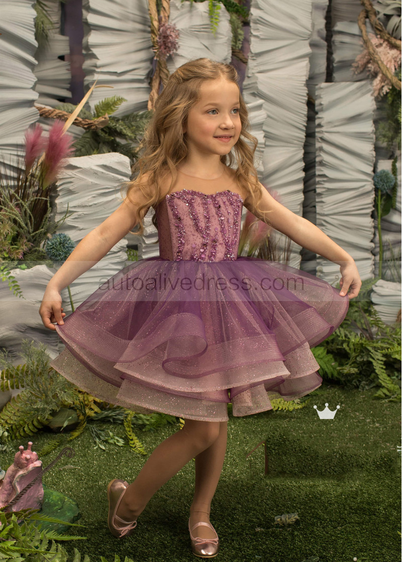 Beaded Purple Tulle Knee Length Heart Back Flower Girl Dress