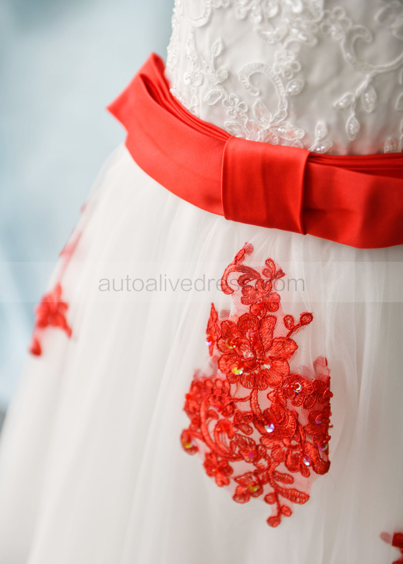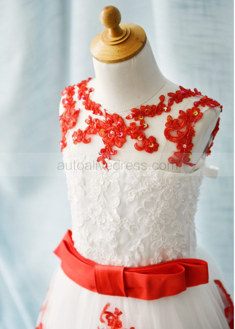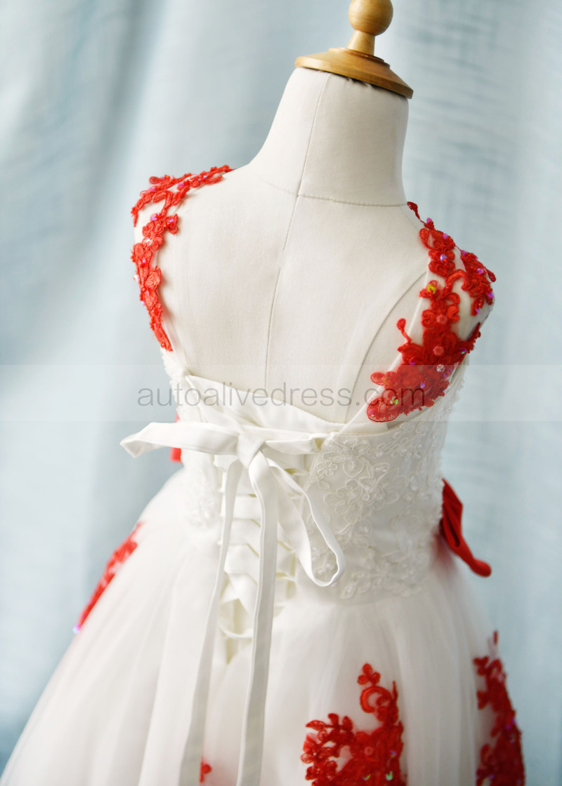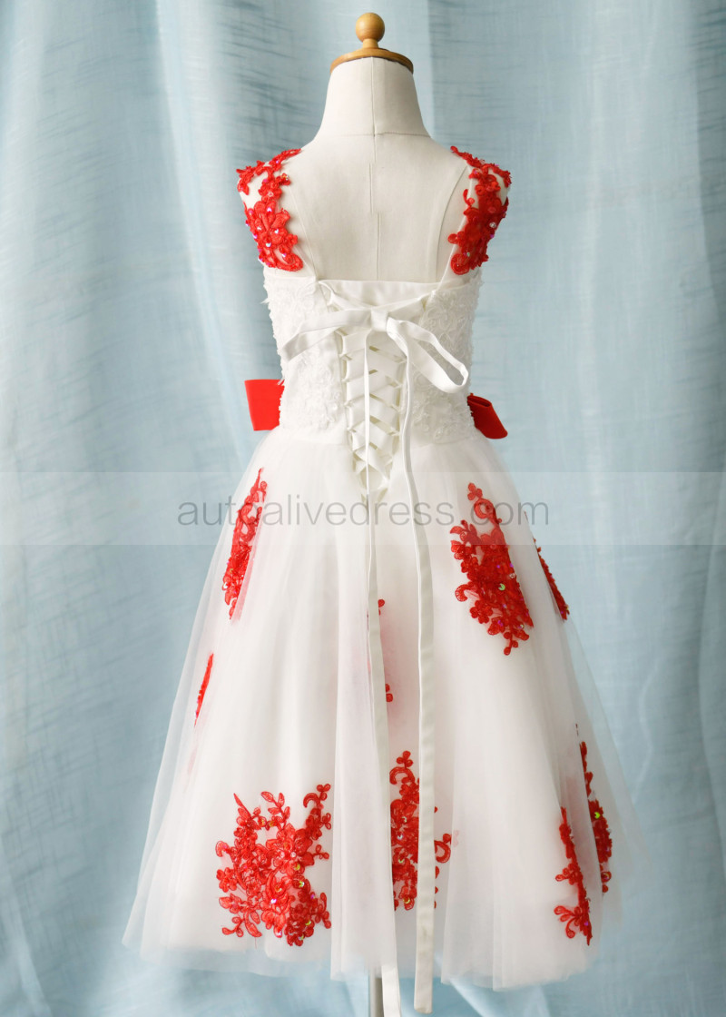 Beaded Red Lace Tulle Corset Back Knee Length Flower Girl Dress