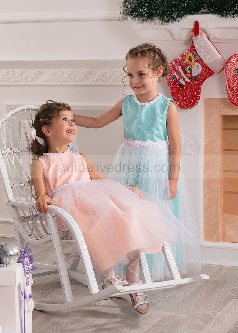 Beaded Satin Polka Dots Tulle Tea Length Flower Girl Dress