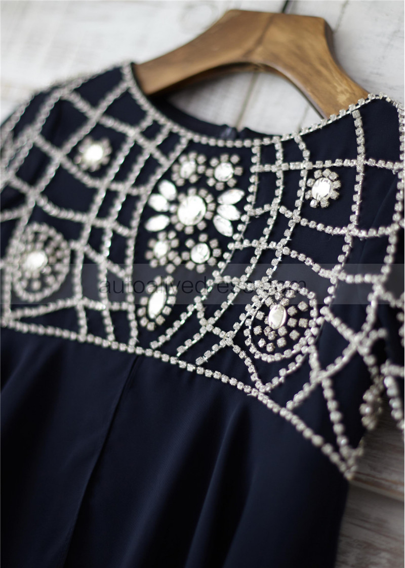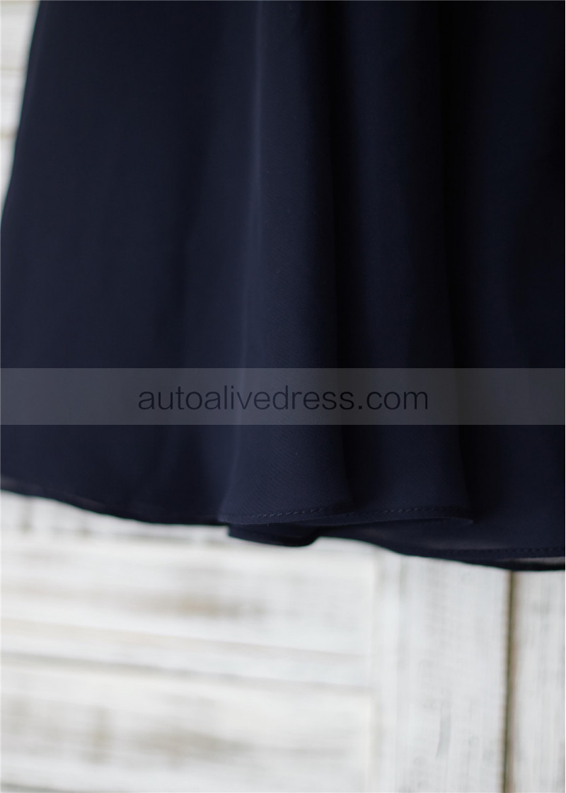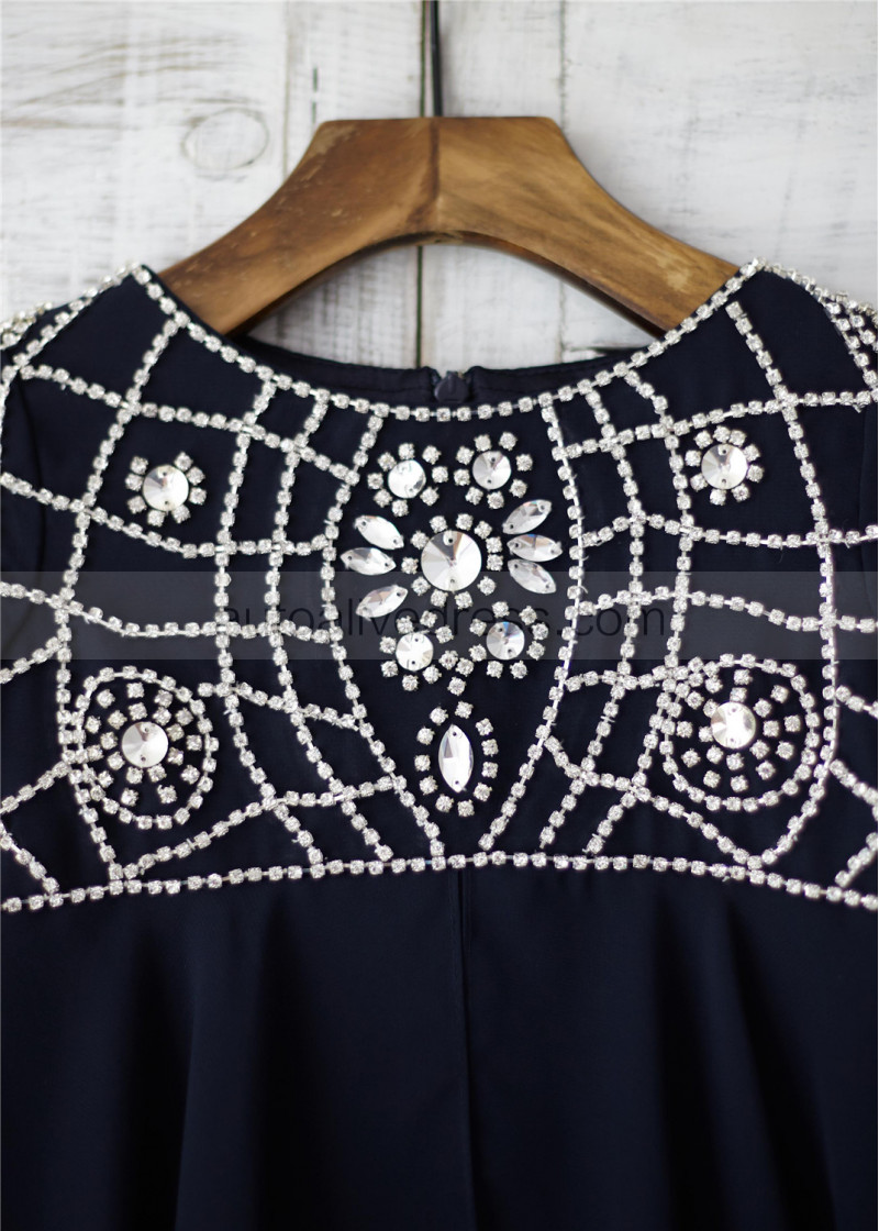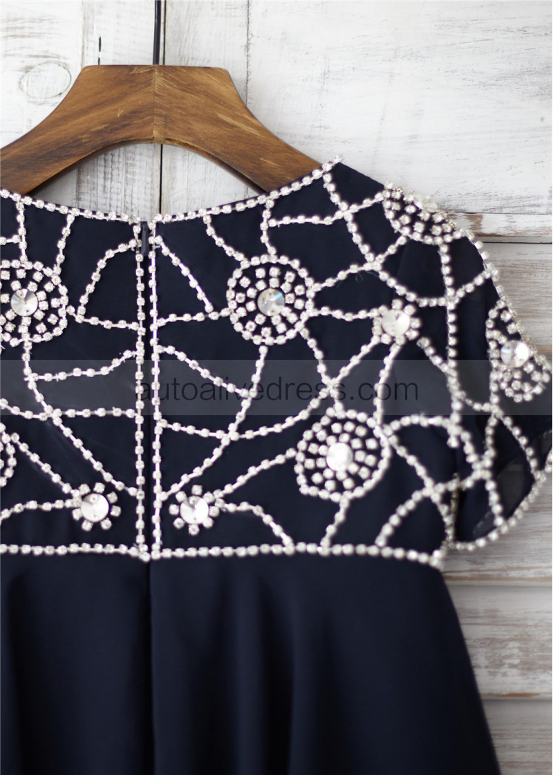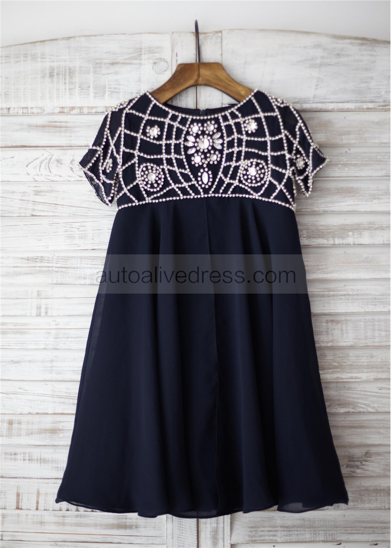 Beaded Short Sleeves Navy Blue Chiffon Knee Length Flower Girl Dress