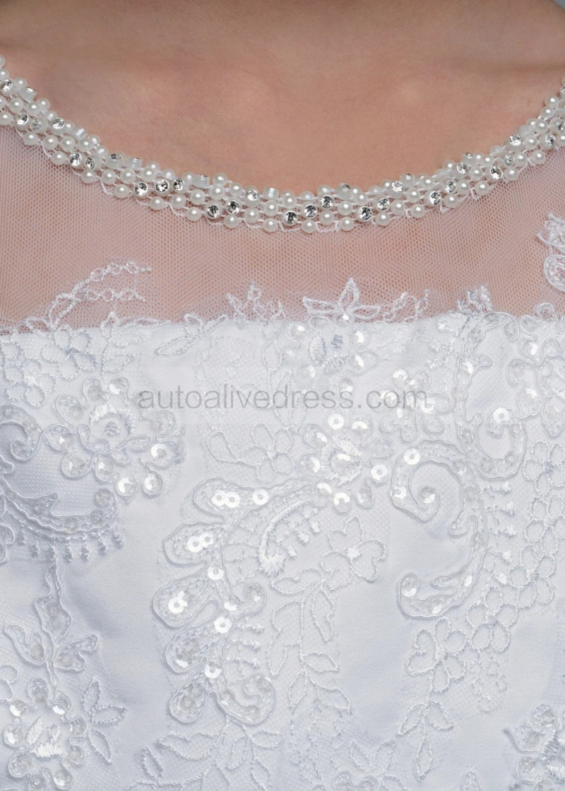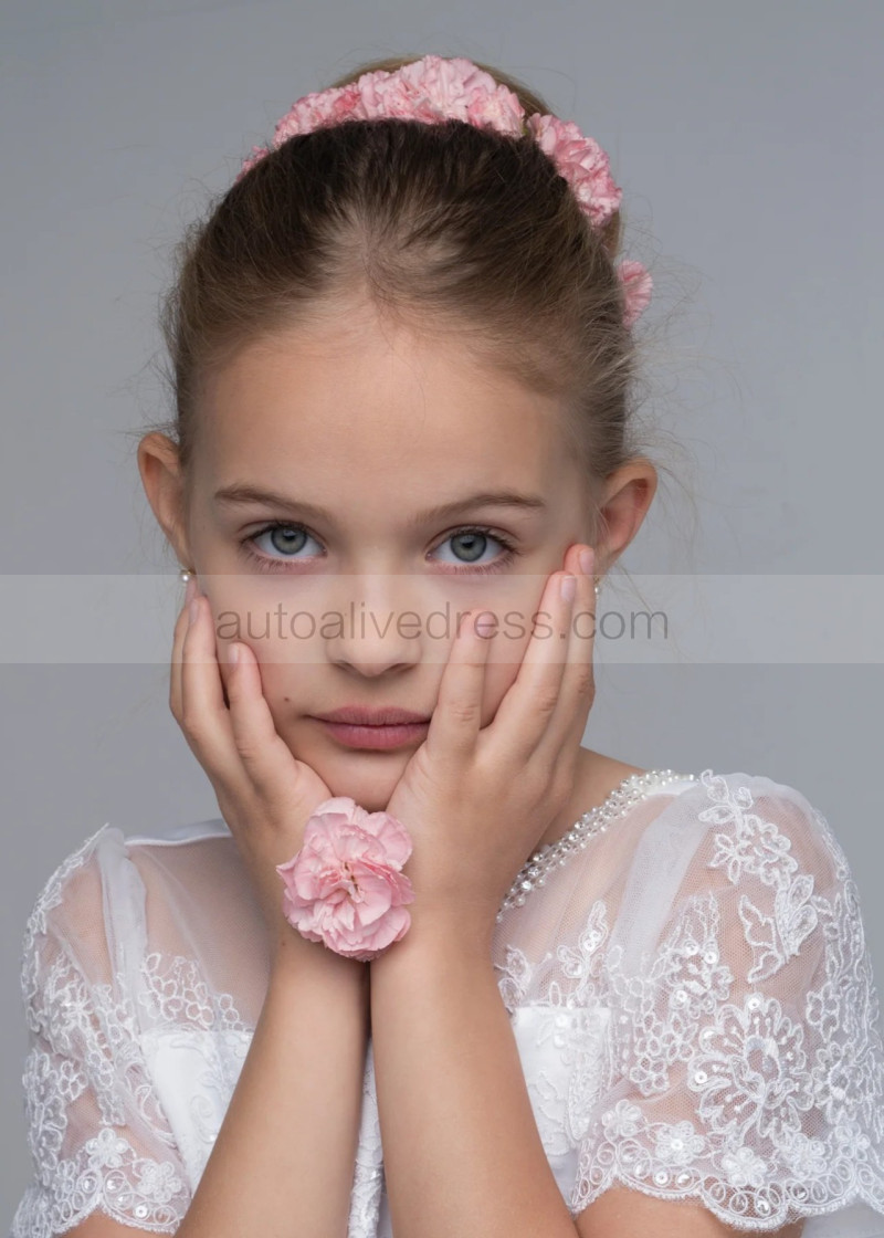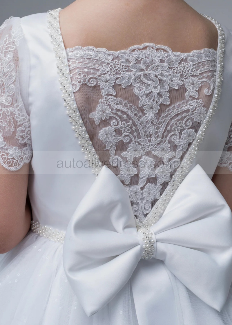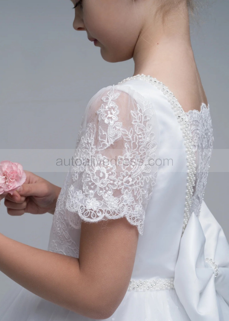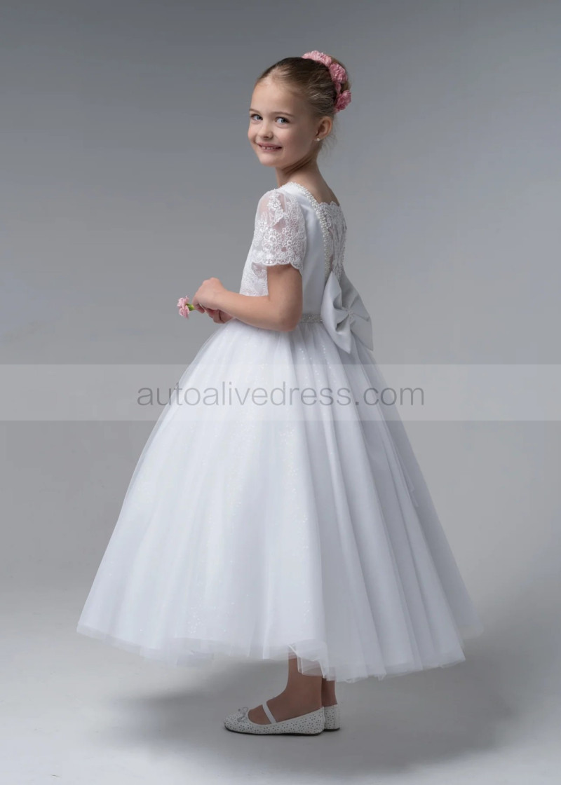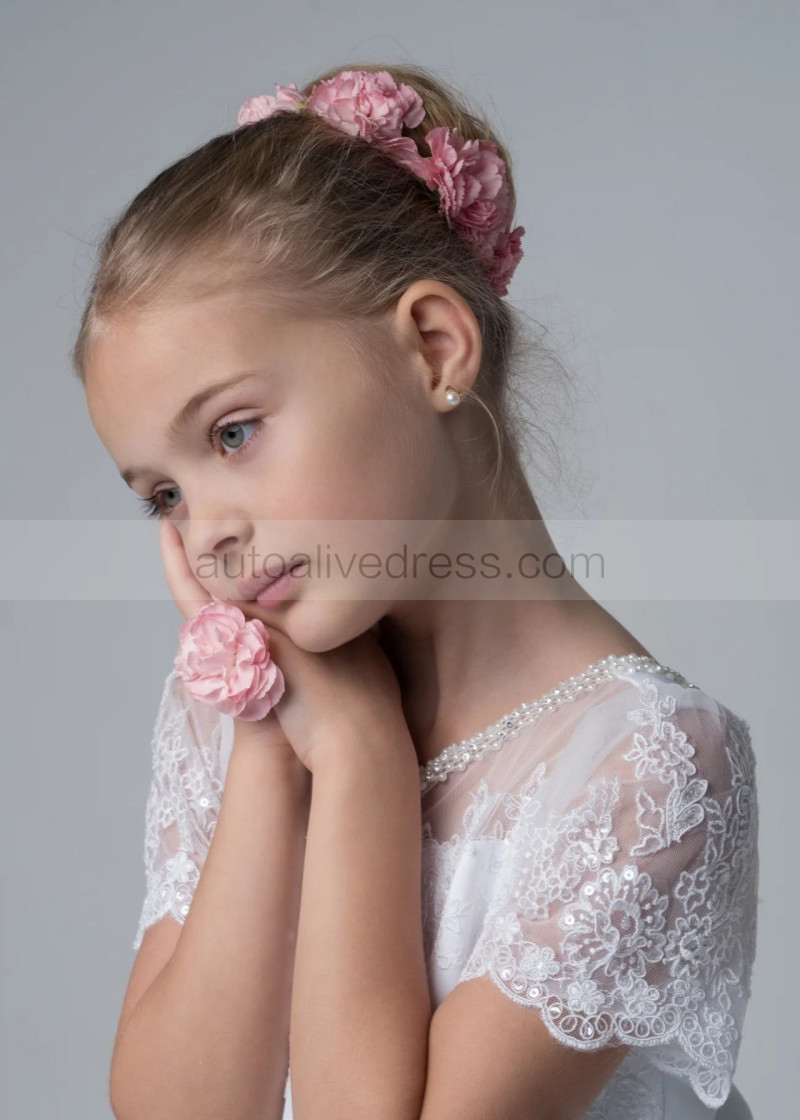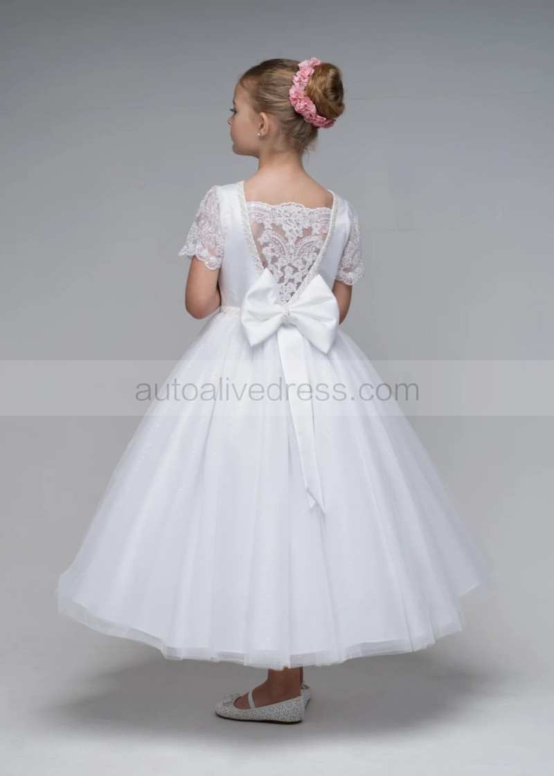 Beaded Short Sleeves White Lace Glitter Tulle Flower Girl Dress