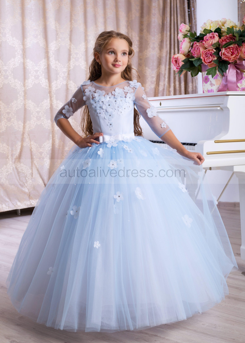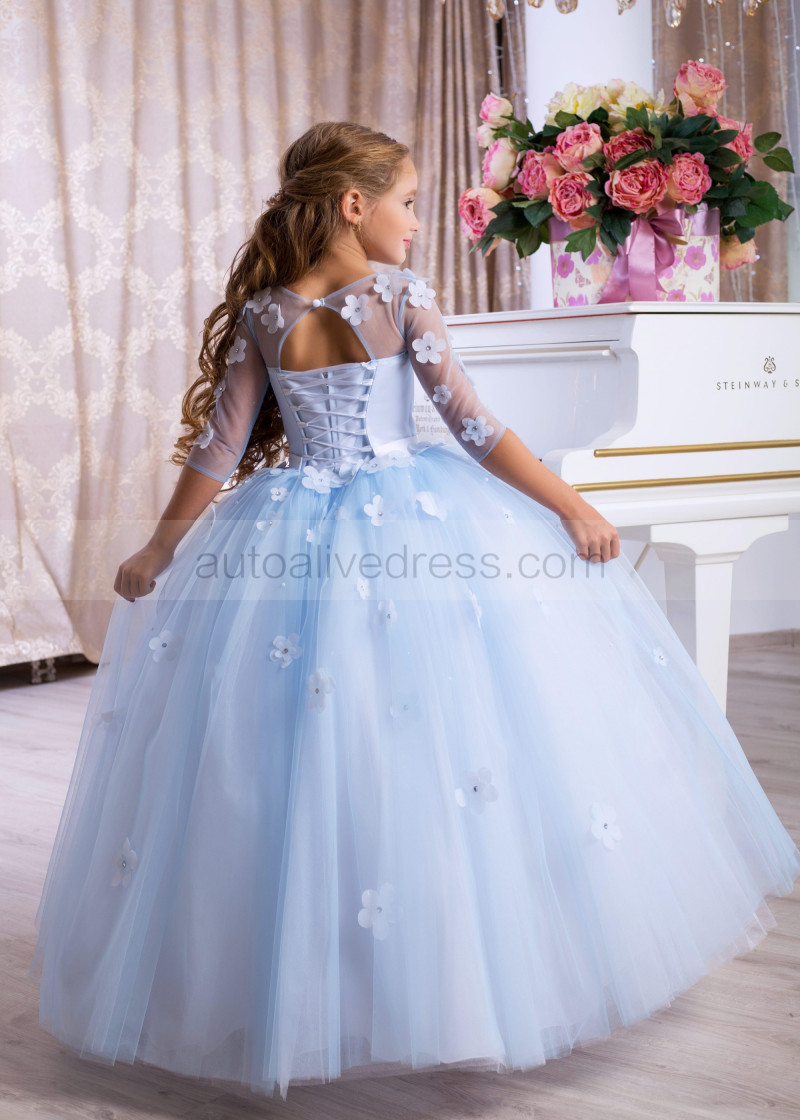 Beaded Sky Blue Tulle 3D Flowers Keyhole Back Fairytale Flower Girl Dress