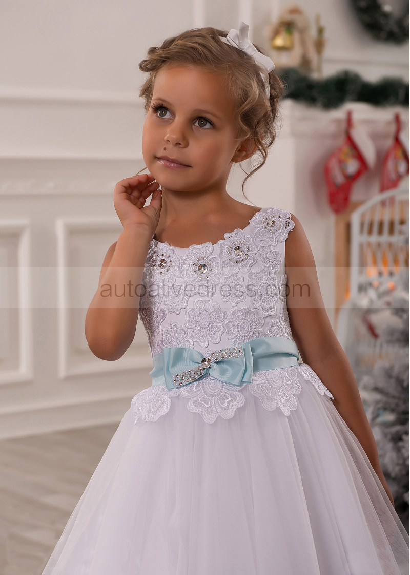 Beaded White Floral Lace Tulle Flower Girl Dress