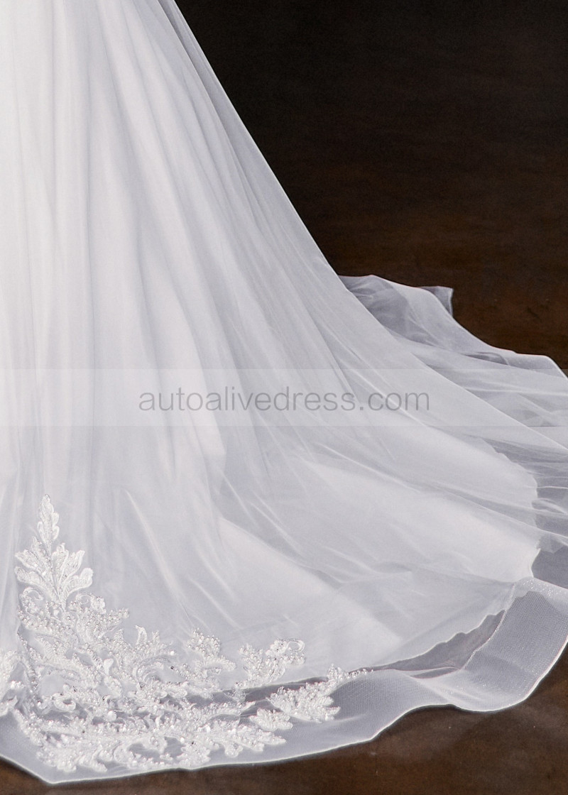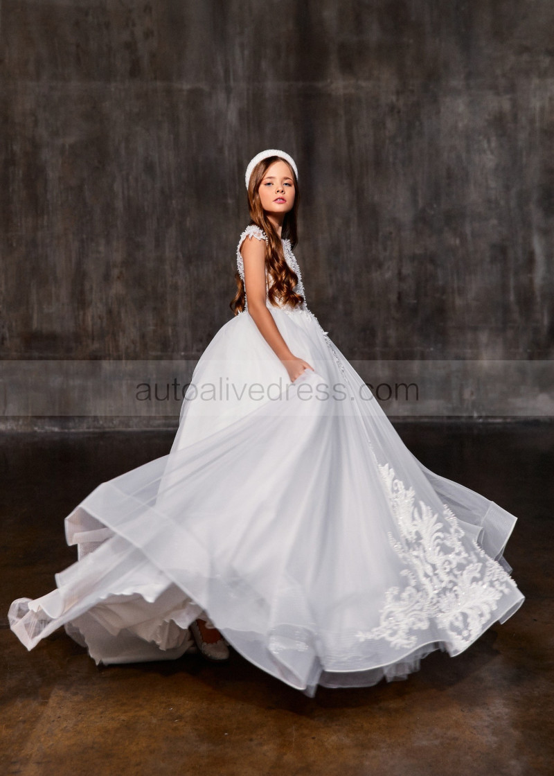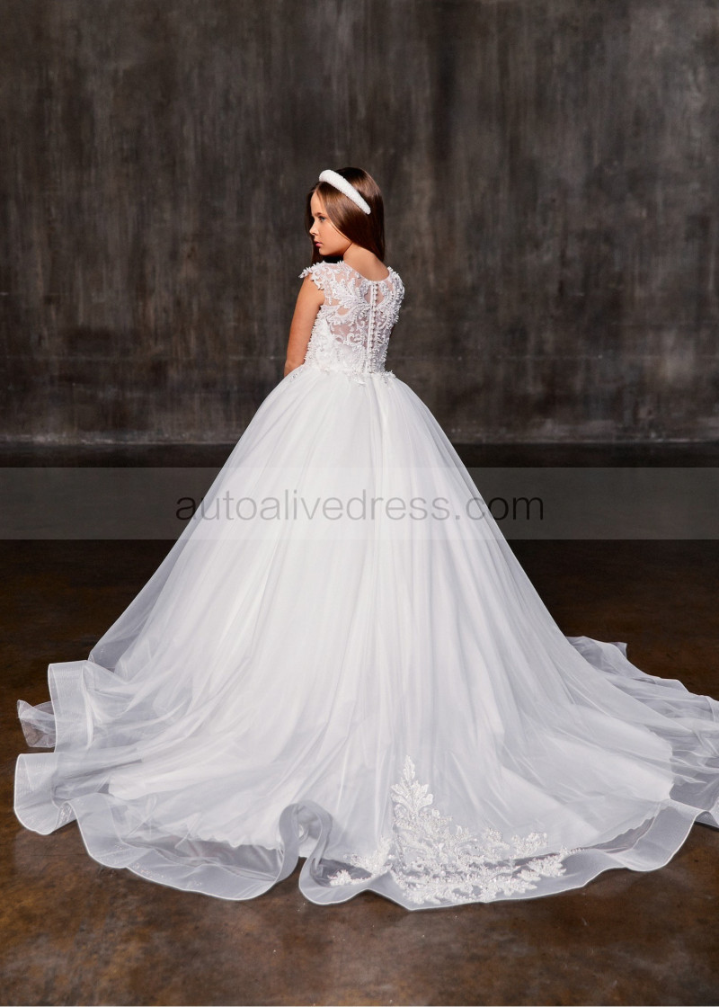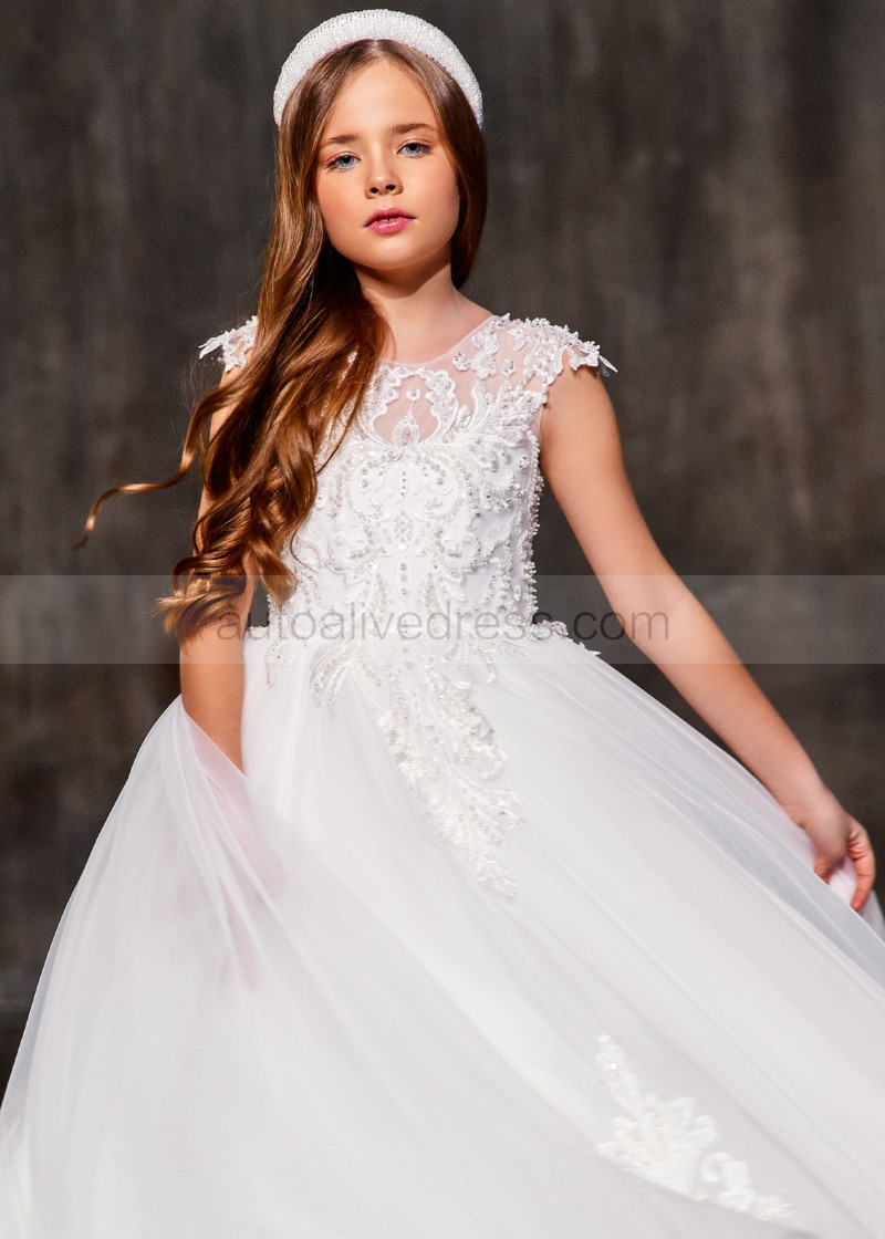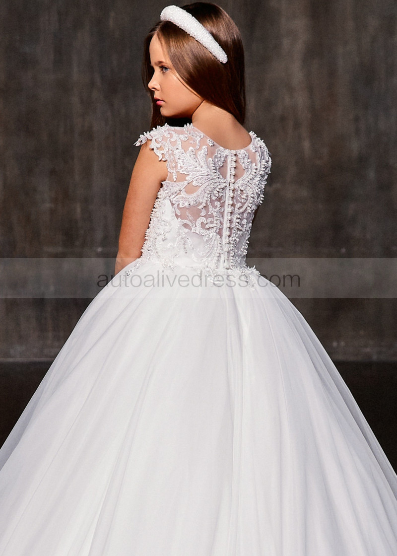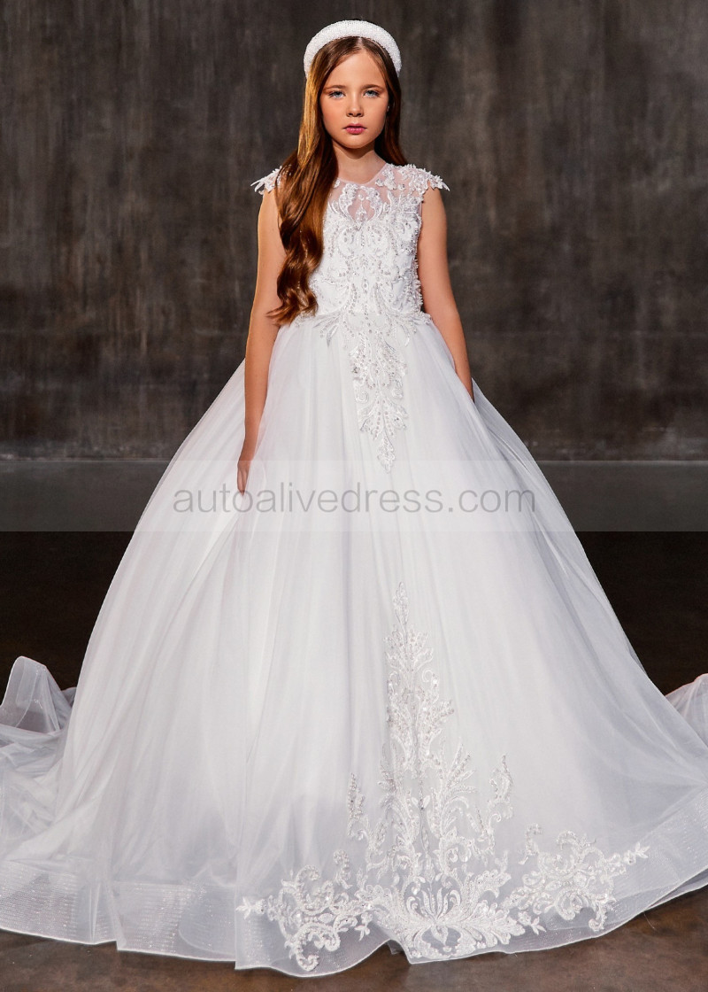 Beaded White Lace Organza Sparkly Flower Girl Dress With Horsehair Trim
