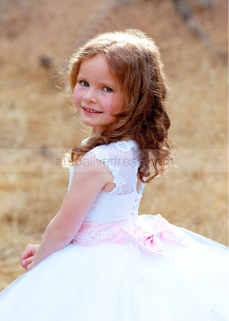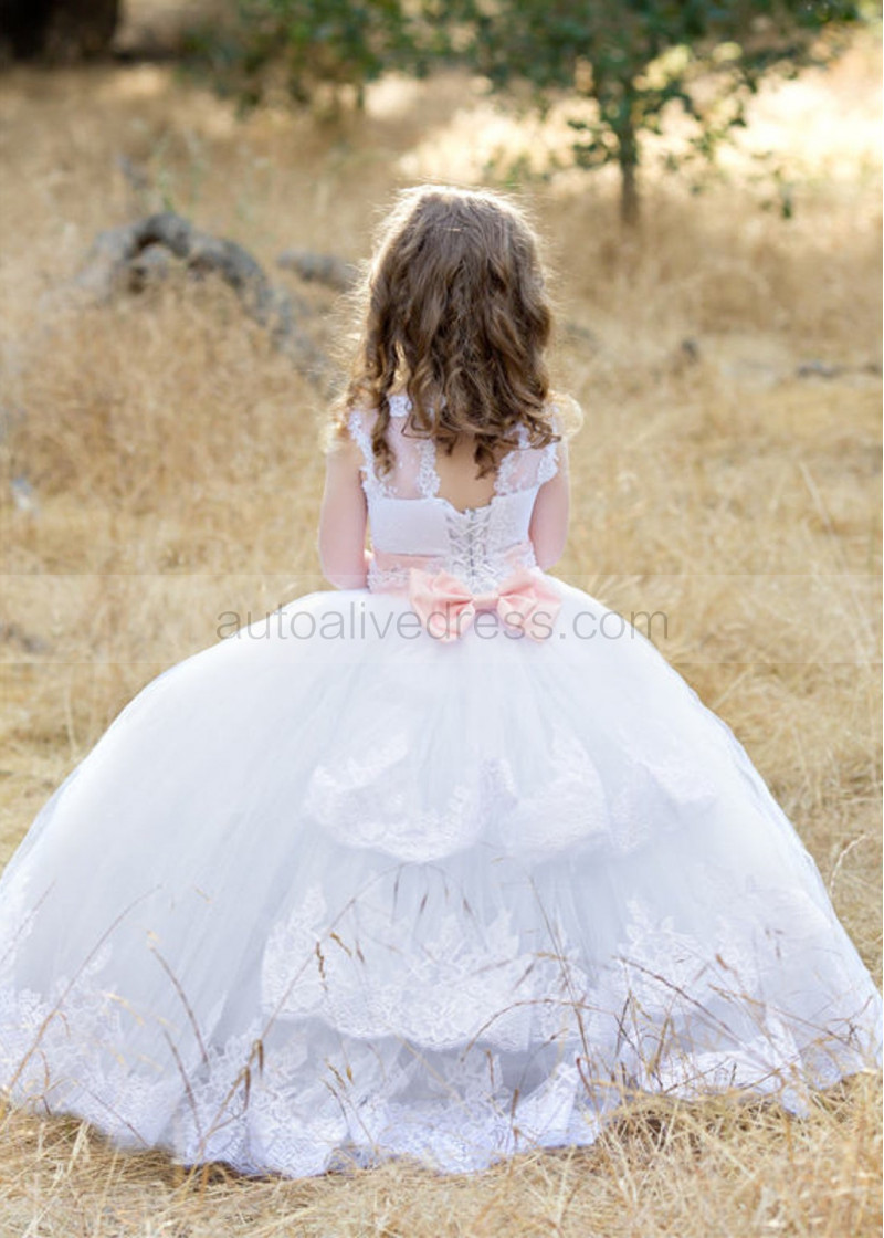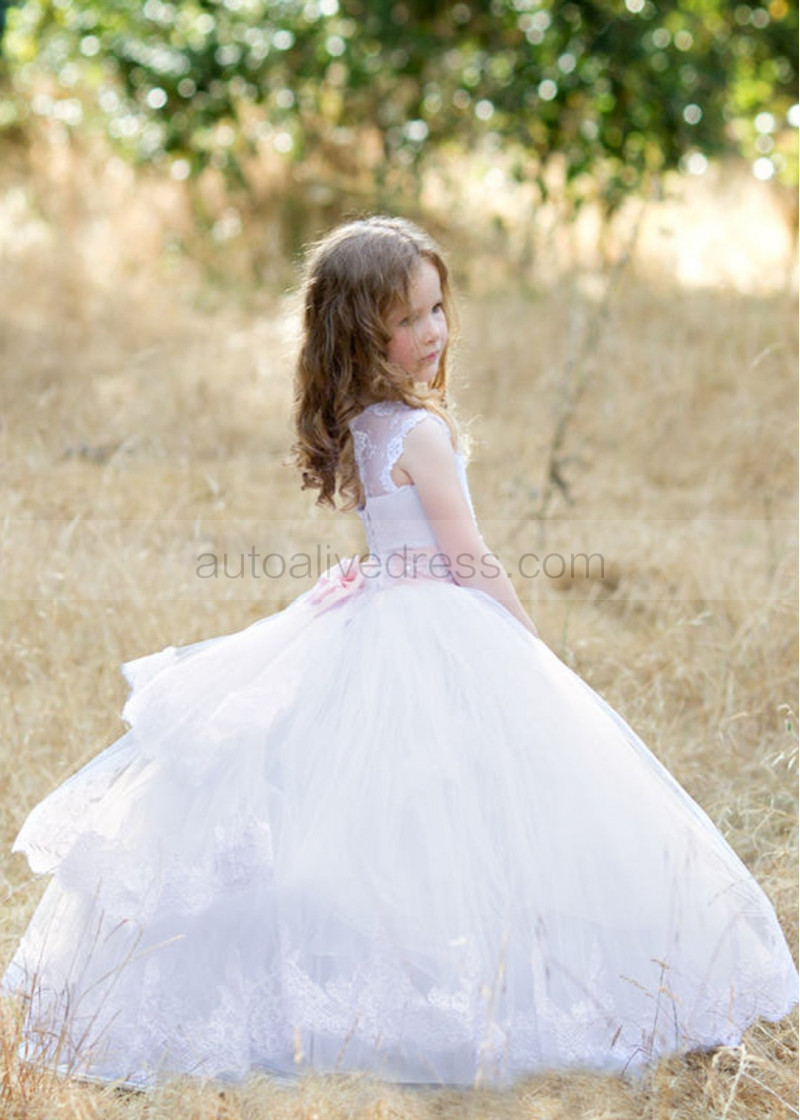 Beaded White Lace Tulle Corset Back Flower Girl Dress