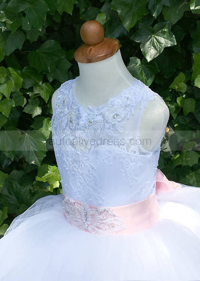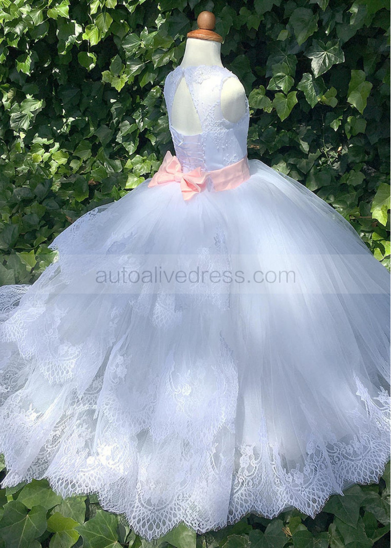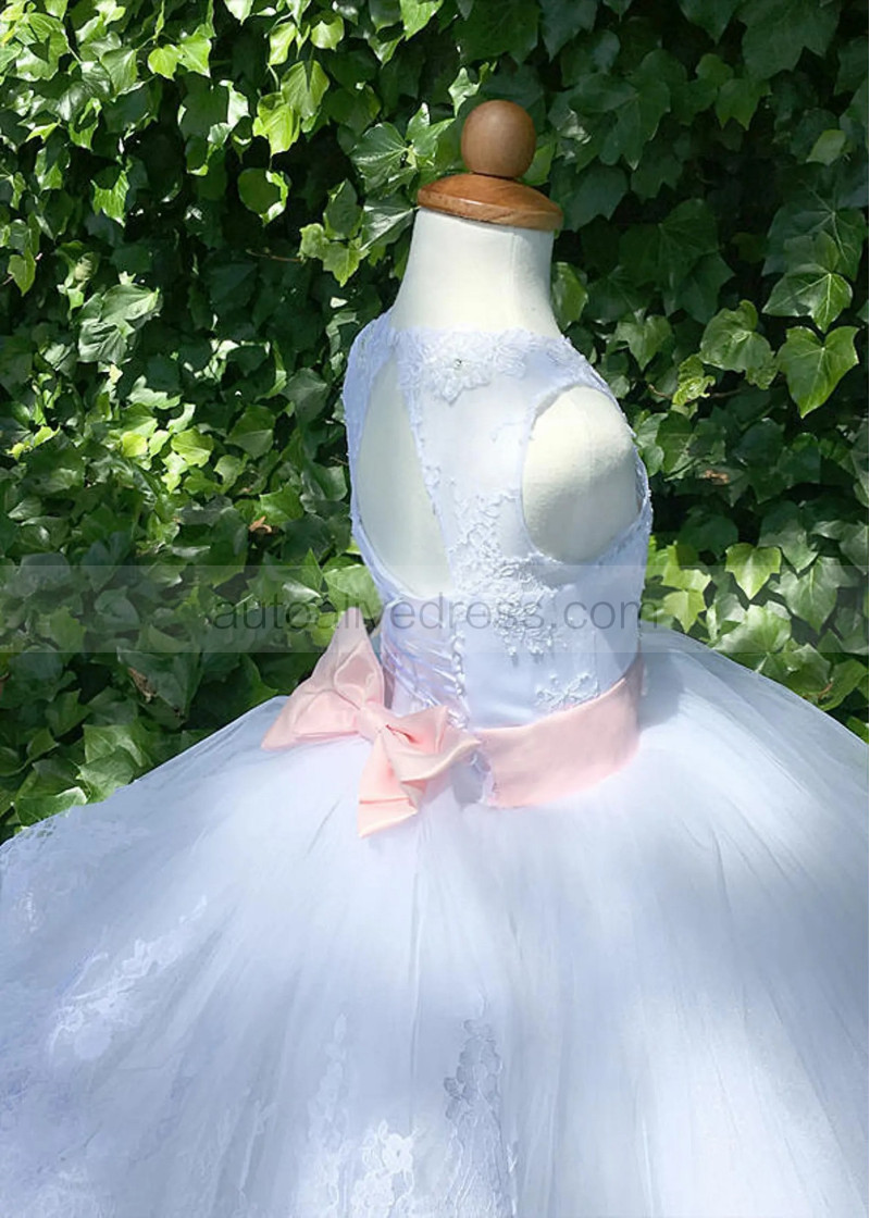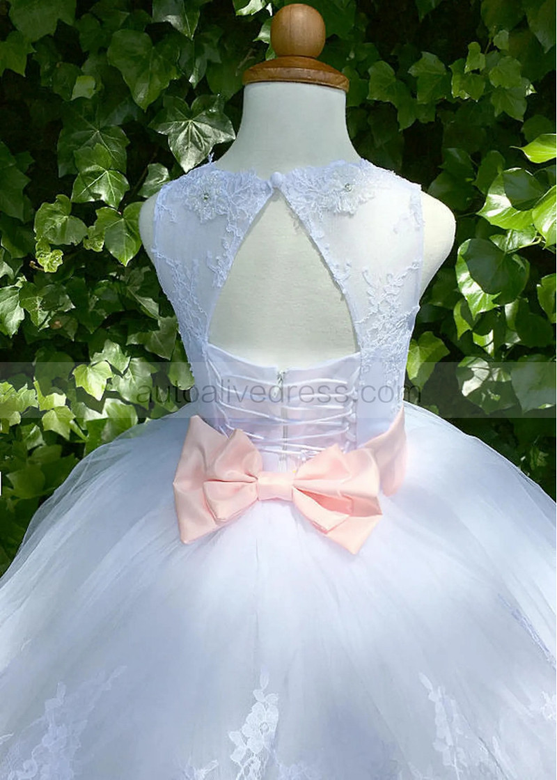 Beaded White Lace Tulle Keyhole Back Romantic Flower Girl Dress